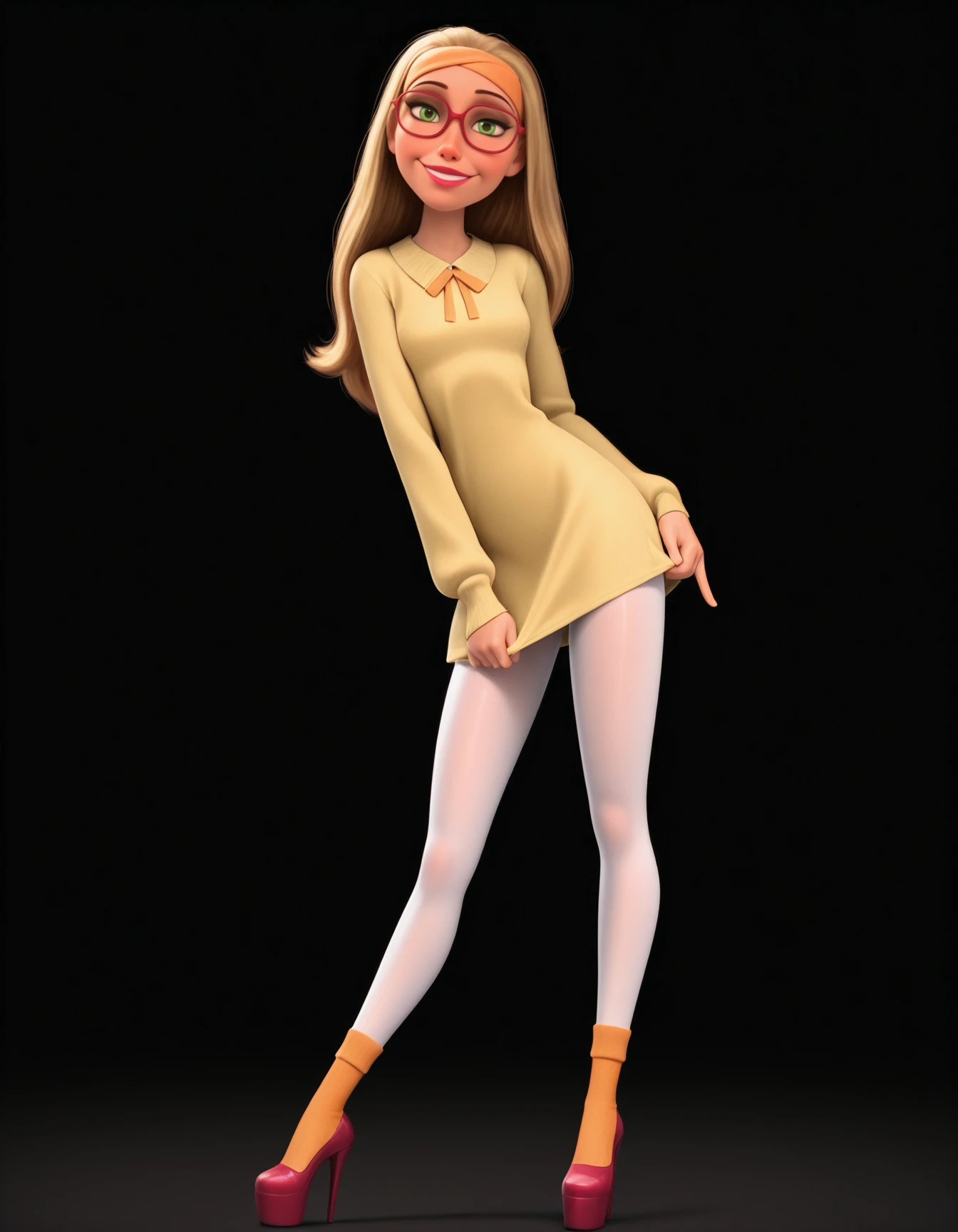 glasses, headband, yellow dress, white pantyhose, orange socks, high heels