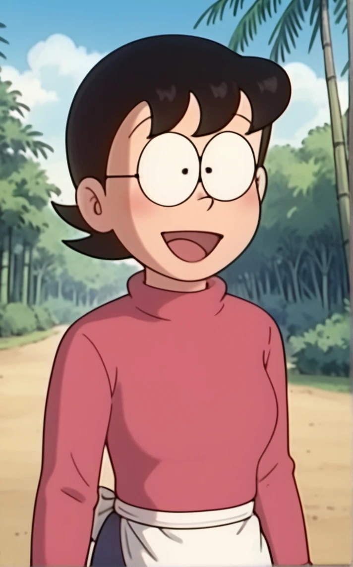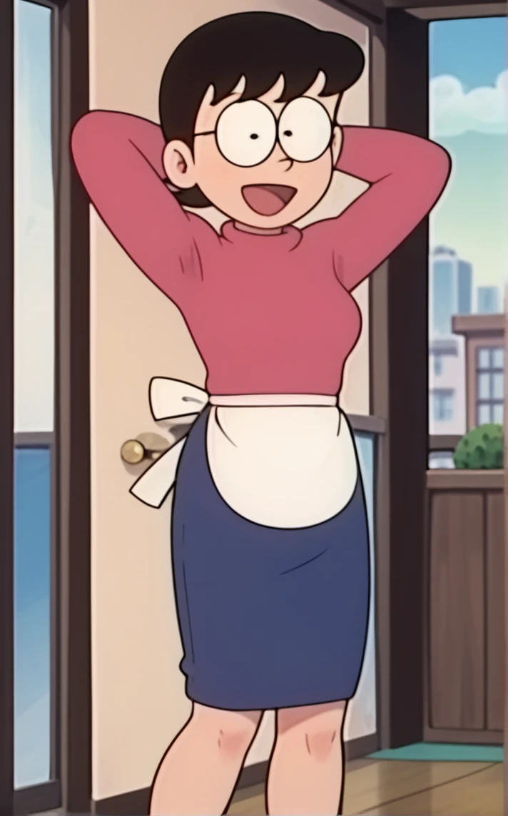 MAINPinkDress_TamakoNobi_ownwaifu, 1girl, black eyes, black hair, breasts, glasses, short hair, turtleneck, long sleeves, sweater, waist apron, pink sweater, round eyewear, white apron, opaque glasses, blue skirt, turtleneck sweater, mature female, pencil skirt, constricted pupils, medium skirt,