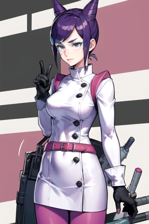AuraBlackquill, 1girl, solo, short hair, black gloves, purple hair, pink pantyhose, belt, cone hair bun, white uniform, double bun