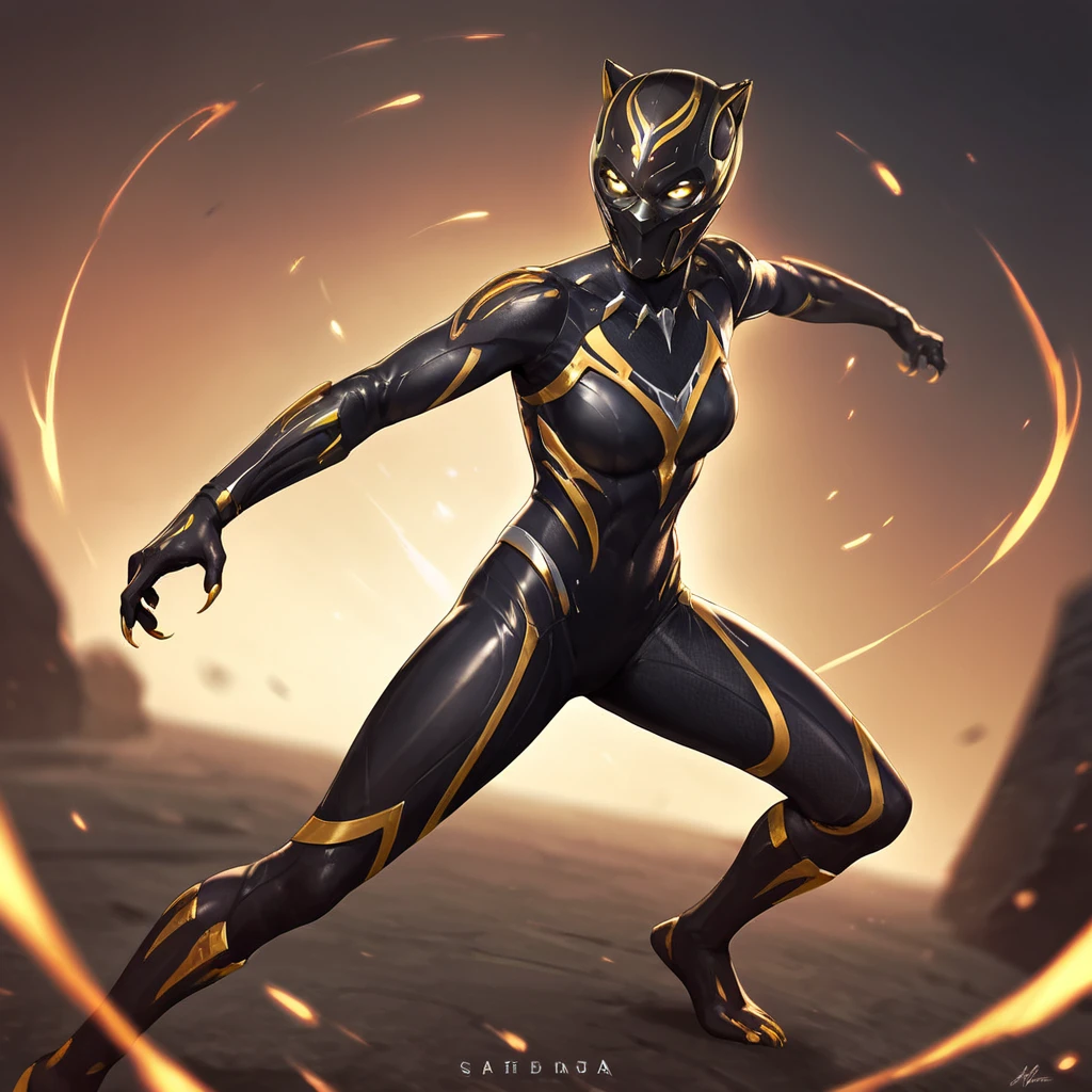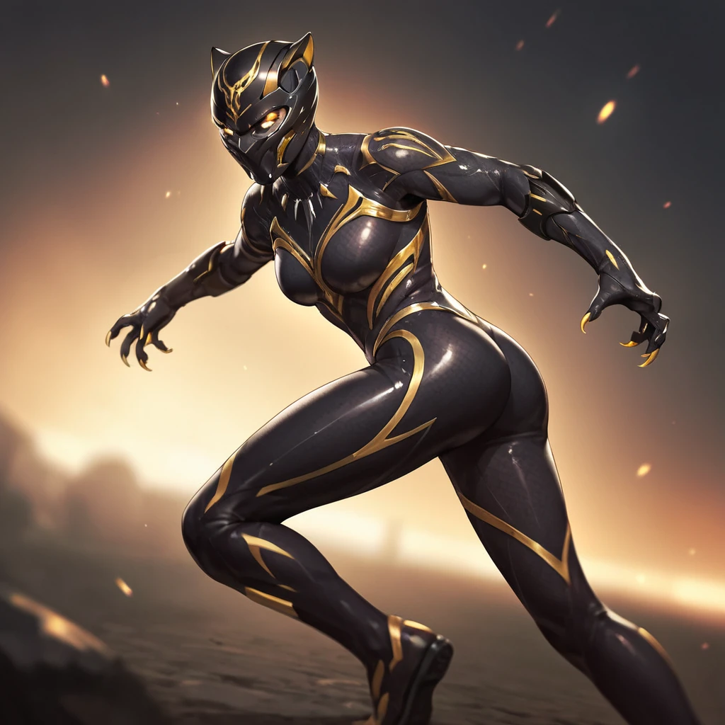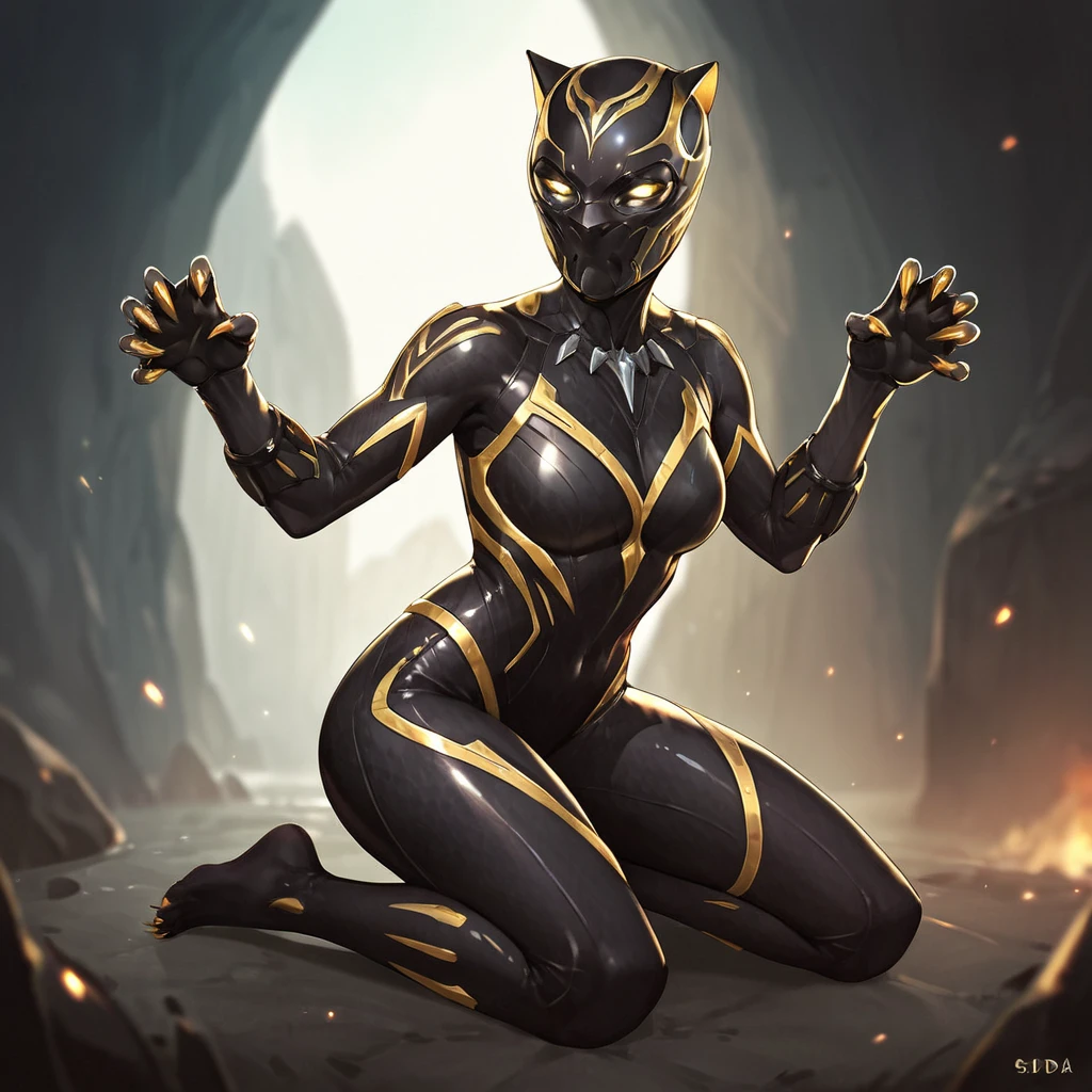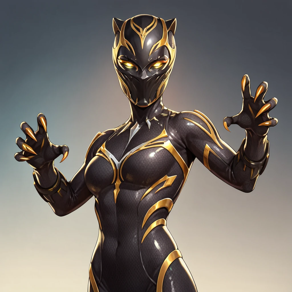 BP_shuri, black bodysuit, yellow eyes, glowing eyes, skin tight, claws, helmet,
