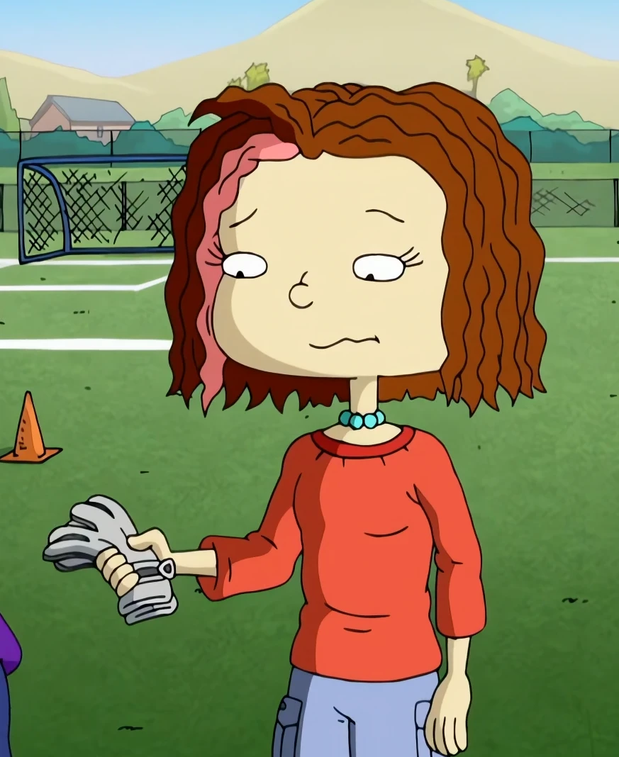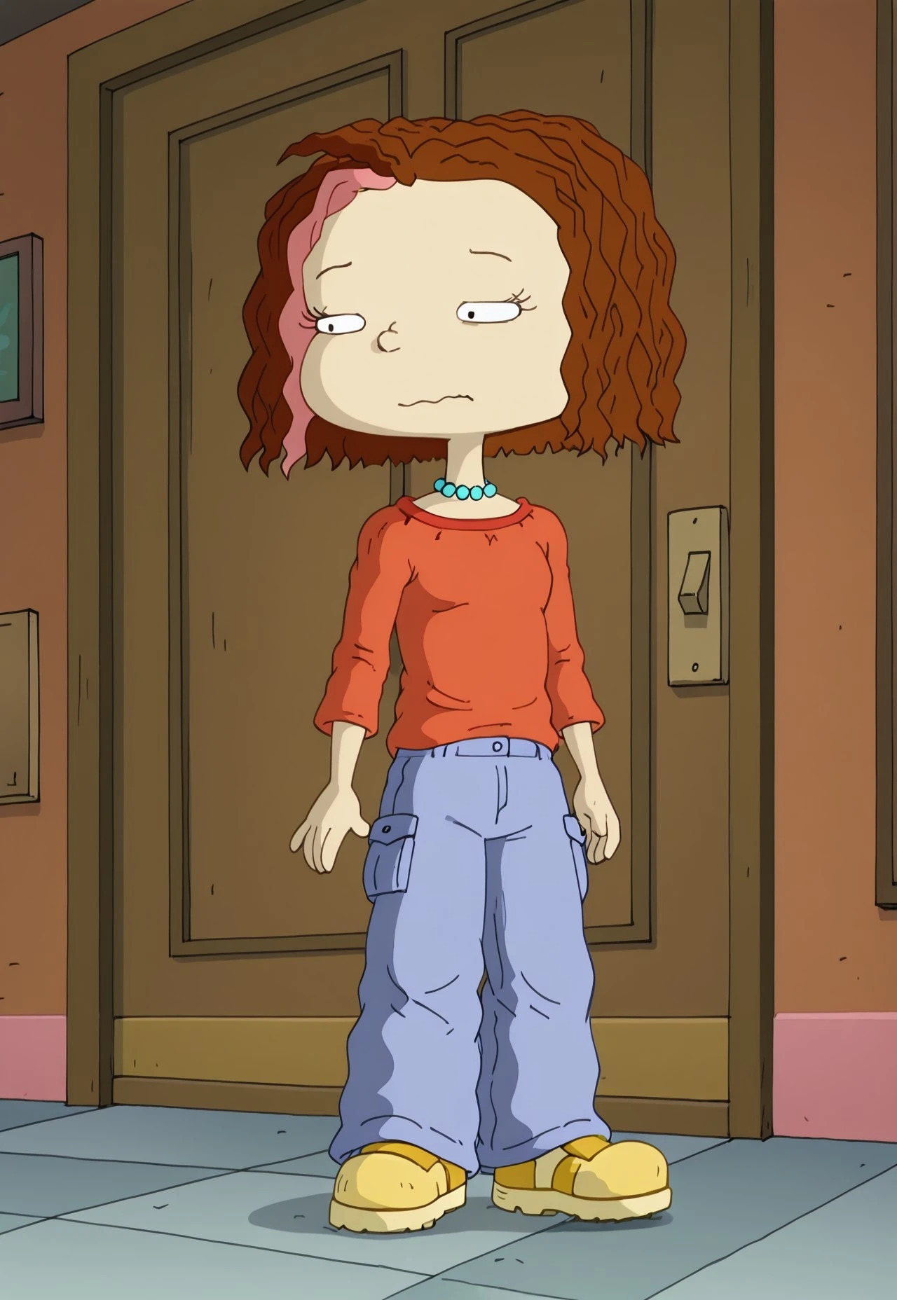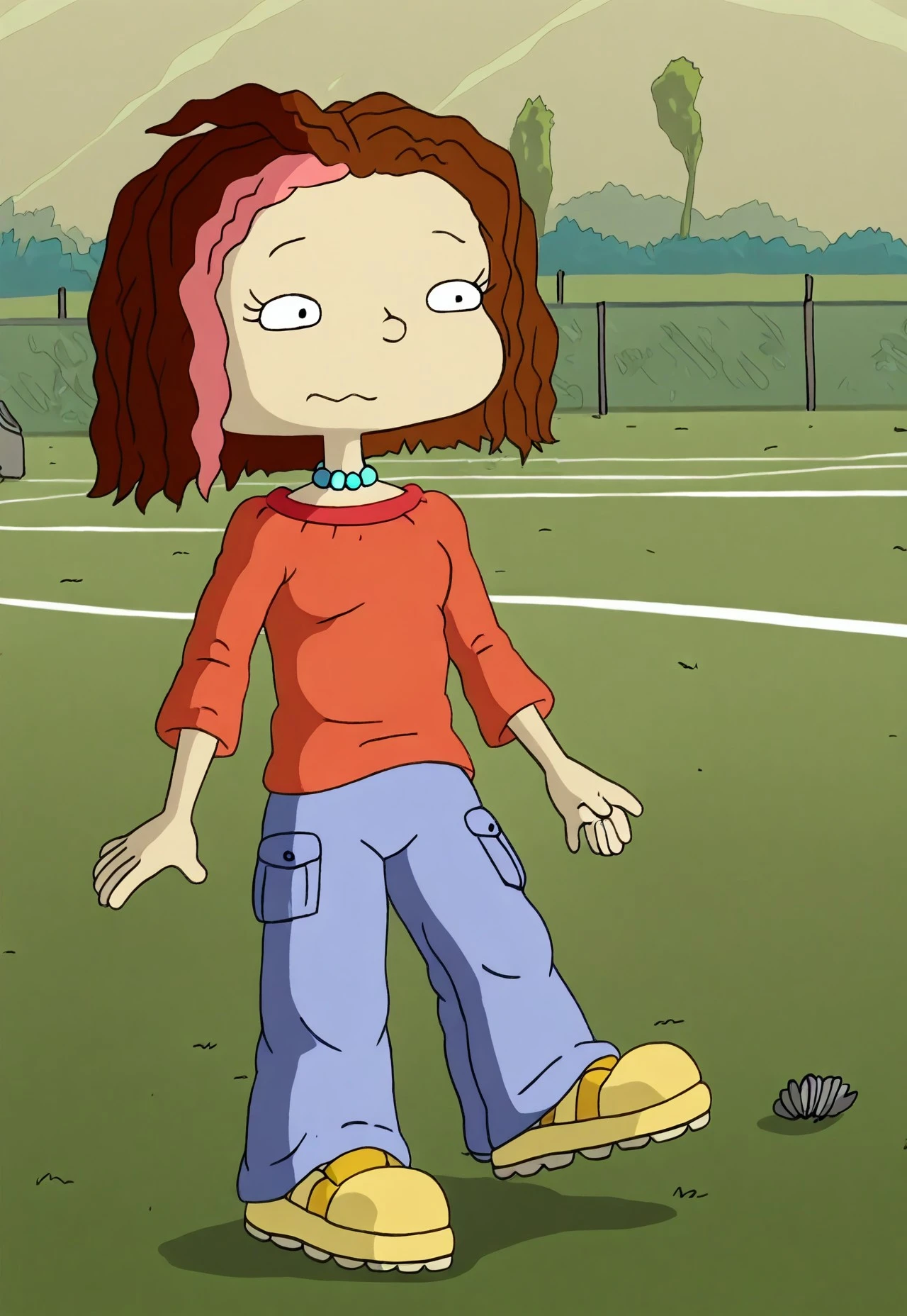 Lil_IL, 1girl, short brown hair with pink streak, tow tone hair, orange shirt, blue cargo pants, aqua necklace, yellow shoes