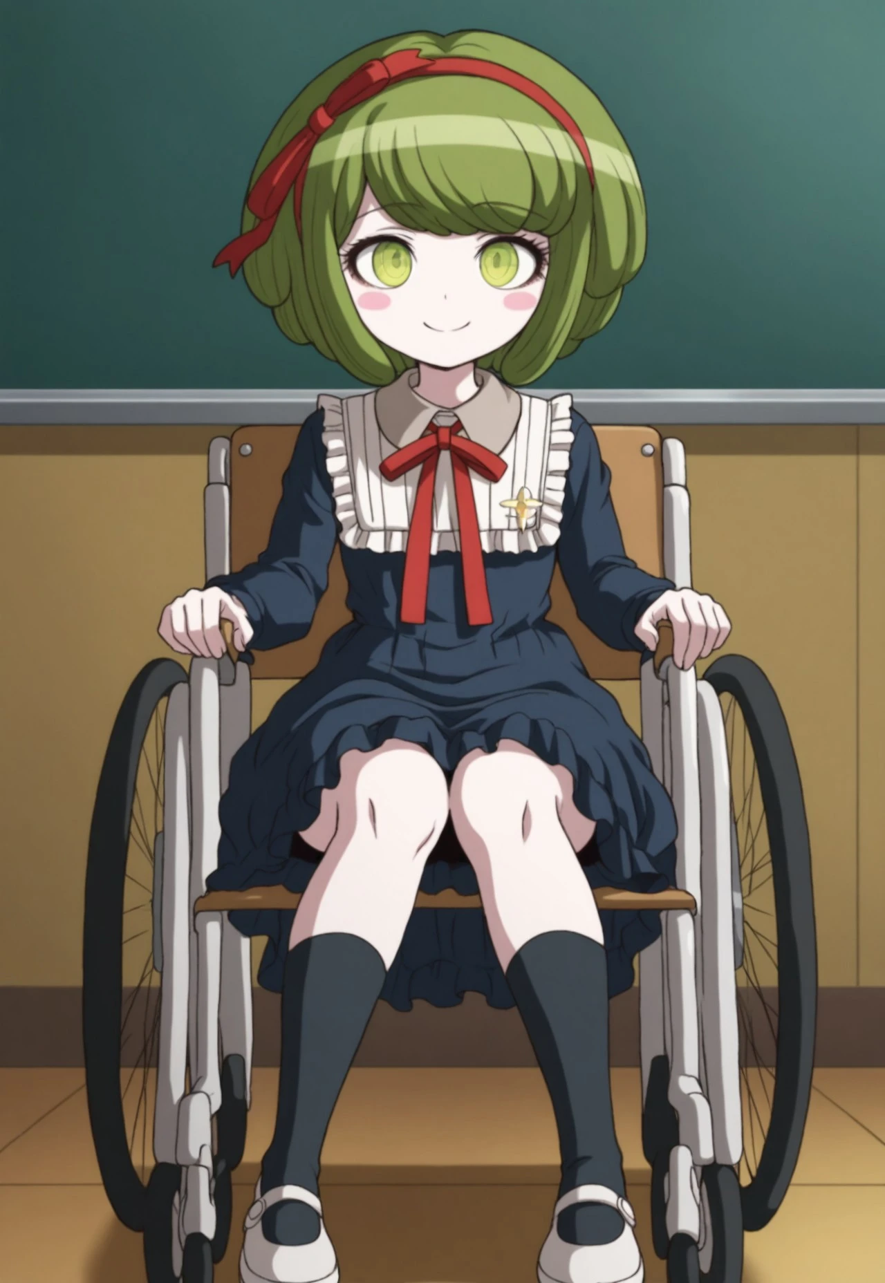 ‘dark blue dress, dress, red ribbon, long sleeves, socks, white shoes, mary janes,’