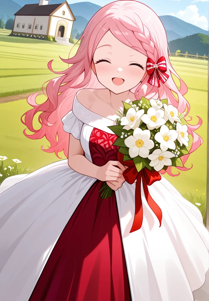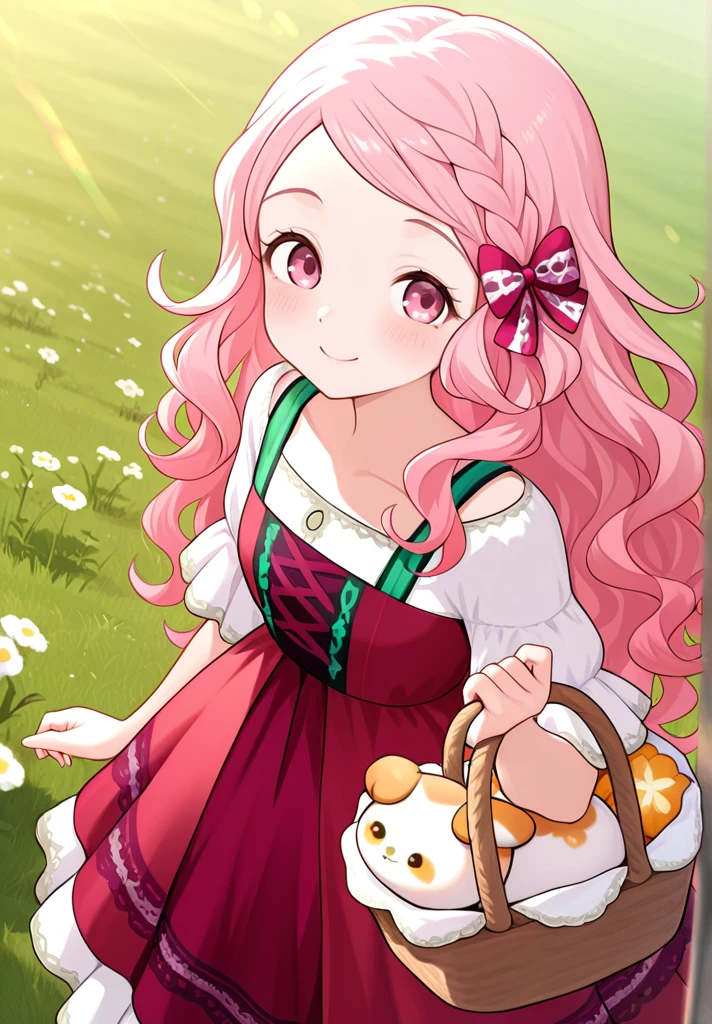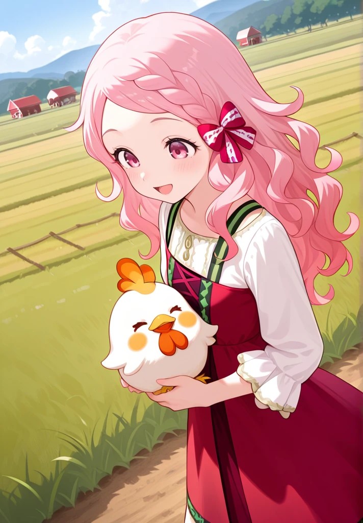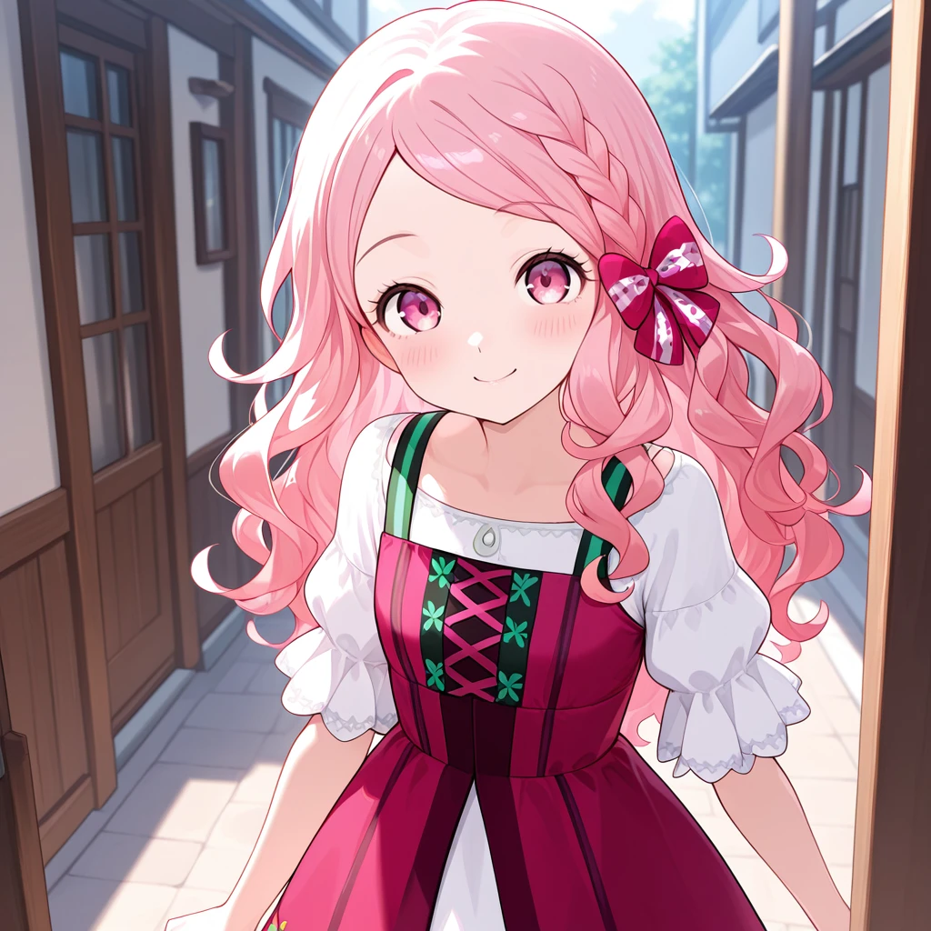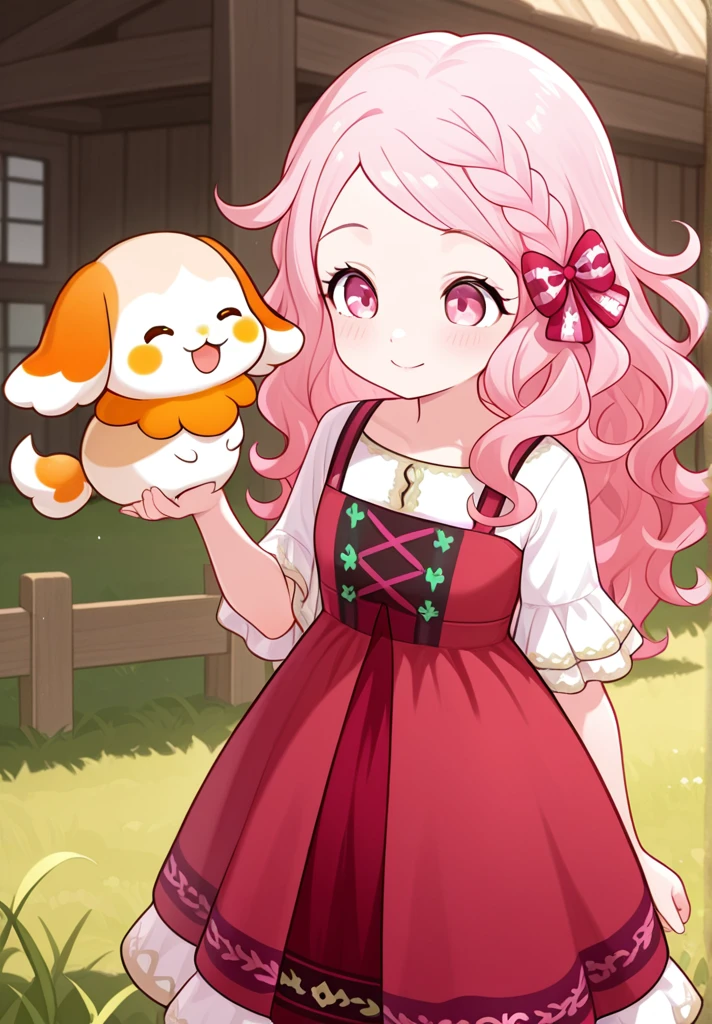 1girl, pink hair, braid, long hair, potpourri, red dress, pink eyes, bow, hair bow, wavy hair, ribbon