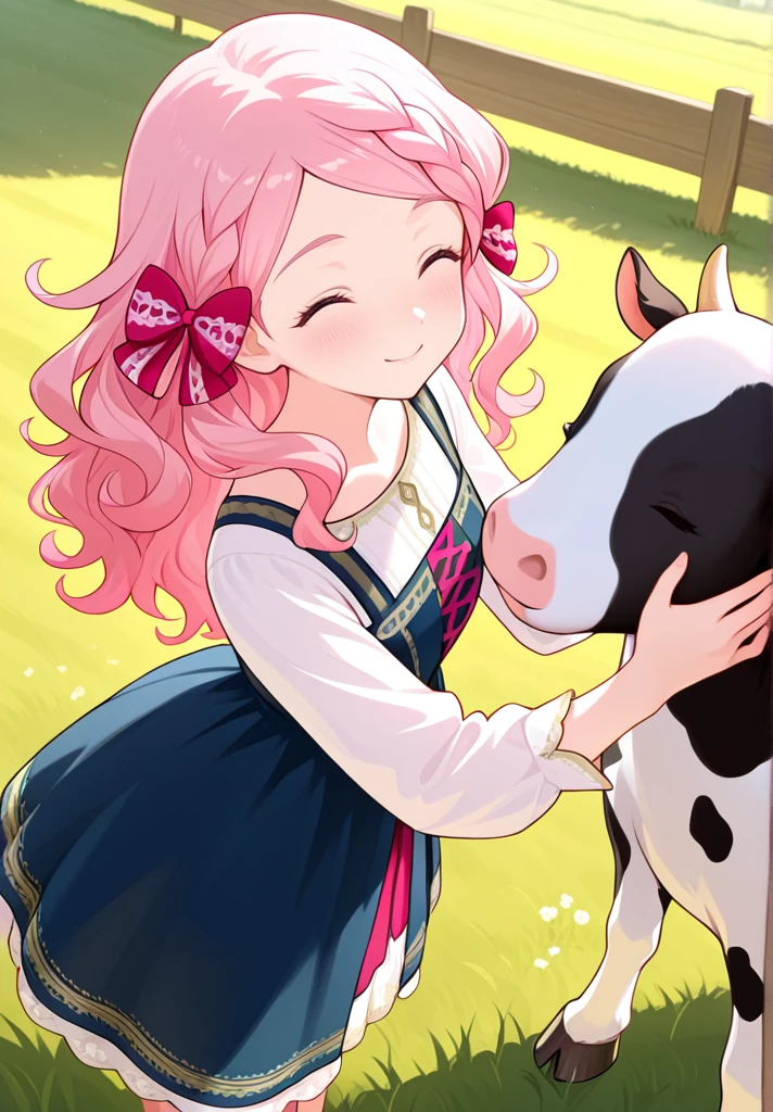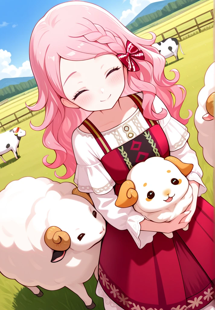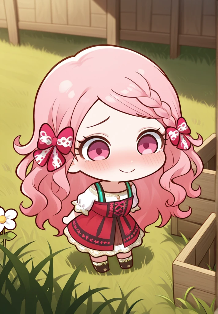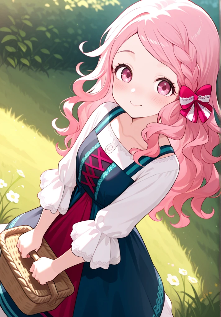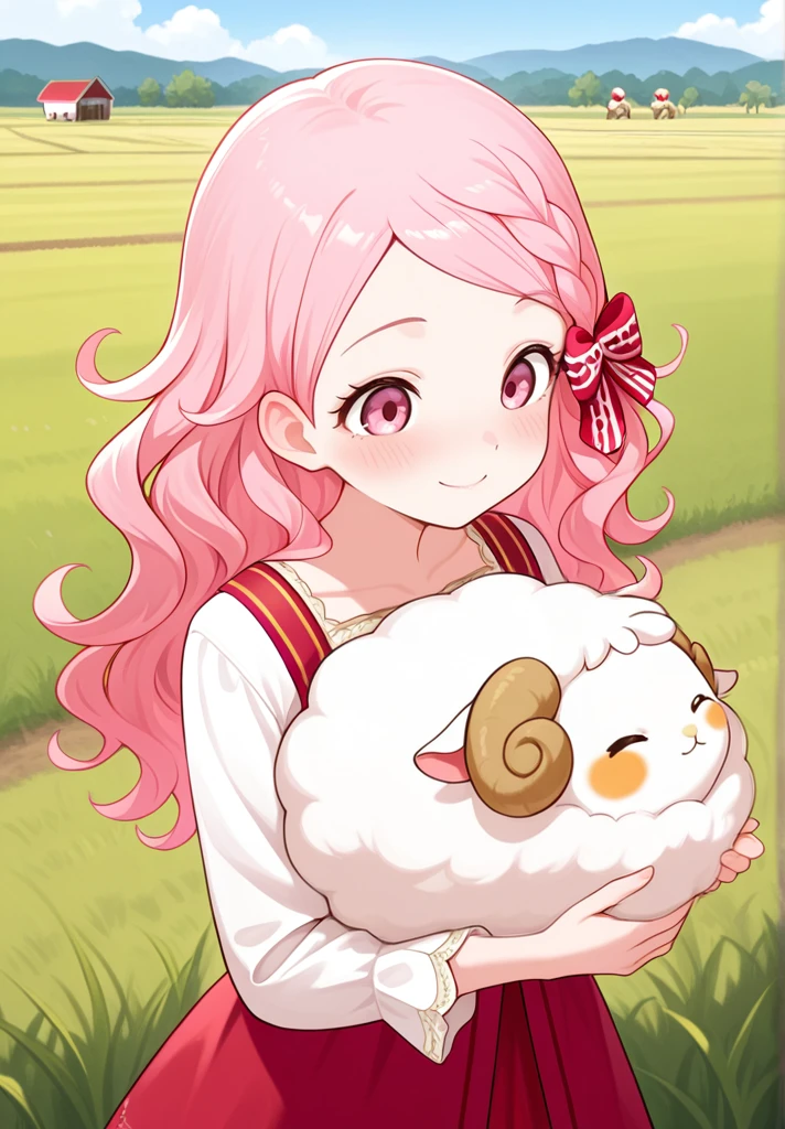 1girl, pink hair, braid, long hair, potpourri, red dress, pink eyes, bow, hair bow, wavy hair, ribbon