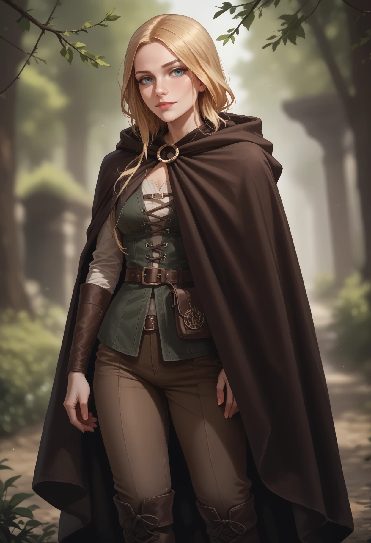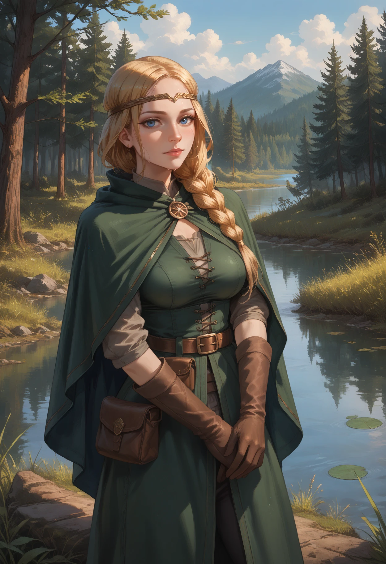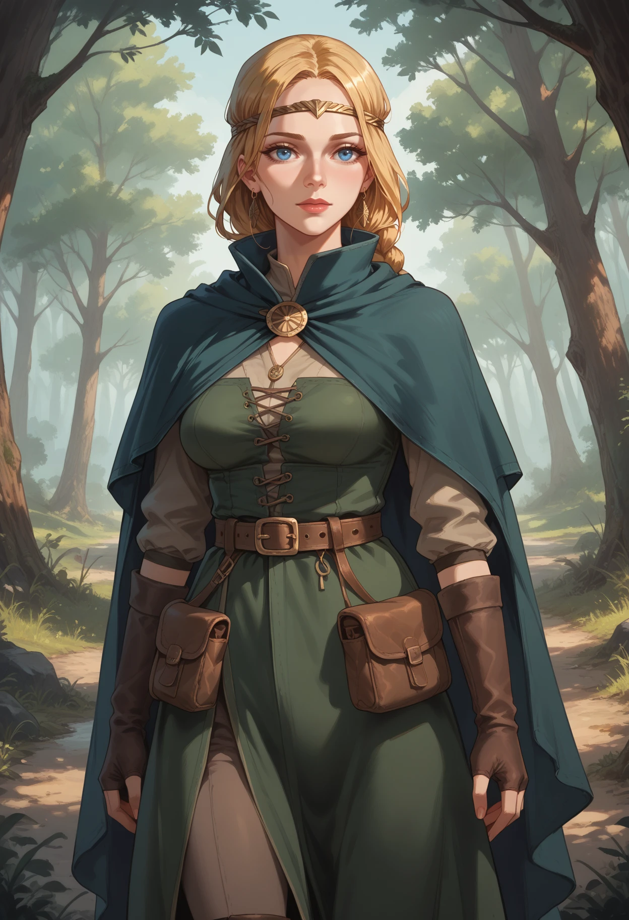 recommended tags: blonde hair, braid, hair over shoulder, blue eyes, breasts, jewelry, earrings, headband, tunic, circlet, pouch, gloves, belt, capelet, boots, quiver,