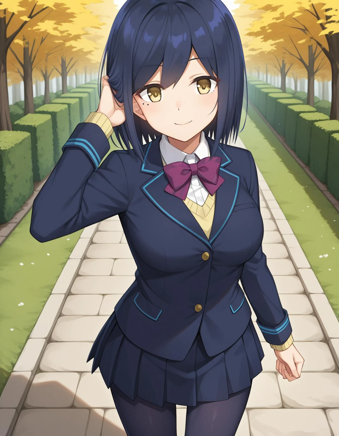 nijirincos,white shirt,collared shirt,purple bowtie,yellow sweater,blazer jacket,blue jacket,closed jacket,blue skirt,miniskirt,pleated skirt,dark blue pantyhose,