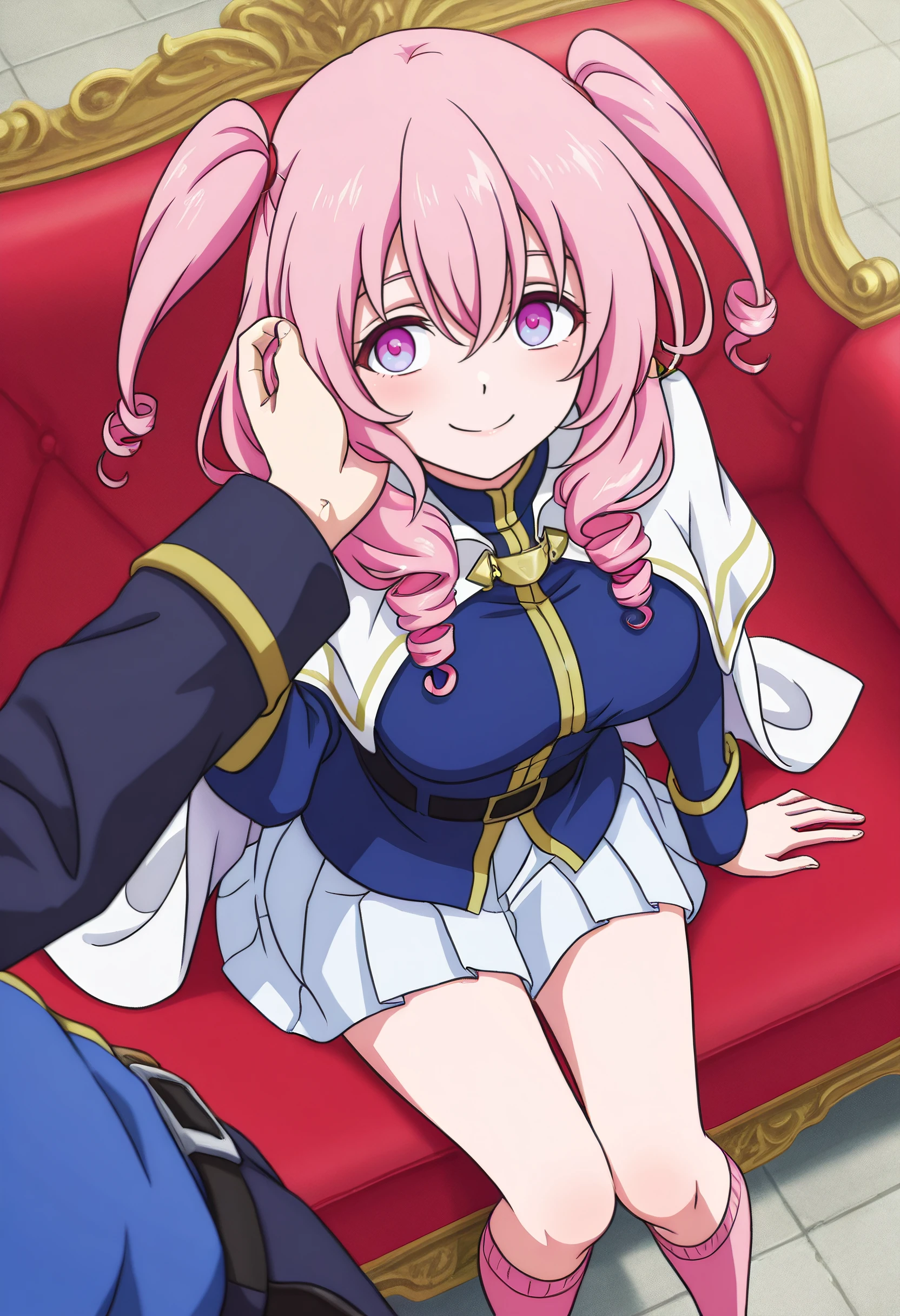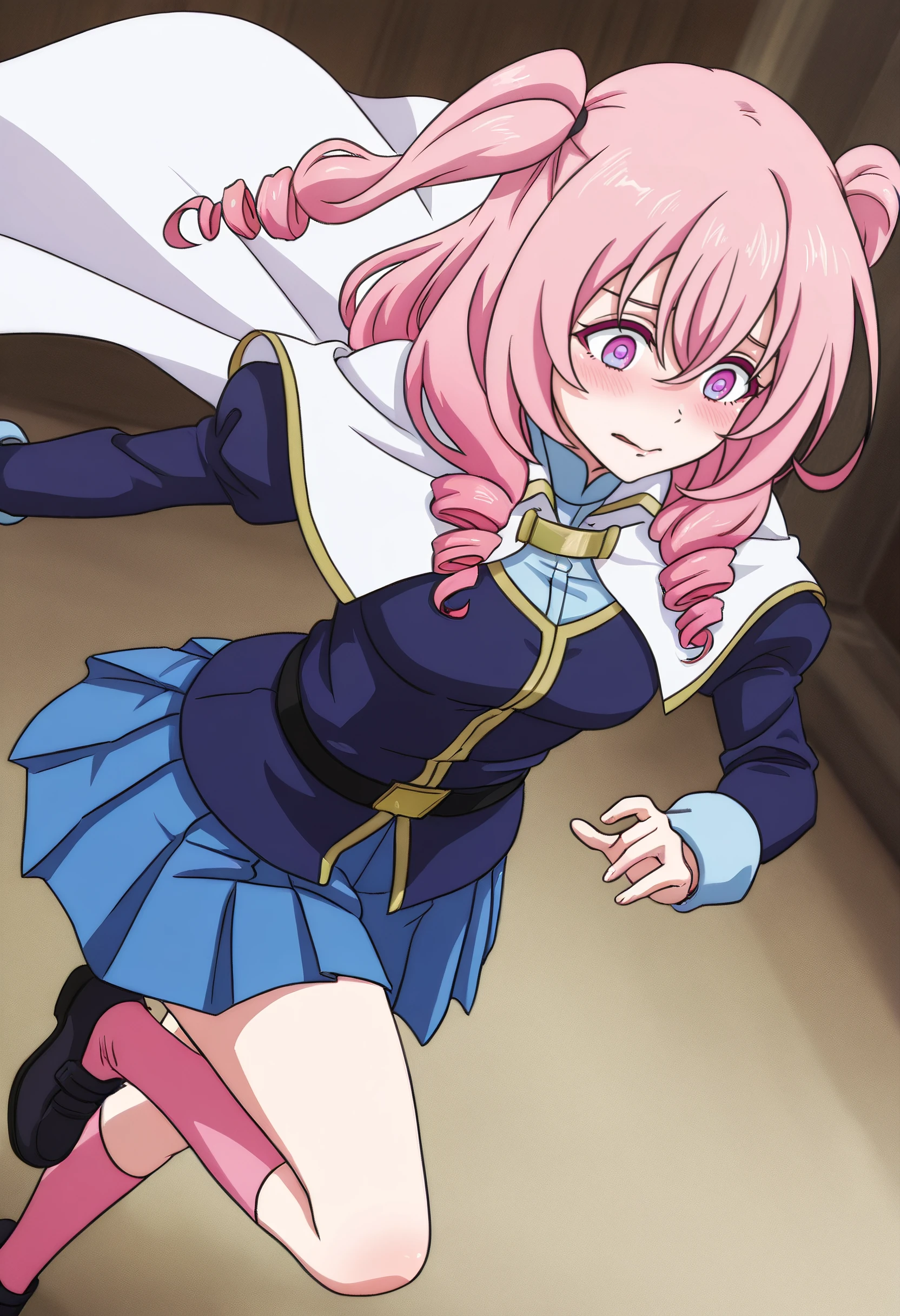 CarolShirt, two side up, long sleeves, jacket, capelet, white capelet, skirt, blue skirt, shirt, blue shirt, belt, medium hair, pleated skirt, socks, pink socks, kneehighs, twintails, white cape, miniskirt, blue vest, juliet sleeves, cape,