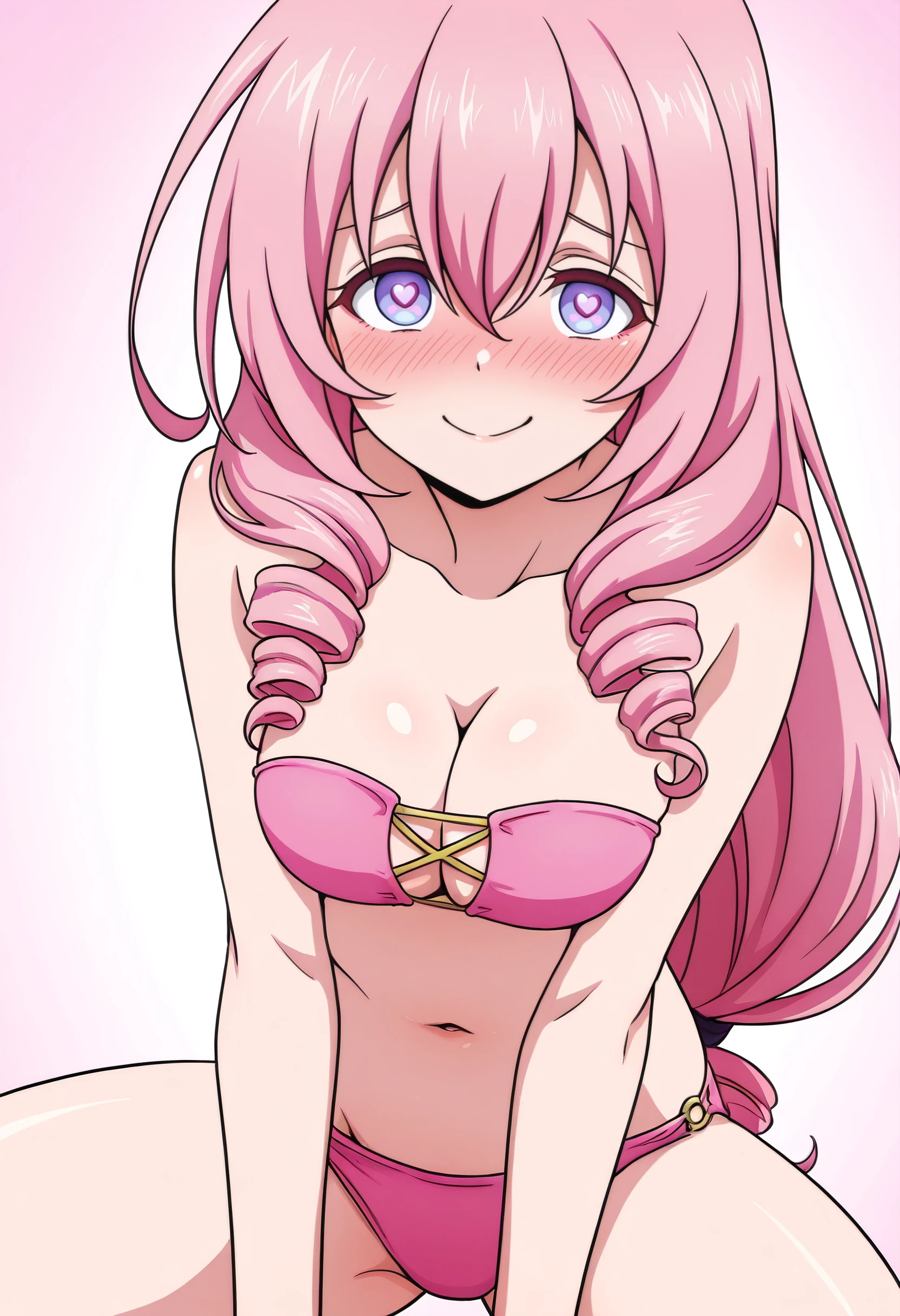 CarolSwimwear, swimsuit, bikini, pink bikini, strapless bikini, navel, cleavage, strapless, bare shoulders, twin drills, groin, sidelocks, symbol-shaped pupils, heart-shaped pupils, bandeau, side drill,
