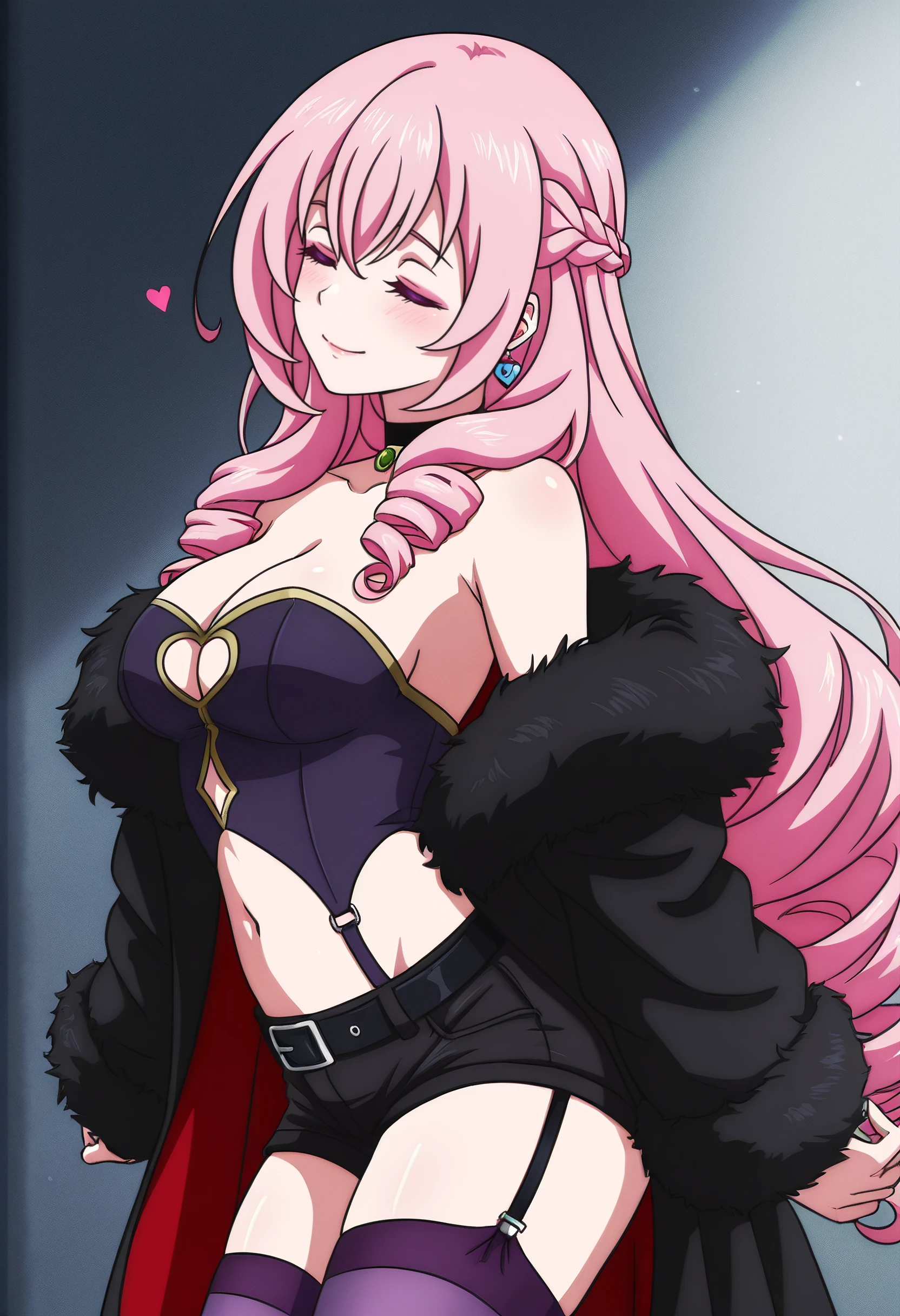 CarolOutfitB, braid, fur trim, cleavage, choker, bare shoulders, french braid, black choker, off shoulder, mole under eye, mole, coat, makeup, dress, jacket, long sleeves, lipstick, clothing cutout, drill sidelocks, navel, symbol-shaped pupils, twin drills, jewelry, thighhighs, shorts, black coat, earrings, garter straps, heart-shaped pupils, open coat, strapless, short shorts, very long hair, fur-trimmed coat, belt, fur coat, purple thighhighs, black shorts, midriff,