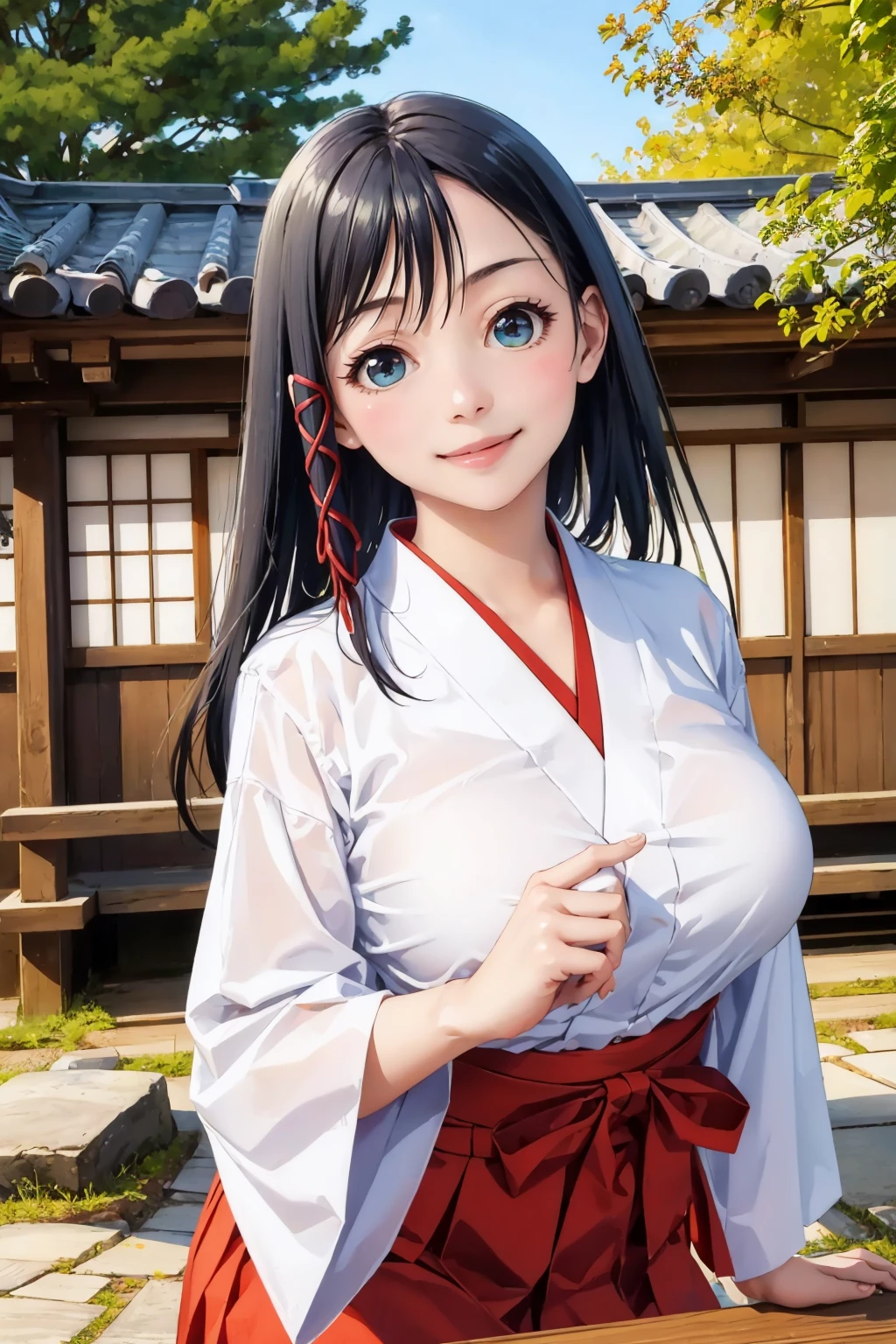 Add "hair ribbon, japanese clothes, white sleeves, wide sleeves, red skirt, hakama skirt" for her typical look.