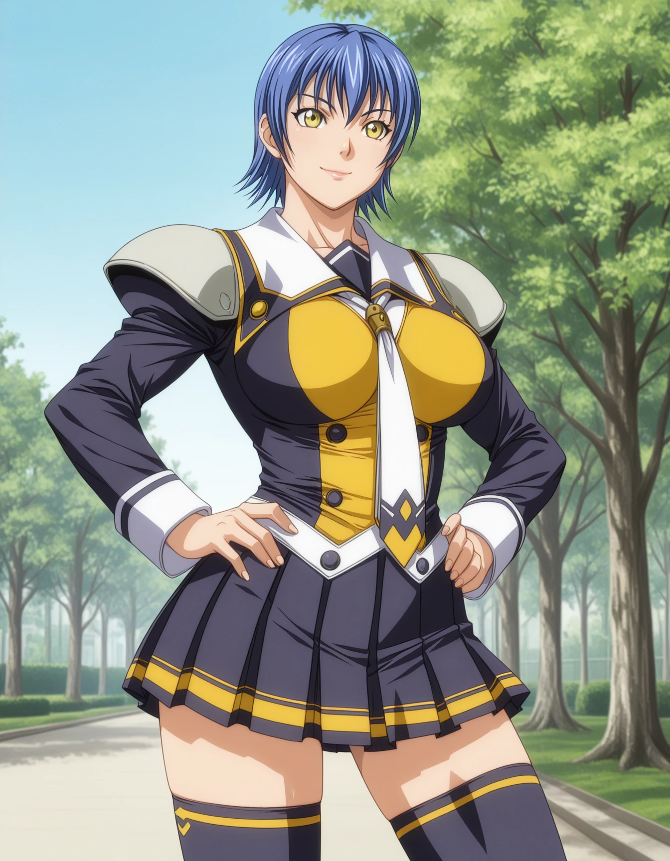 St_Arcadia_Uniform, school uniform, black and yellow clothes, shoulder pads, white necktie, long sleeves, pleated skirt, black thighhighs