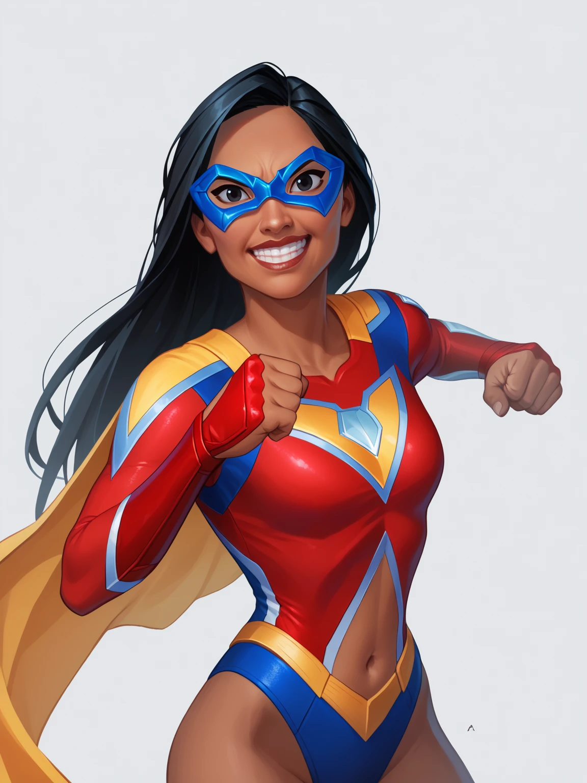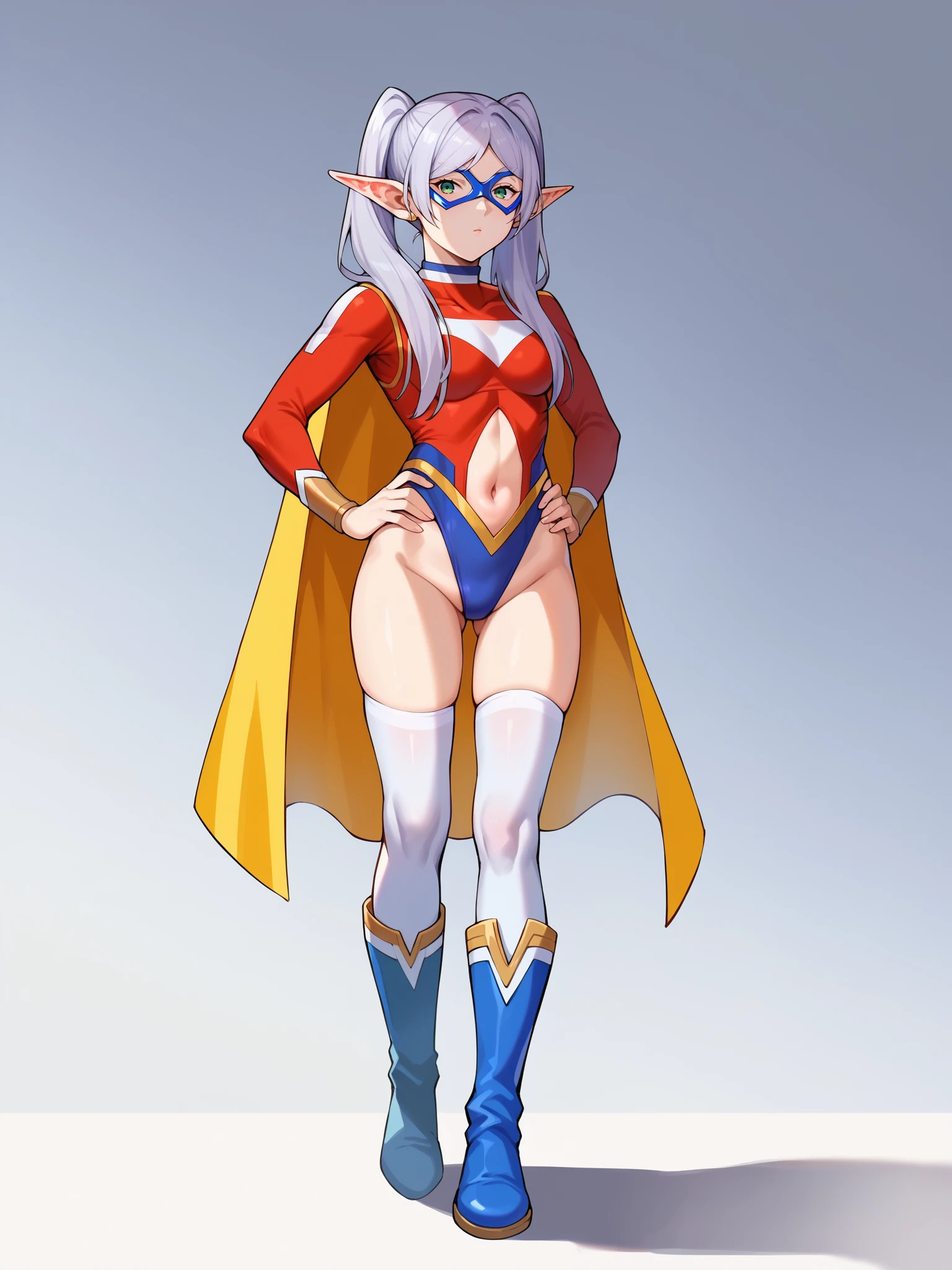 Basic prompts : spandexerSA, mask, superhero, yellow cape, navel, leotard, clothing cutout, white thighhighs, blue boots, gloves