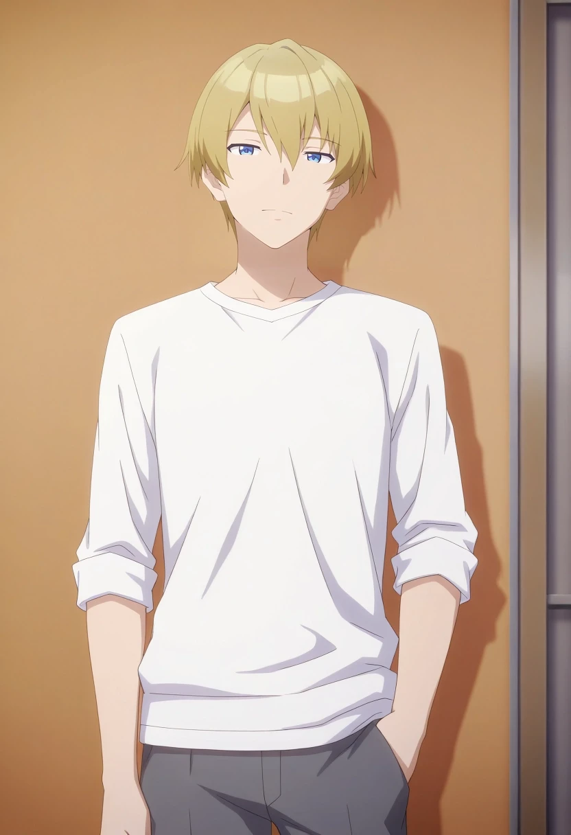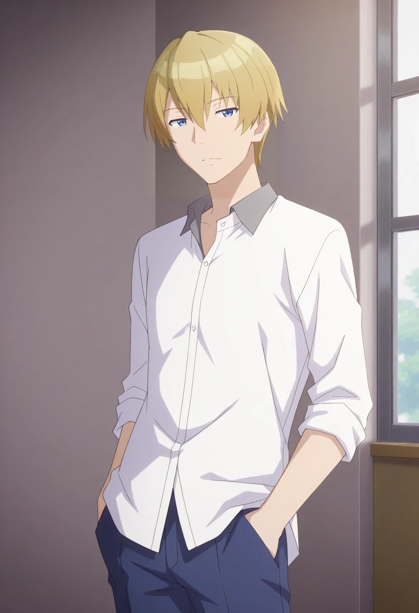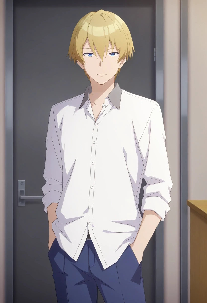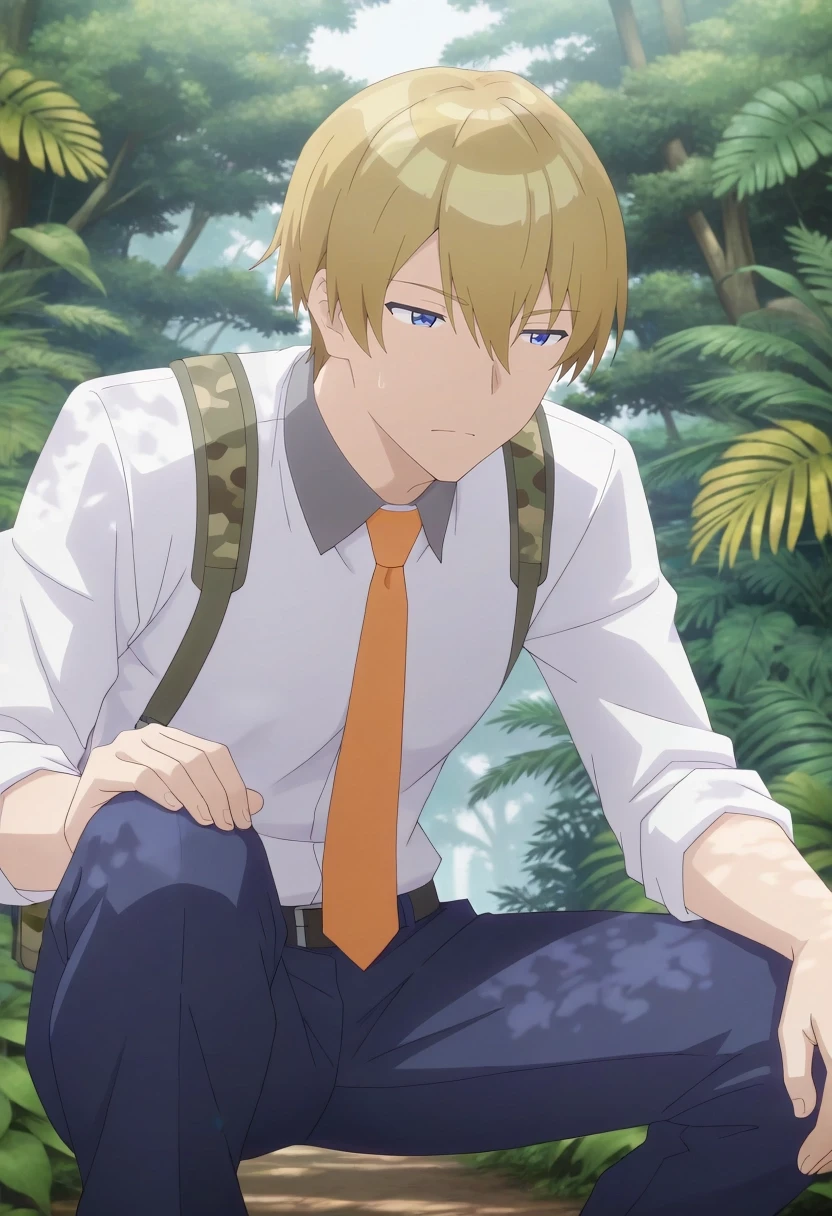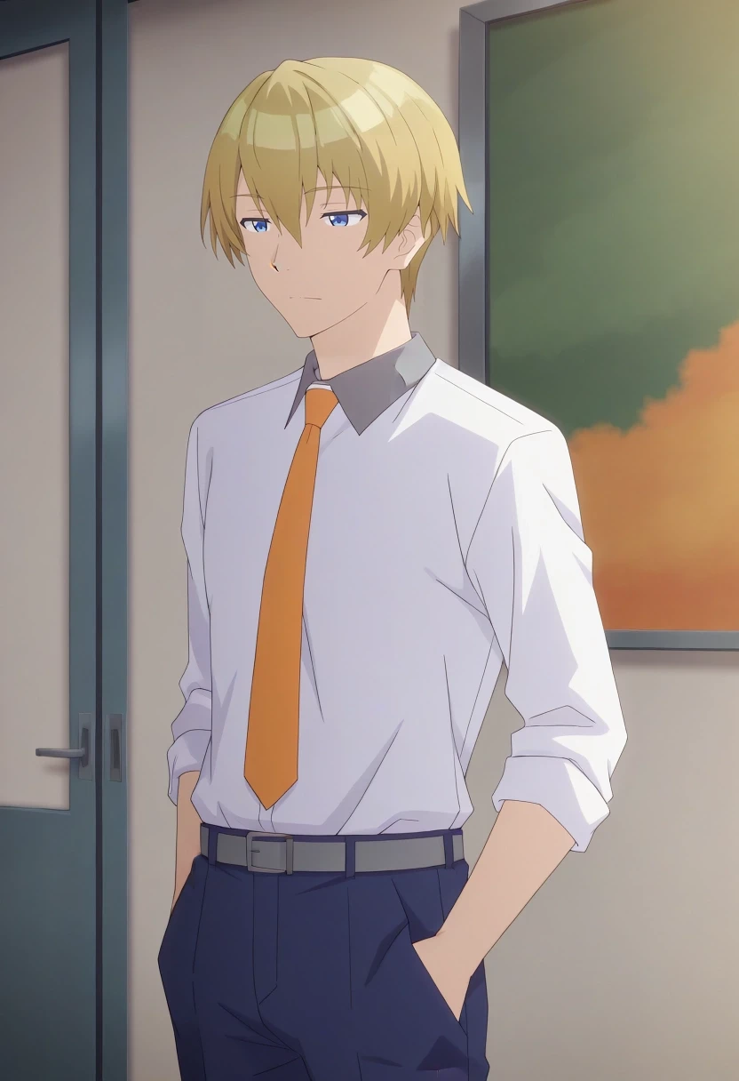 mitsuru_abe, blonde hair, blue eyes, short hair, hair between eyes, bangs, {white collared shirt, gray collar, orange necktie, dark blue pants||}