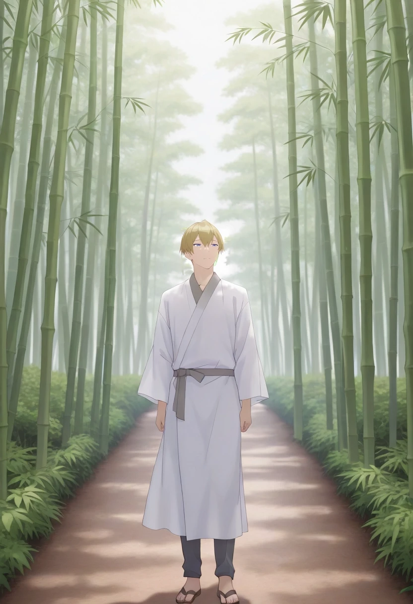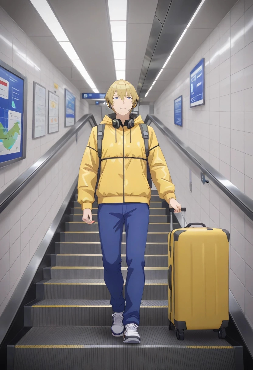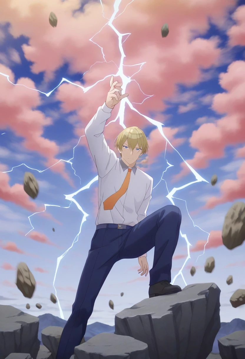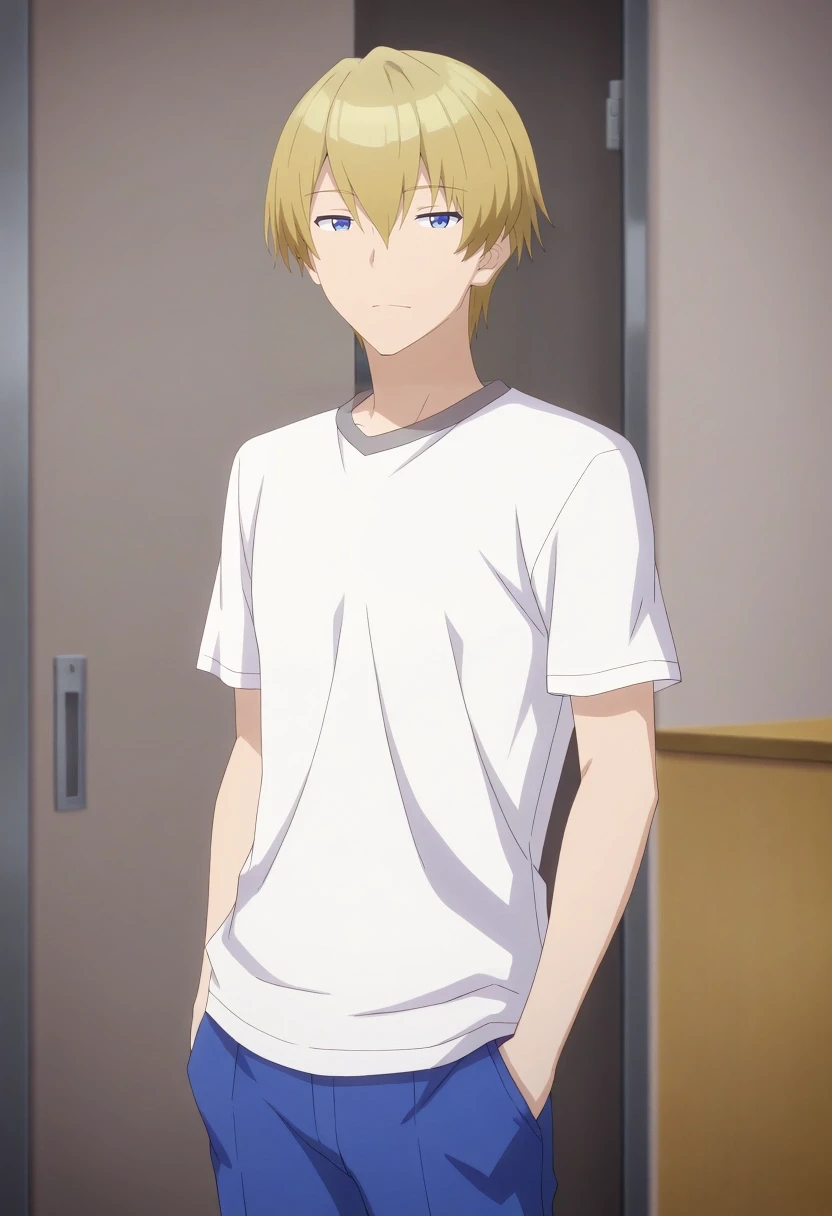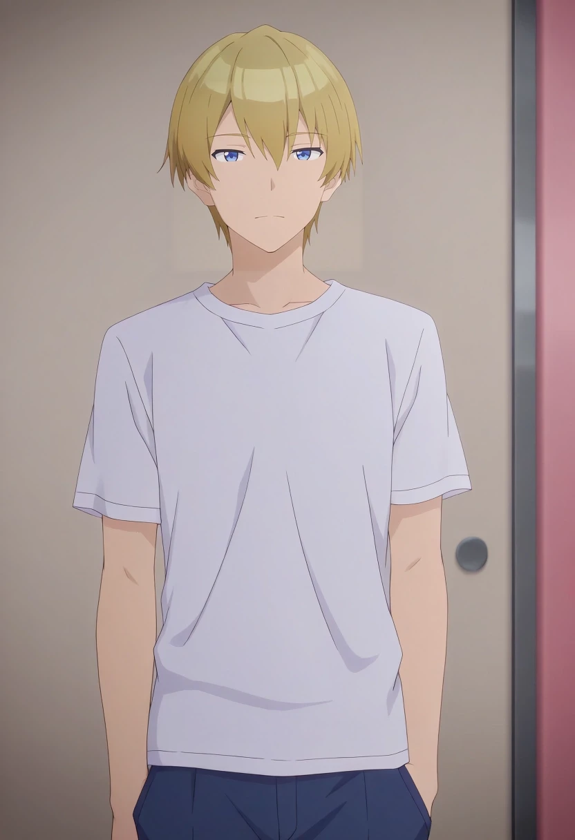 mitsuru_abe, blonde hair, blue eyes, short hair, hair between eyes, bangs, {white collared shirt, gray collar, orange necktie, dark blue pants||}