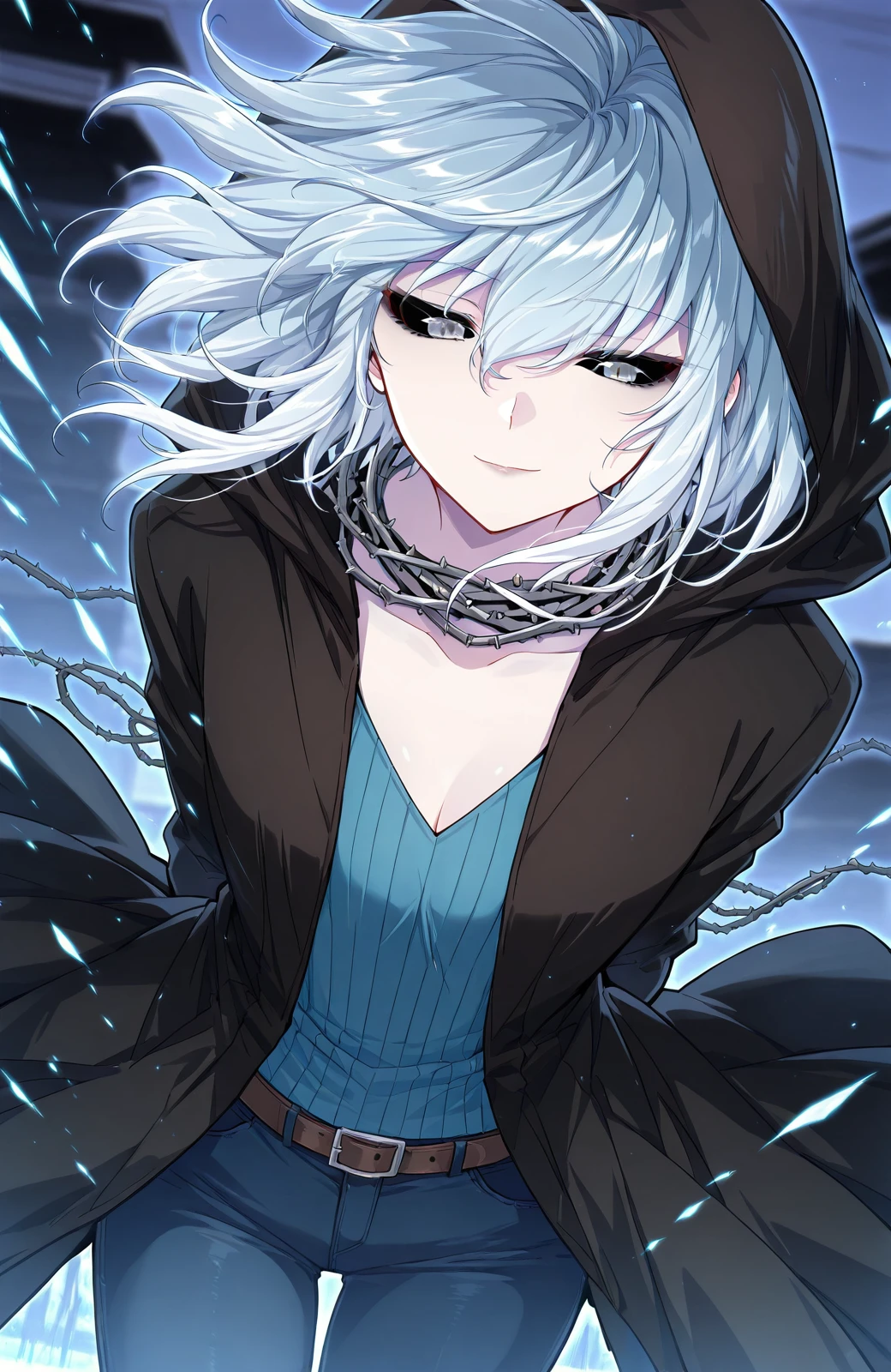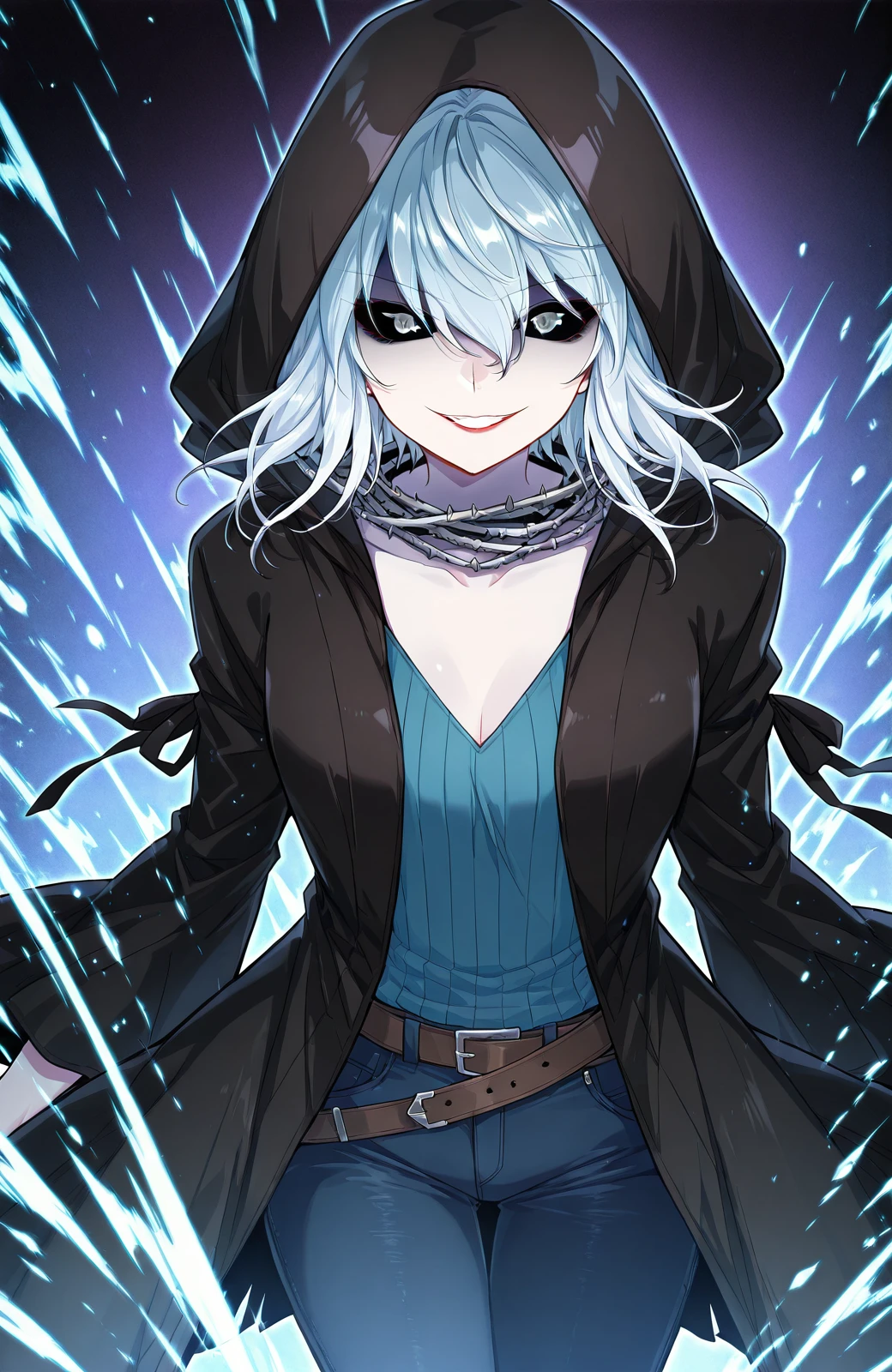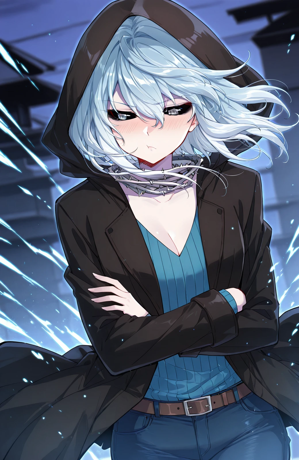 Wuyun_outfit, hood, black hooded coat, hood up, blue sweater, v-neck sweater, vertical ribbed knit, blue pants, jeans, brown belt, spiked collar, spiked choker, black choker,