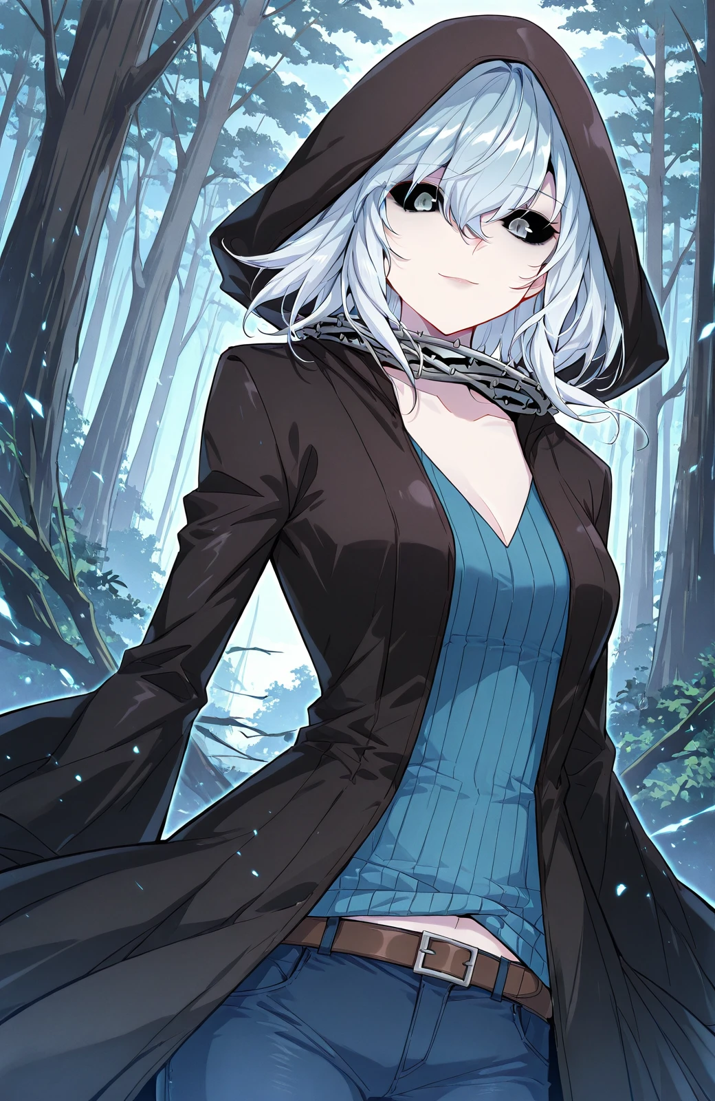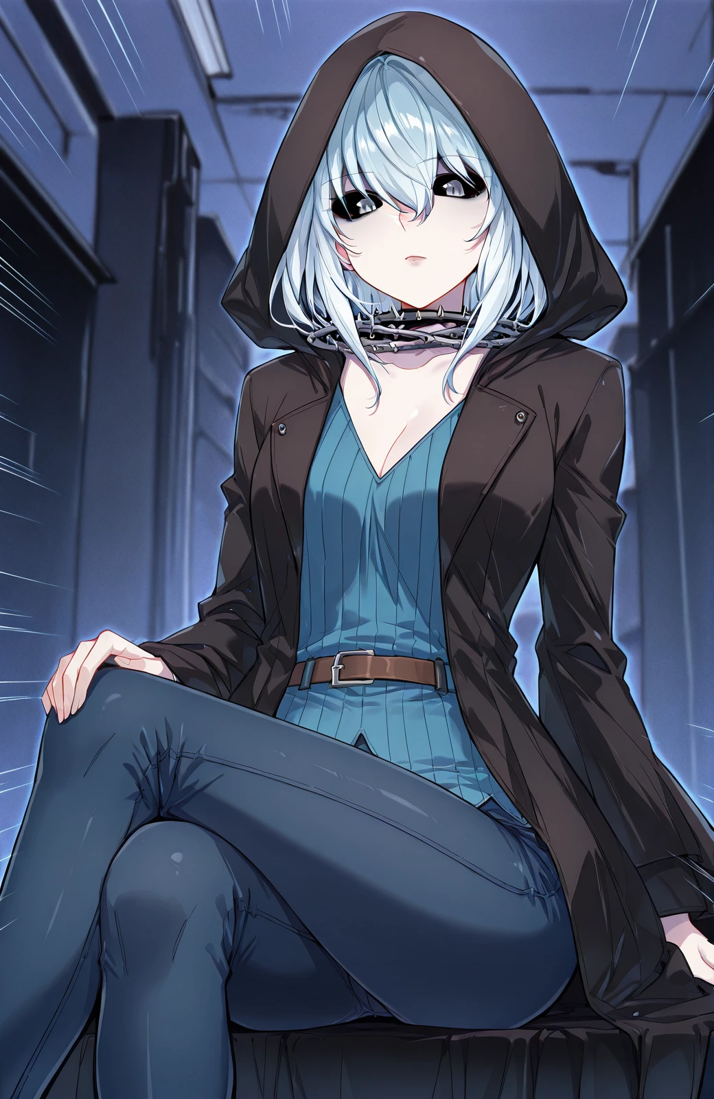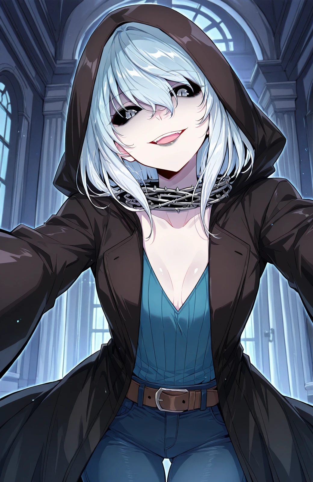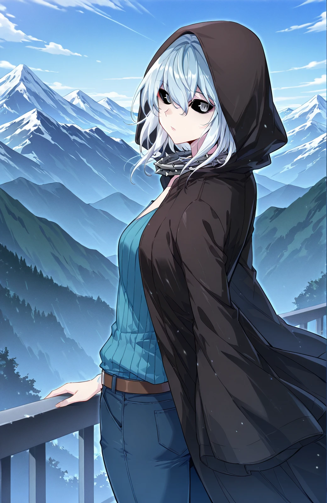 Wuyun_outfit, hood, black hooded coat, hood up, blue sweater, v-neck sweater, vertical ribbed knit, blue pants, jeans, brown belt, spiked collar, spiked choker, black choker,
