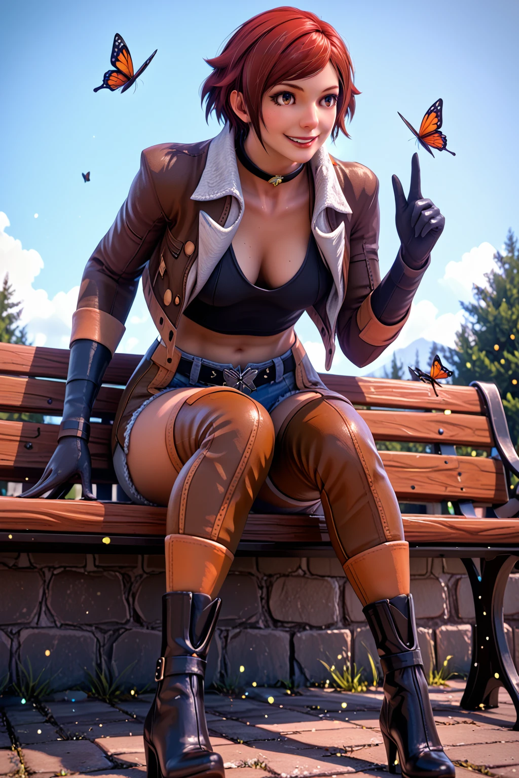 Trigger : miru, short hair, collar, jacket, crop top, long sleeves, gloves, denim shorts, belt, chaps, high heel boots