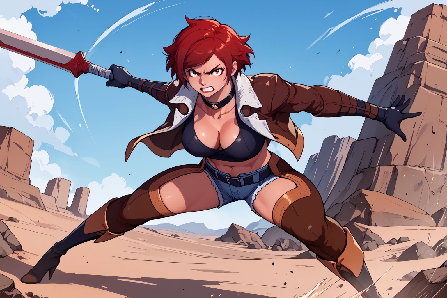 Trigger : 1girl, short hair, jacket, gloves, choker, shorts, thighhighs, long sleeves, high heel boots, crop top, weapon, sword, belt