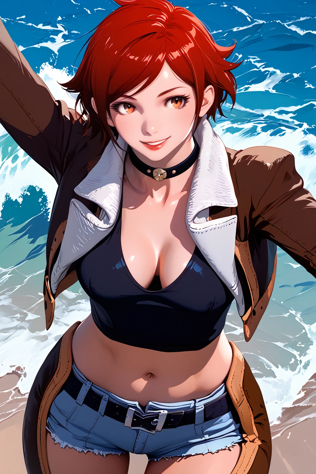 miru, short hair, collar, jacket, crop top, long sleeves, gloves, denim shorts, belt, chaps, high heel boots