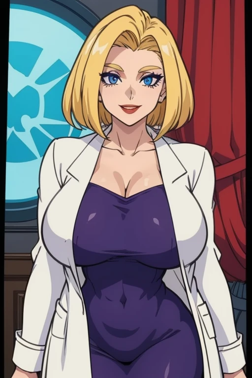purple dress, white labcoat,