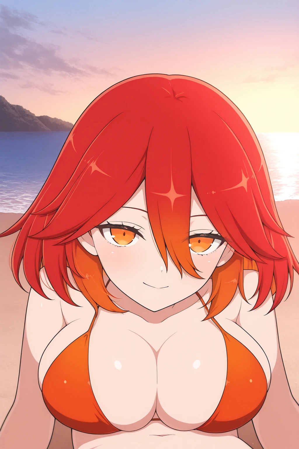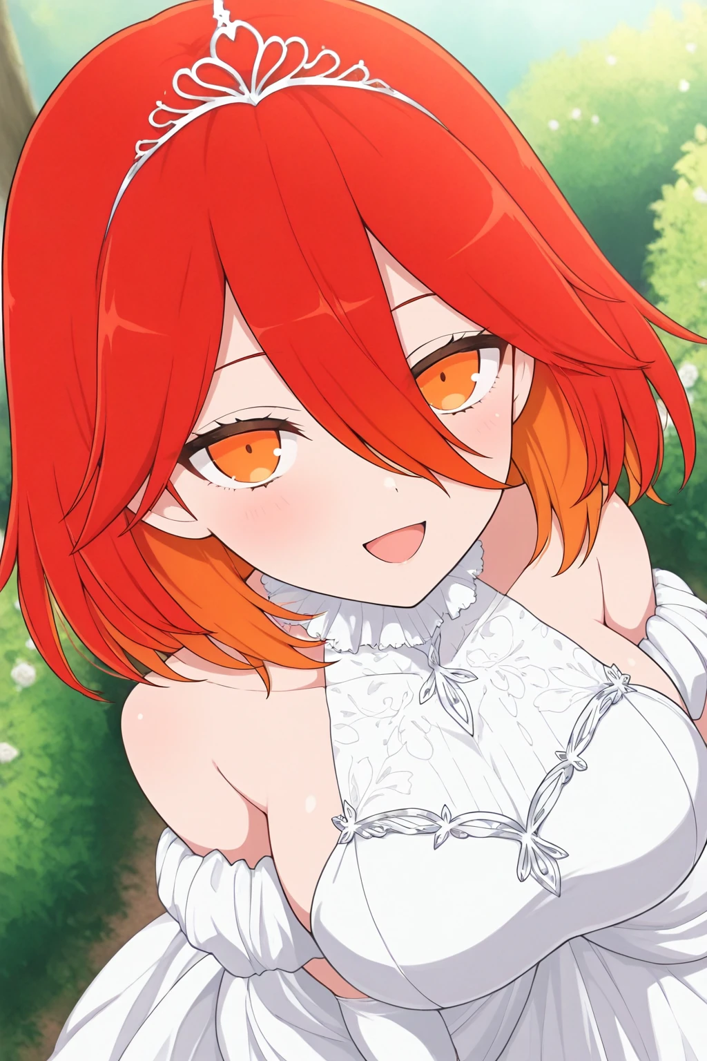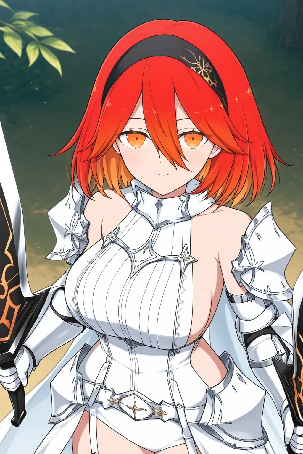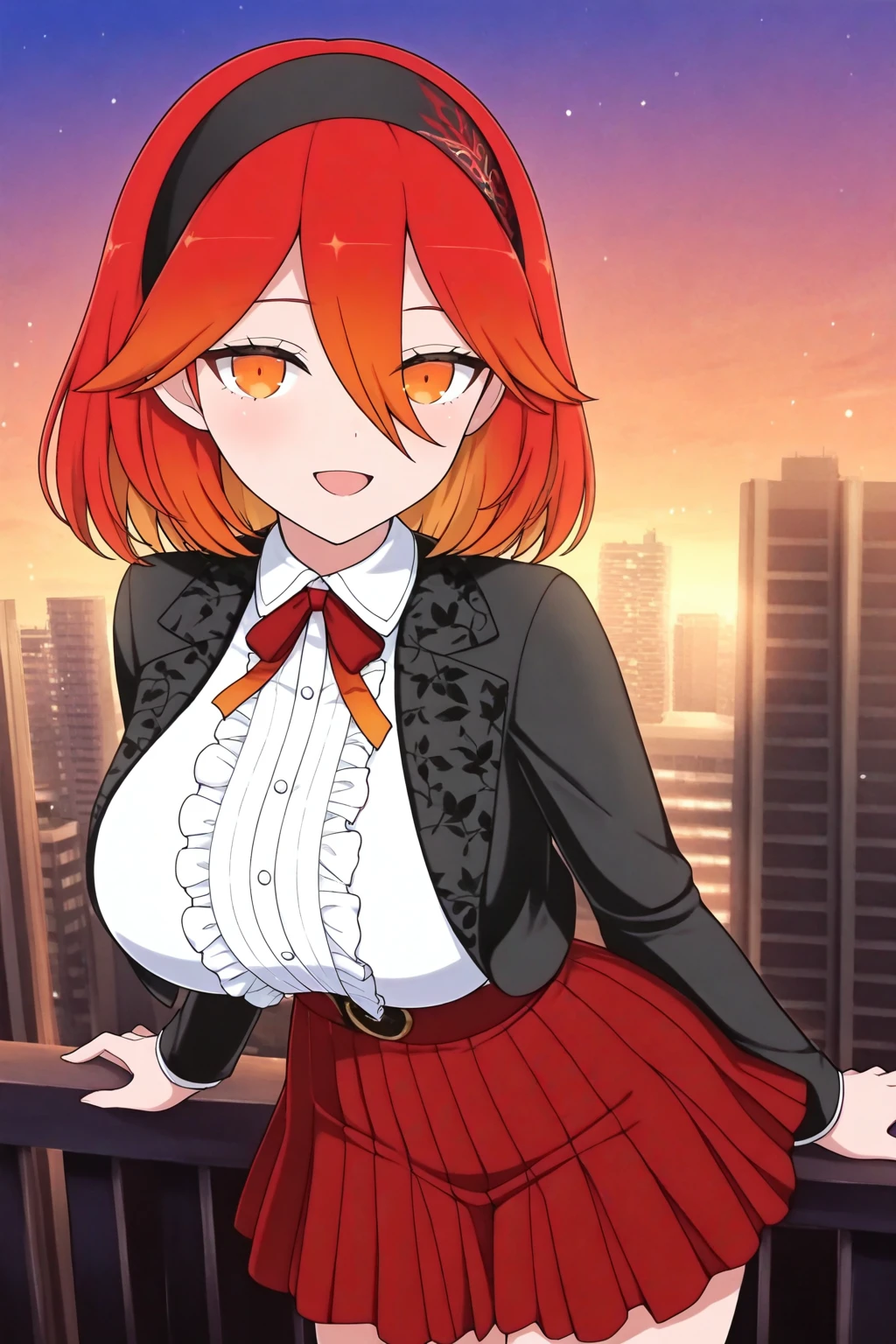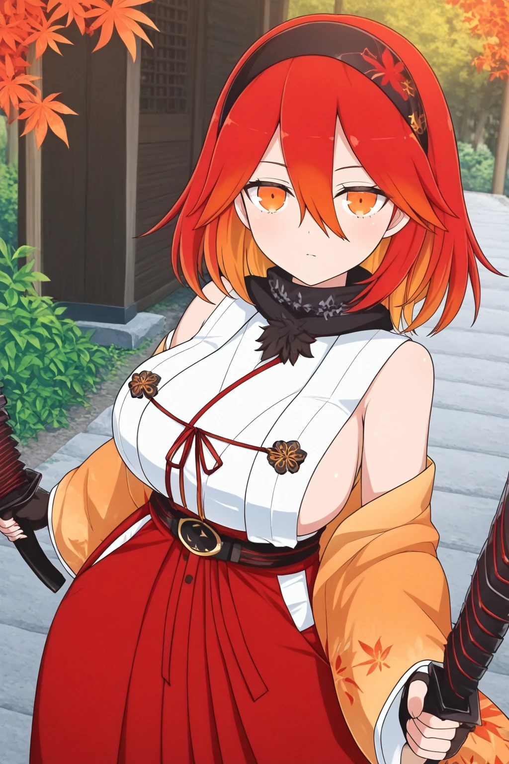 red hair, gradient hair, black hairband, leaf print hairband, long bangs, medium hair, orange eyes