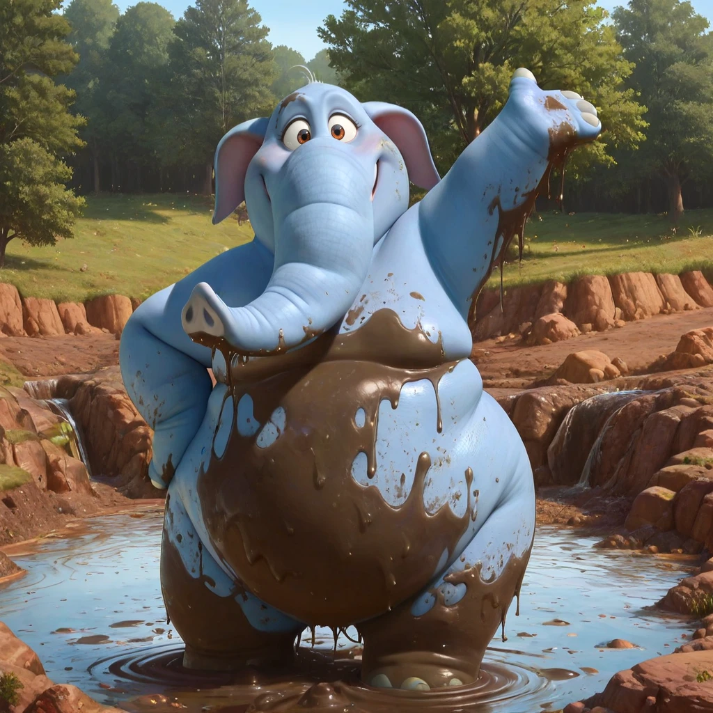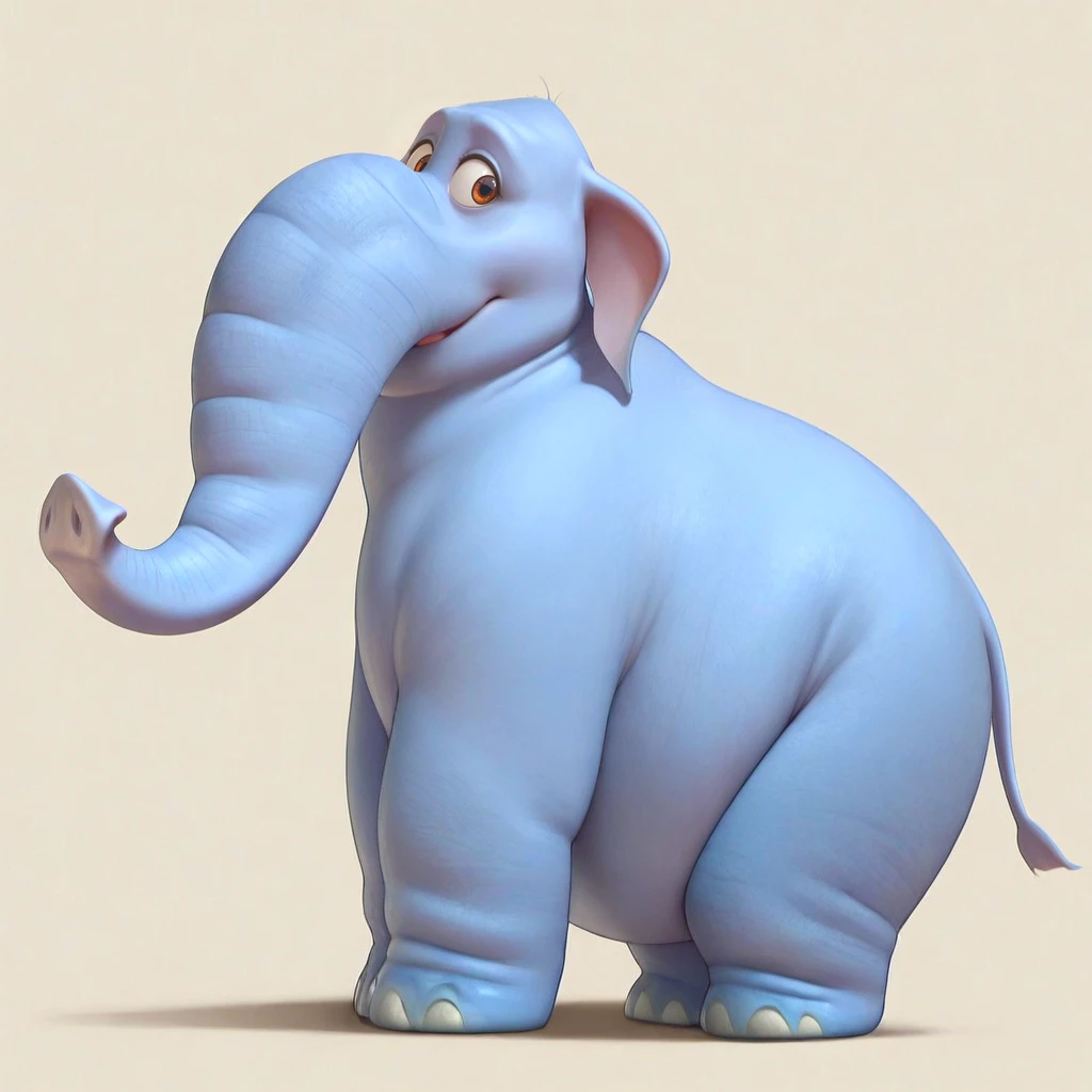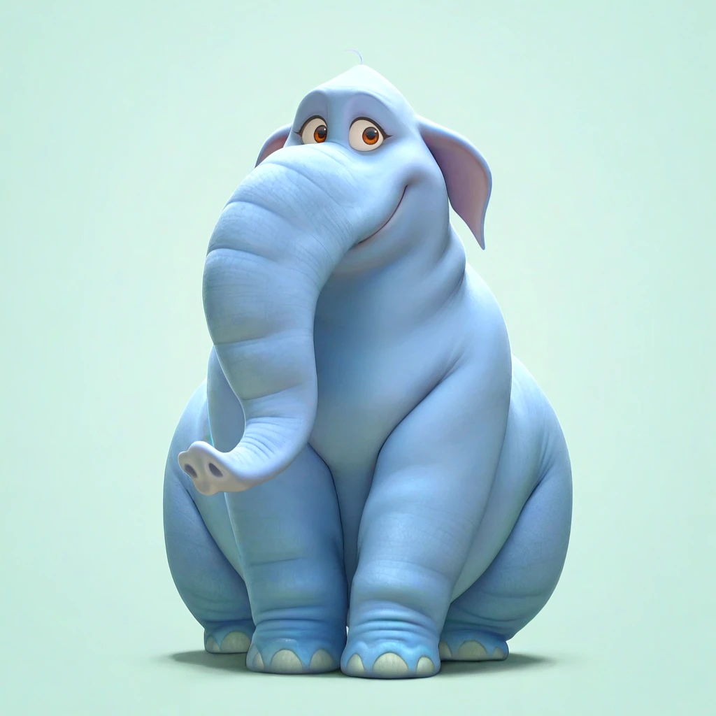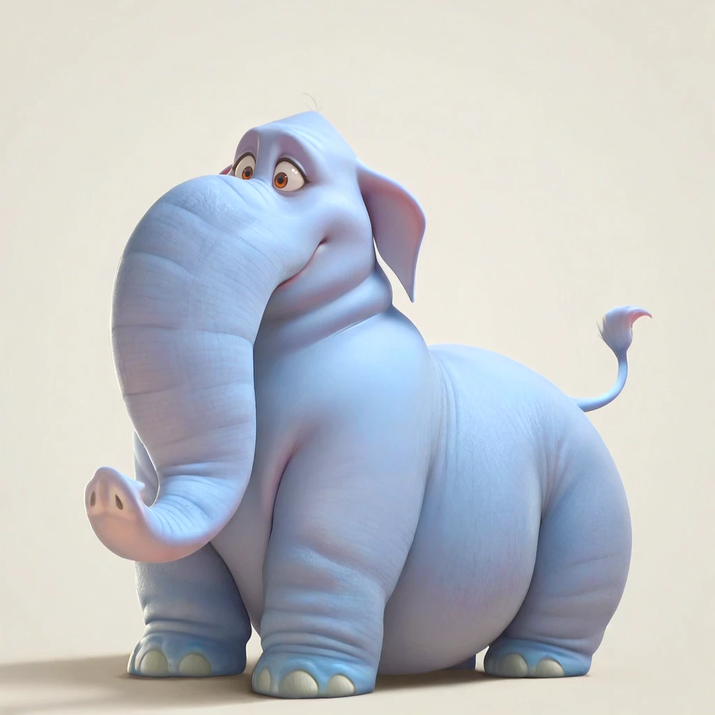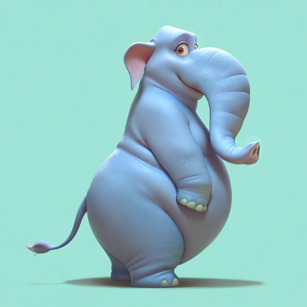 elephant, female, overweight, blue skin, grey skin, brown eyes, floppy ears, snout