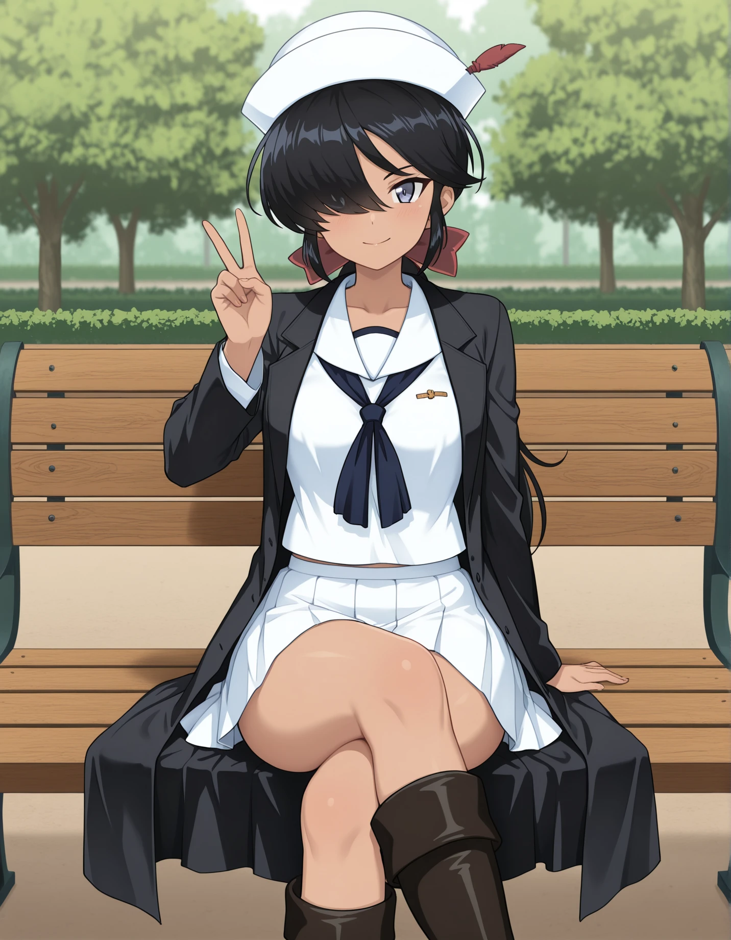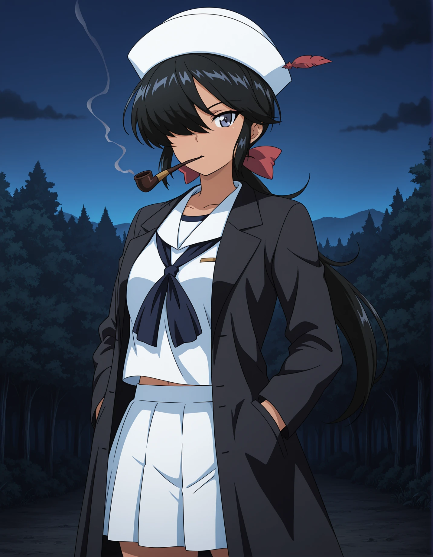 oginillu, dixie cup hat, hair bow, long sleeves, school uniform, sailor, black coat, open coat, pleated skirt, white shirt, neckerchief, sailor collar, hair over one eye, smoking pipe