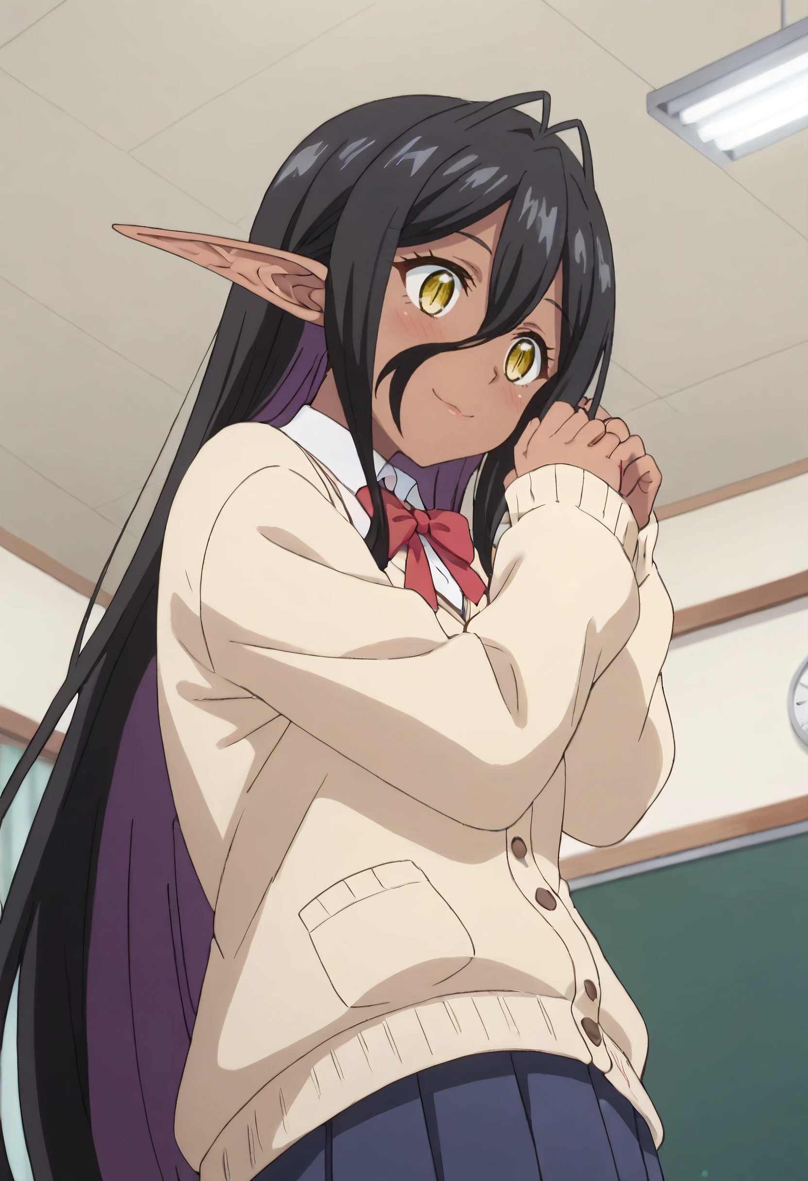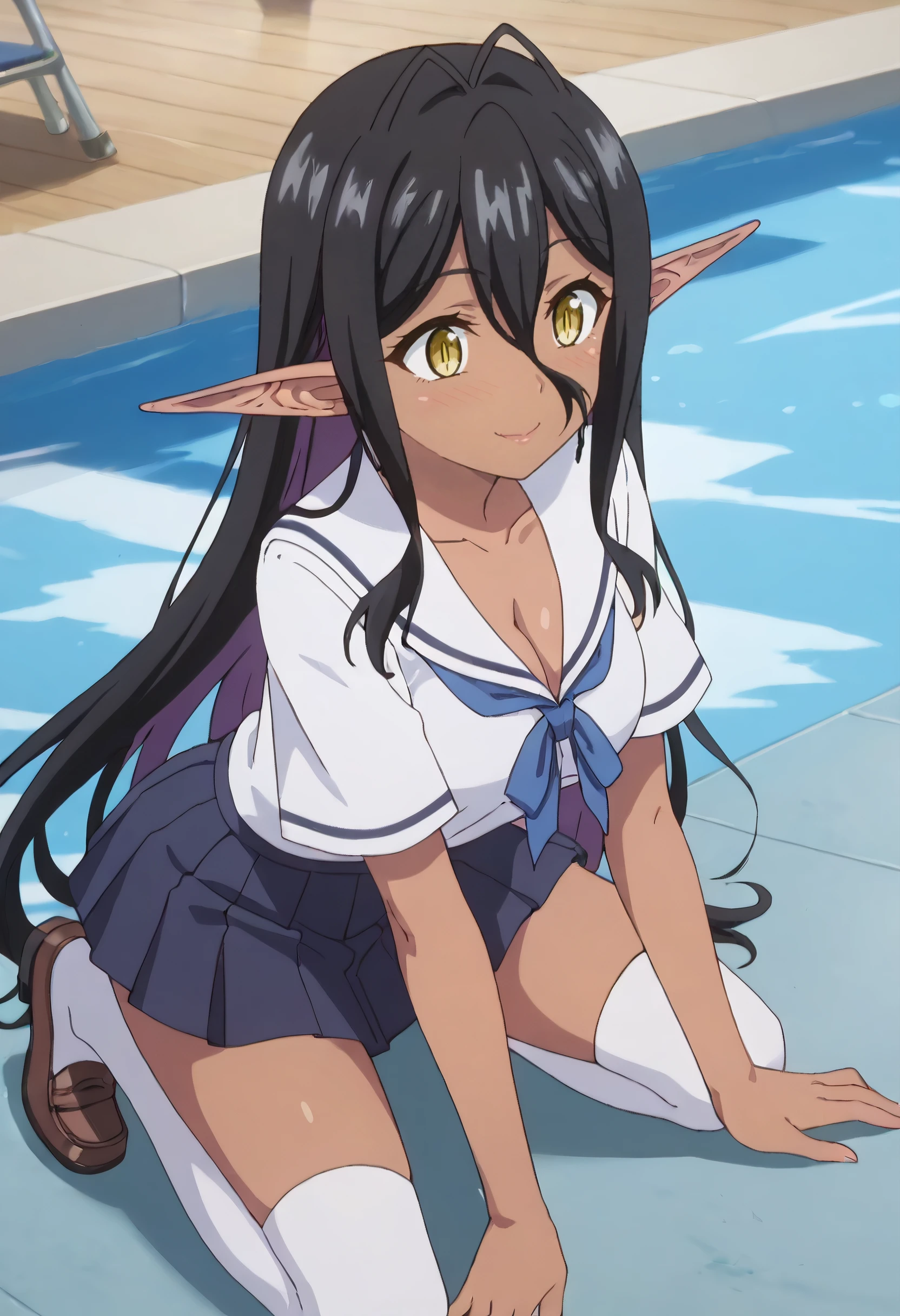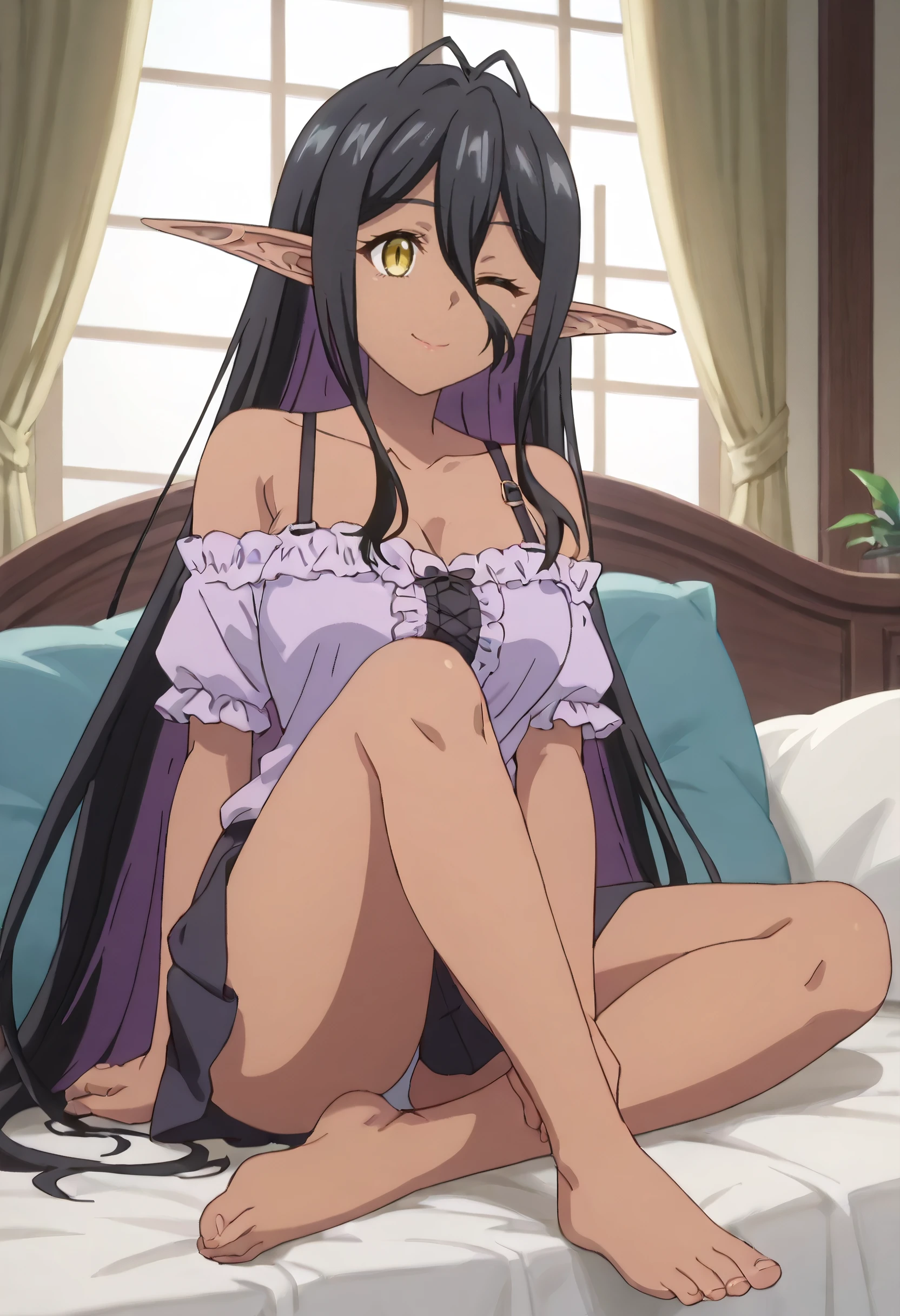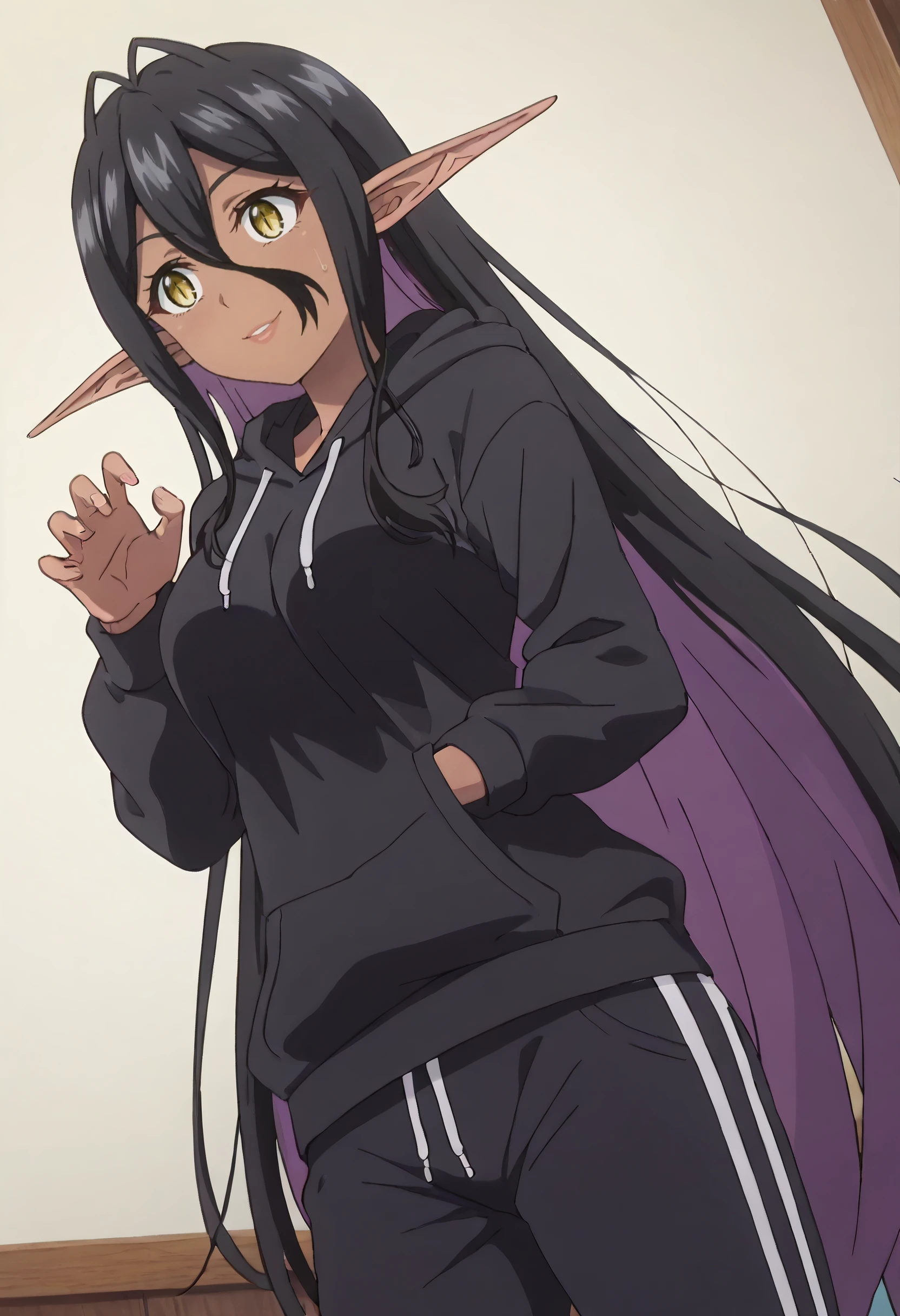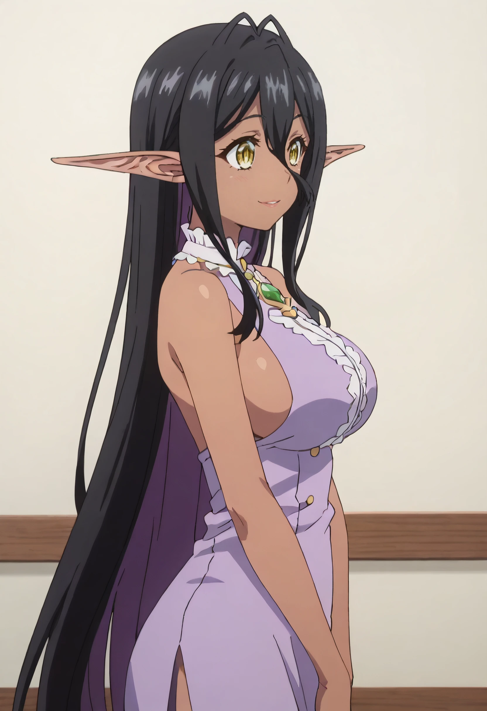 YDEMariabelle, elf, dark elf, dark skin, dark-skinned female, long hair, black hair, pointy ears, yellow eyes, hair between eyes, long pointy ears, very long hair,