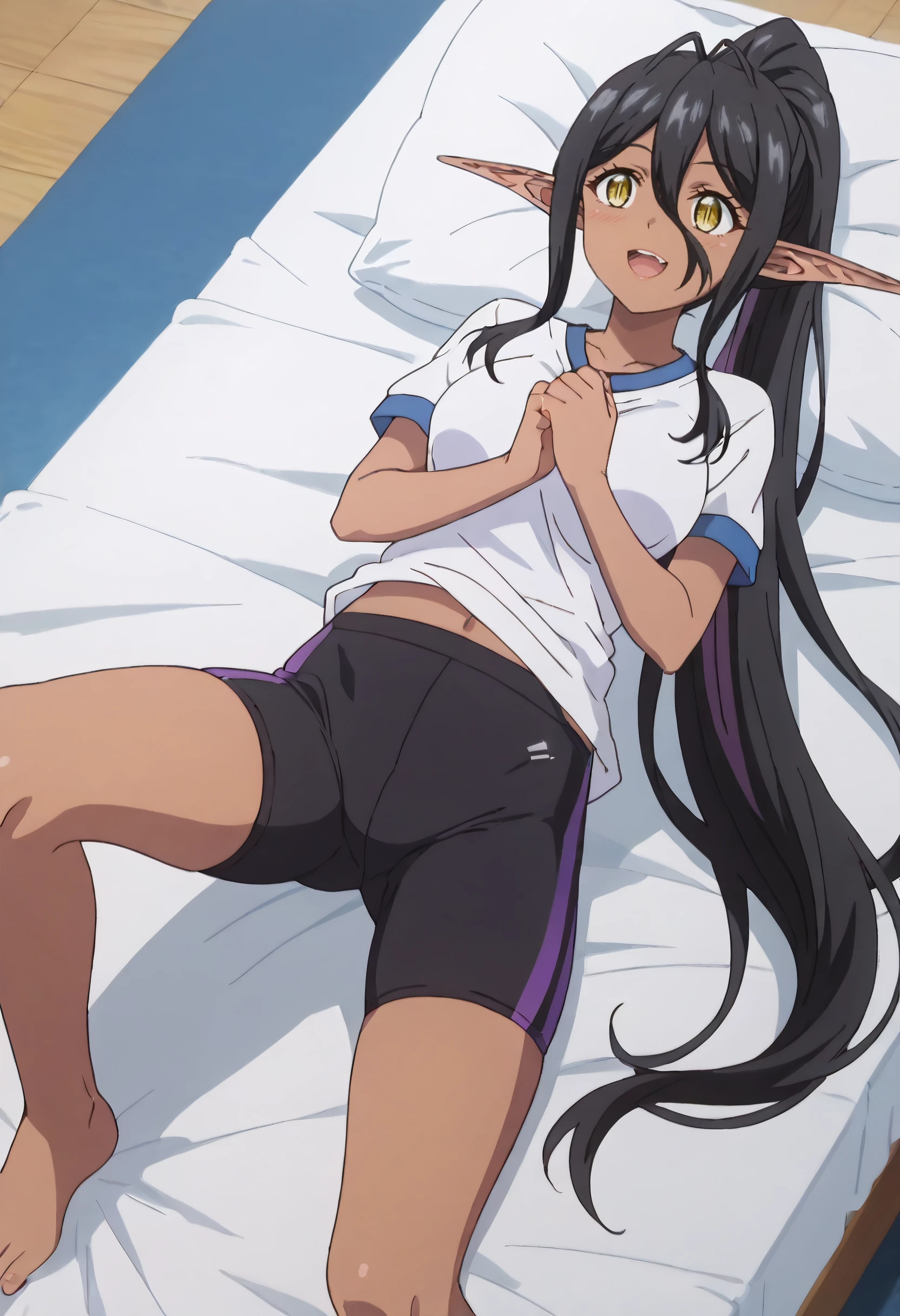 MariabelleSport, shirt, short sleeves, white shirt, bike shorts, shorts, ponytail, stretch, blue shorts,