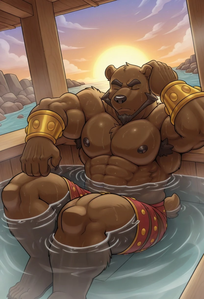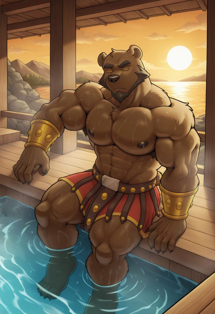 Reinforcement Prompts: "furry, bear boy, short tail, yellow eyes, muscular, masculine, mature male, bara, large pectorals"