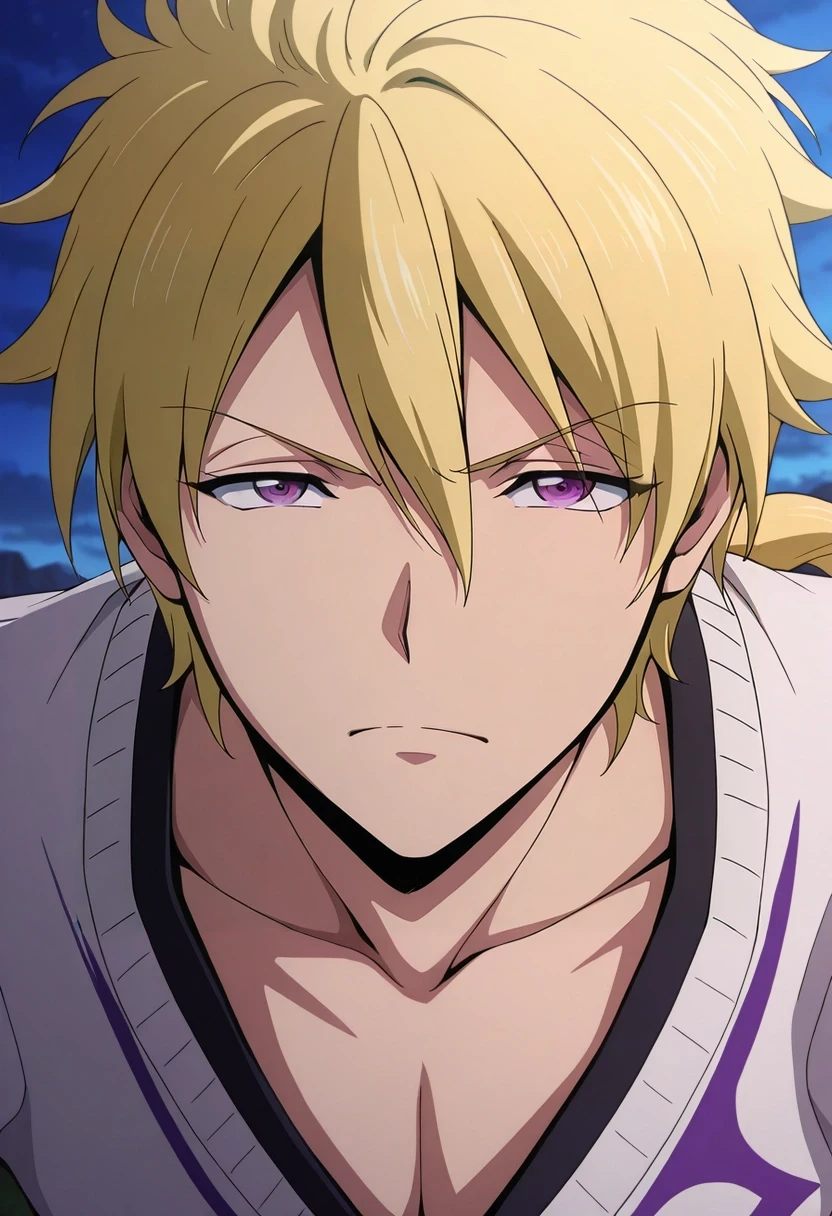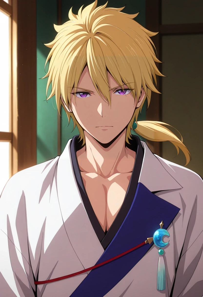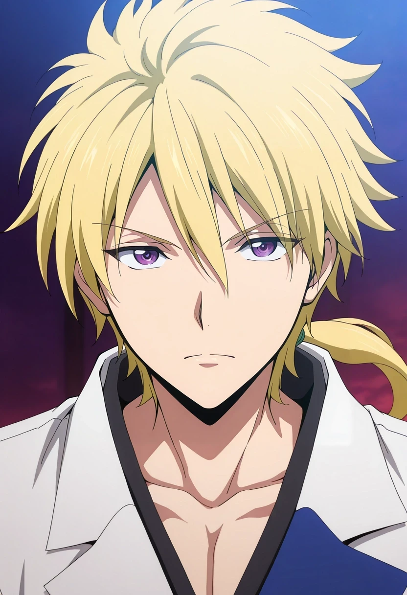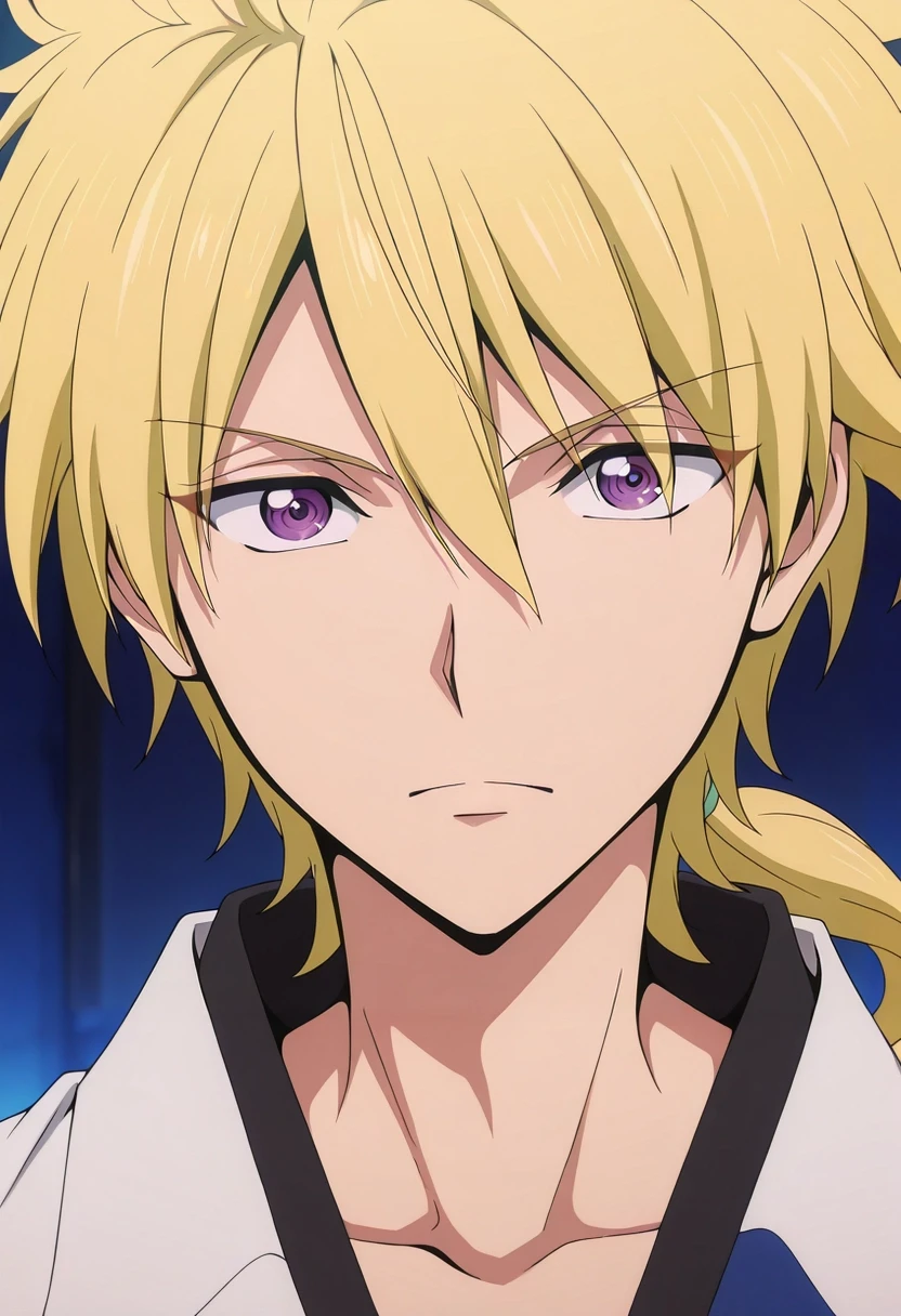 kojirou_kanemaki, blonde hair, purple eyes, long hair, ponytail, low ponytail, hair between eyes