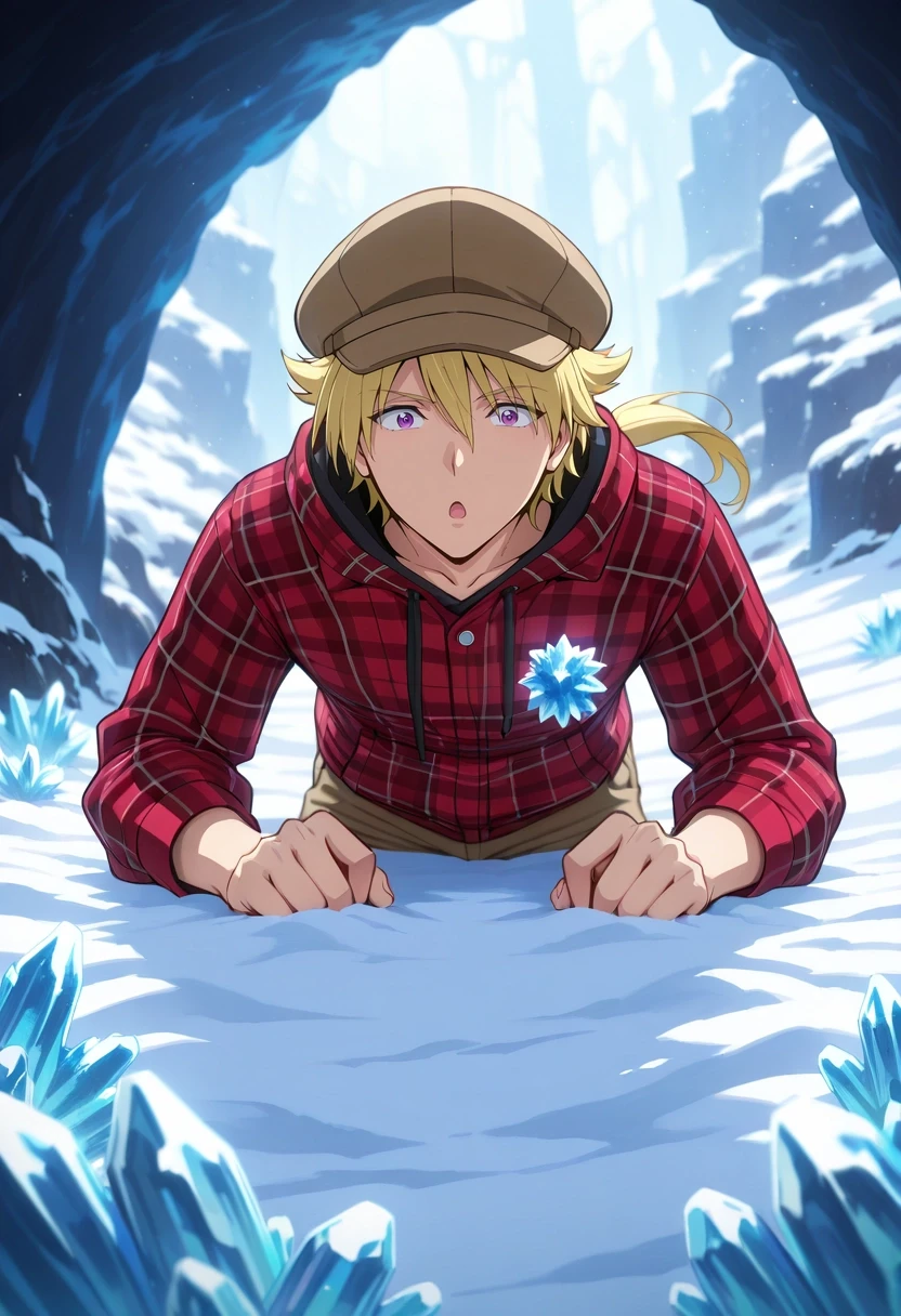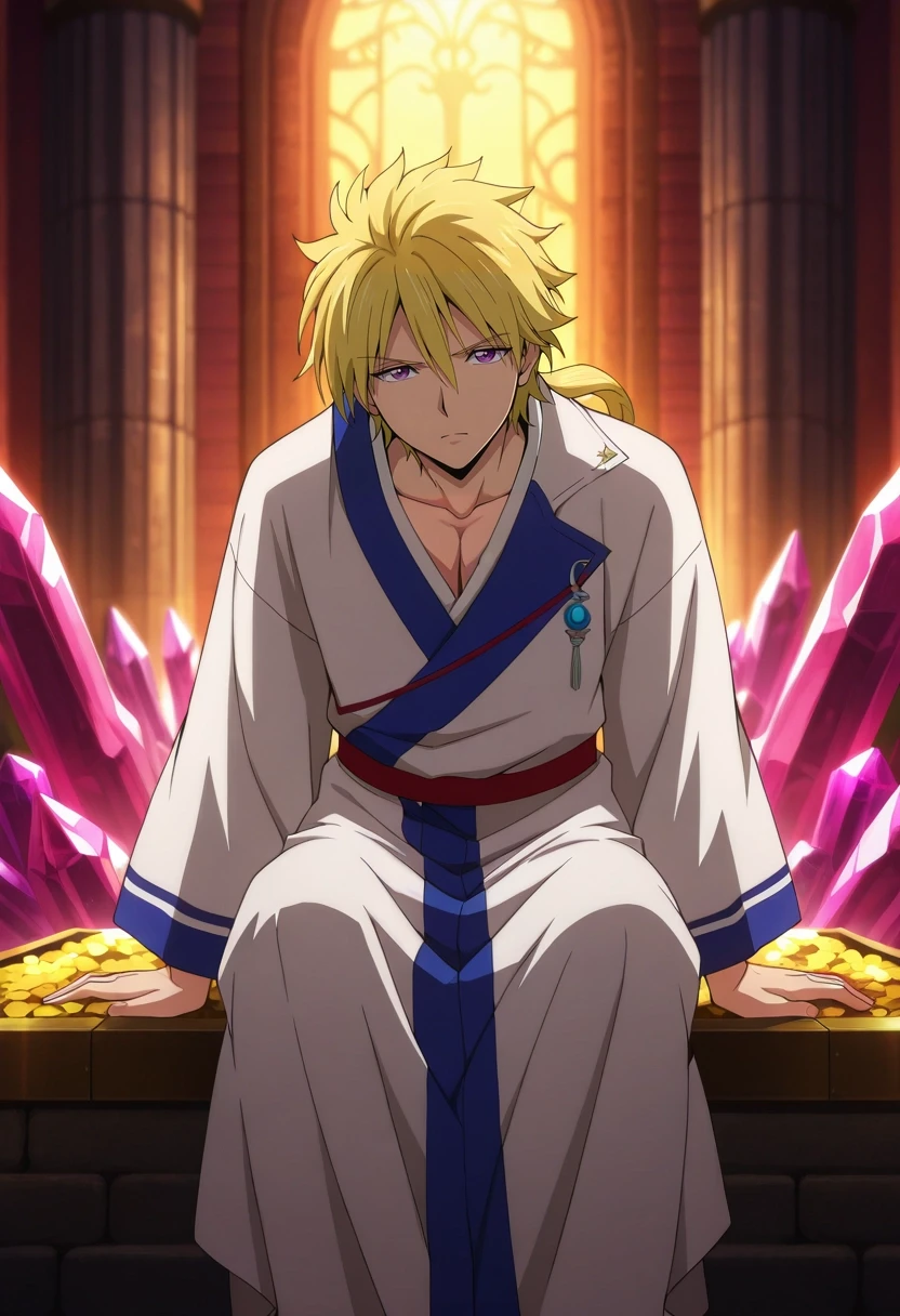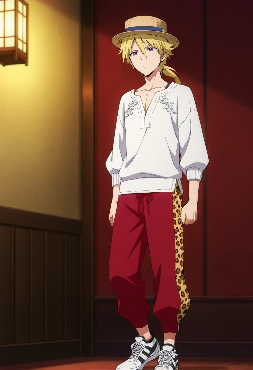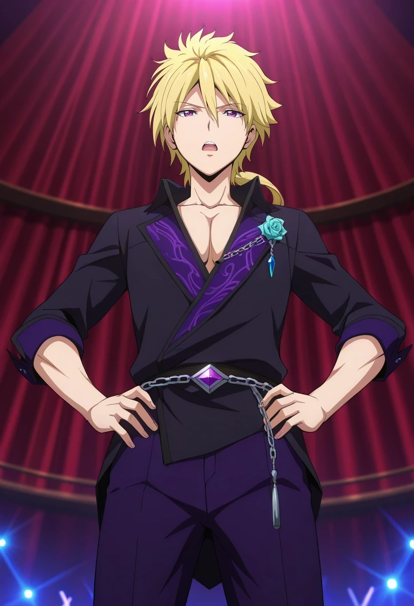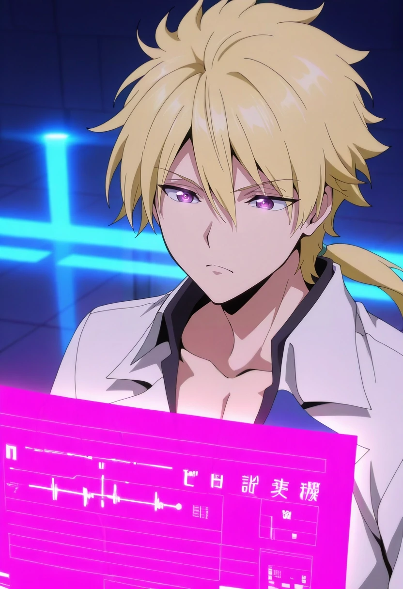 kojirou_kanemaki, blonde hair, purple eyes, long hair, ponytail, low ponytail, hair between eyes