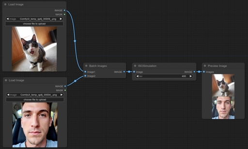 A fairly accurate simulation of digital camera operation from photons hitting the sensor to their conversion into a digital signal. I will not force you to calculate the parameters of a particular camera, so I took the average statistical ones: on average 500 photons hit a pixel, native ISO is 400, and each ISO step changes the gain by 6 decibels. I remind you that ISO is not a tool for changing exposure: all other things being equal (and this node does not take aperture and exposure time into account), ISO 100 and ISO 1600 will look almost the same.