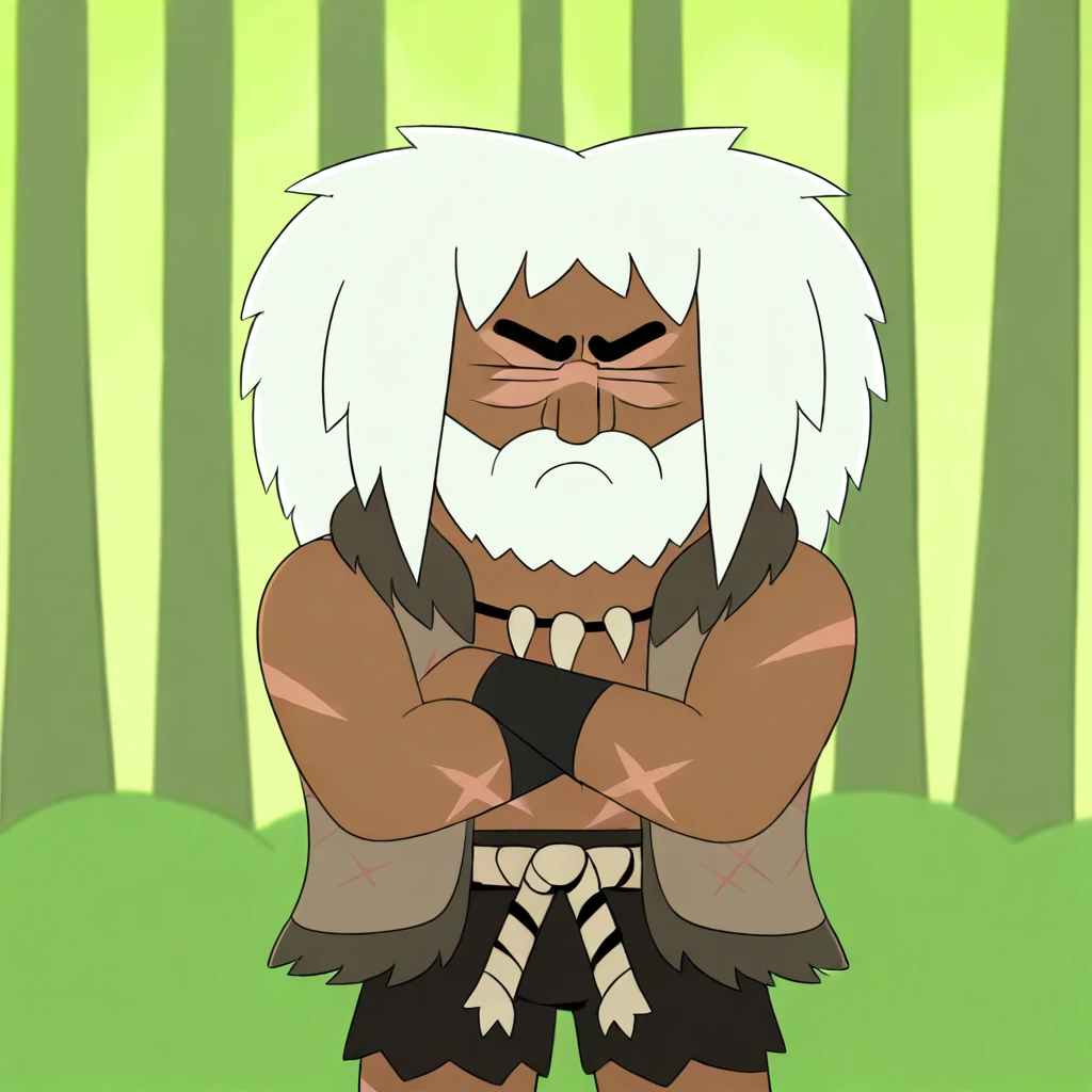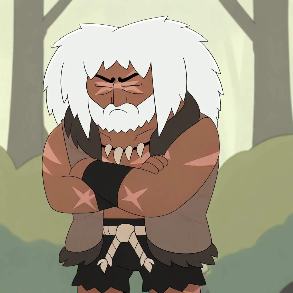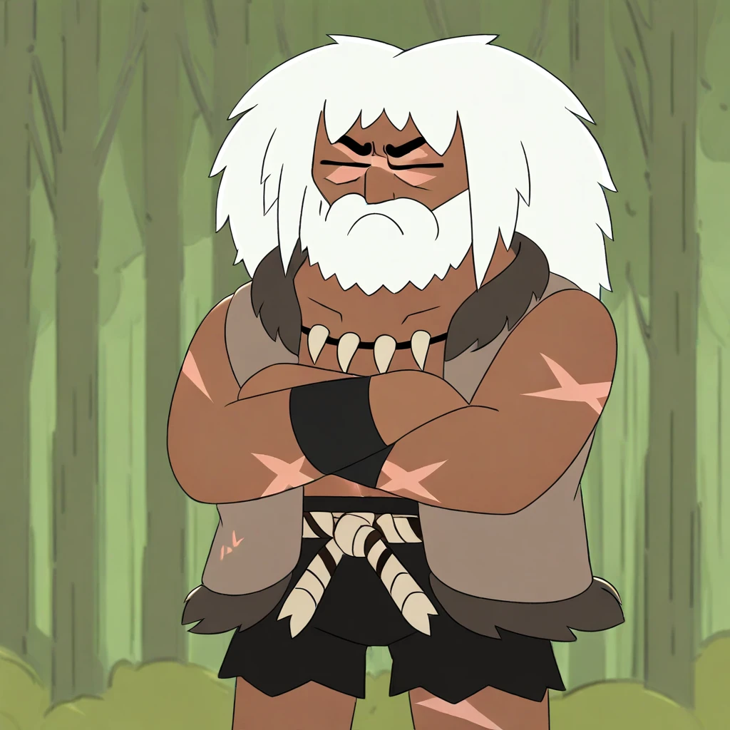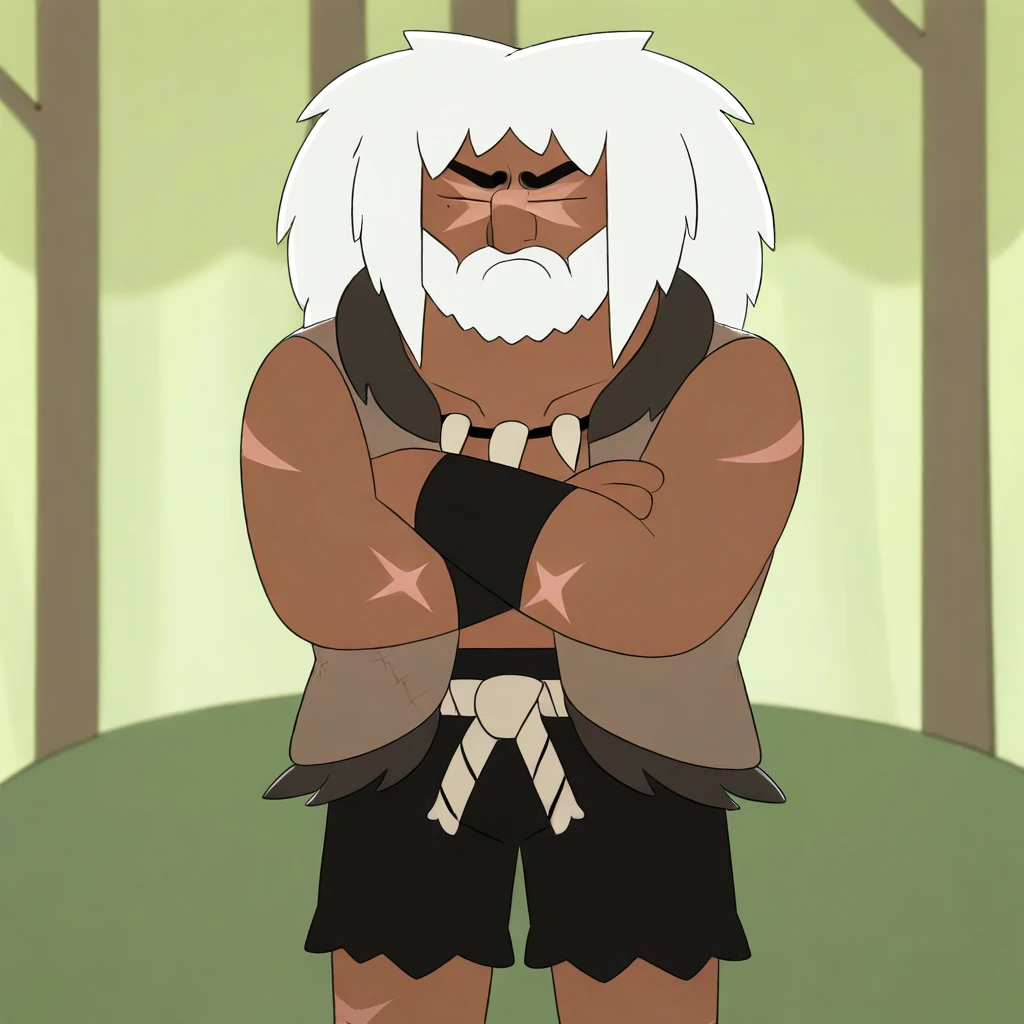 moro, brown skin, scars, closed eyes, white hair, white beard, closed eyes, tooth necklace, fur coat vest, black wristbands, rope belt, black worn shorts, barefoot