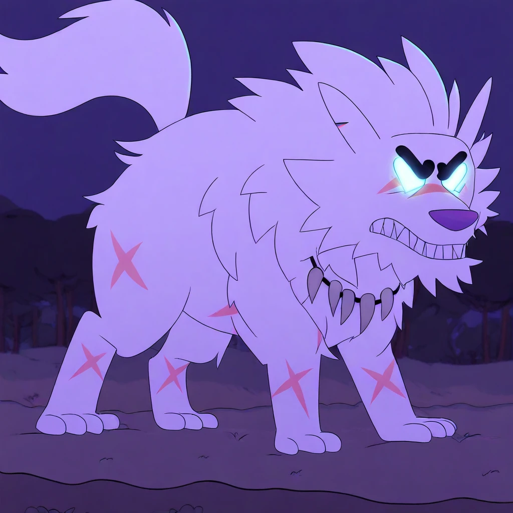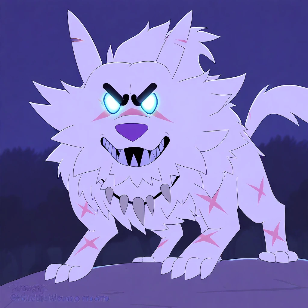 fullwolfmoro, feral form, white fur, glowing light blue eyes, purple nose, scars, tooth necklace, tail