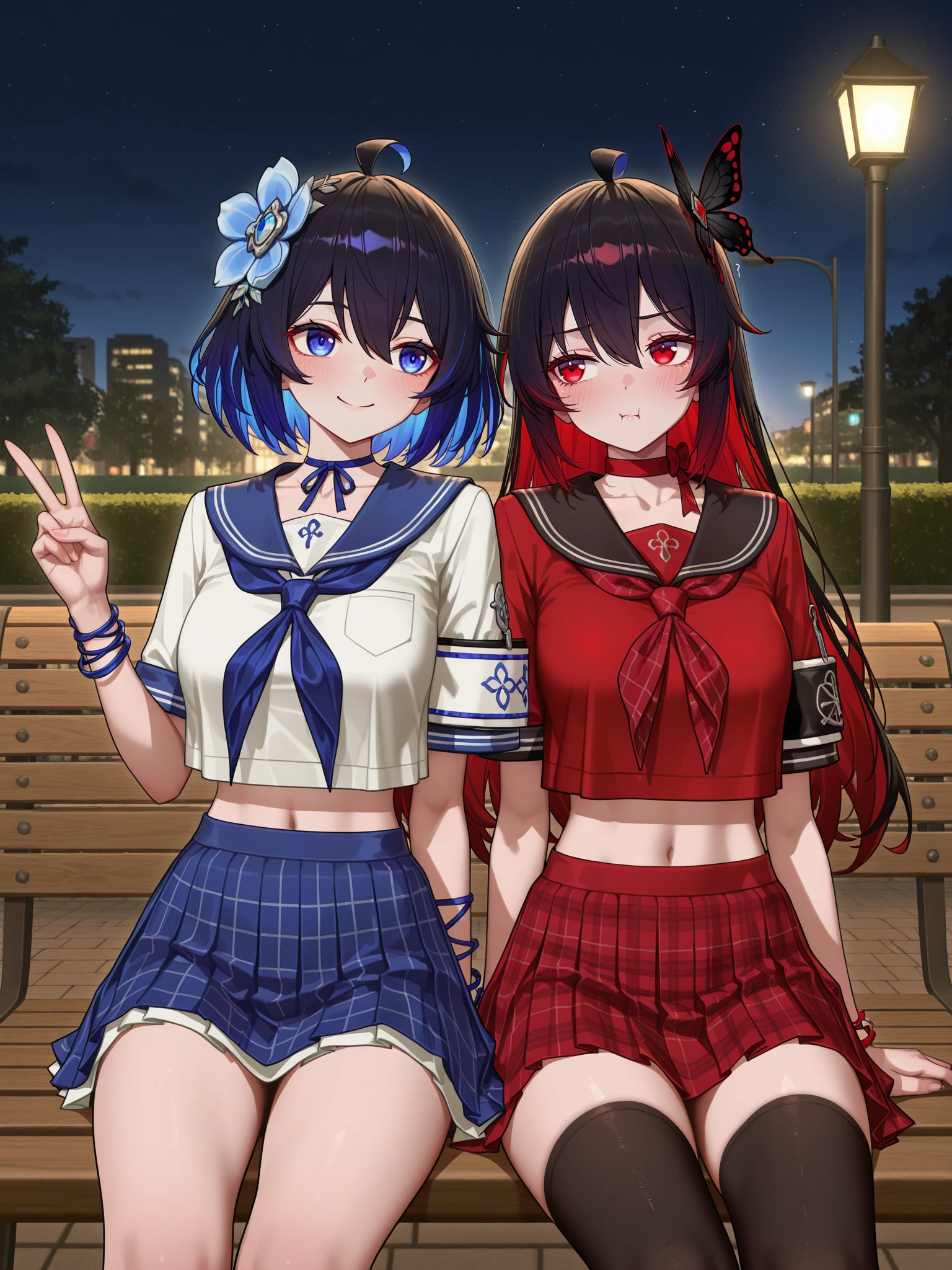 Trigger: bnsSchDays, serafuku, miniskirt, school uniform, pleated skirt, crop top, crop top overhang, midriff, navel, sailor collar, neckerchief, short sleeves, zettai ryouiki, plaid, plaid skirt, red skirt, red serafuku, black thighighs, black armband, bracelet, red neckerchief, plaid_neckerchief