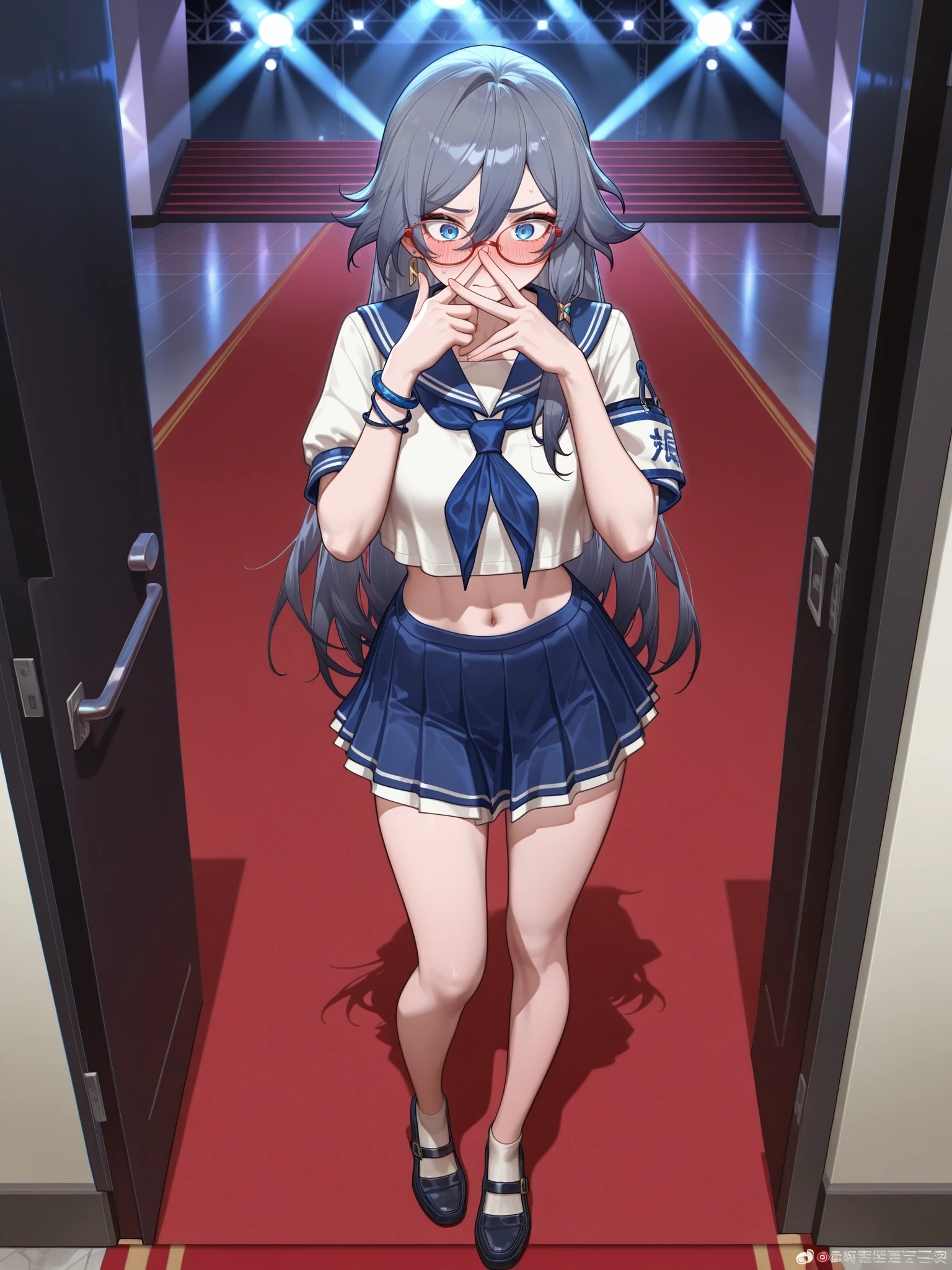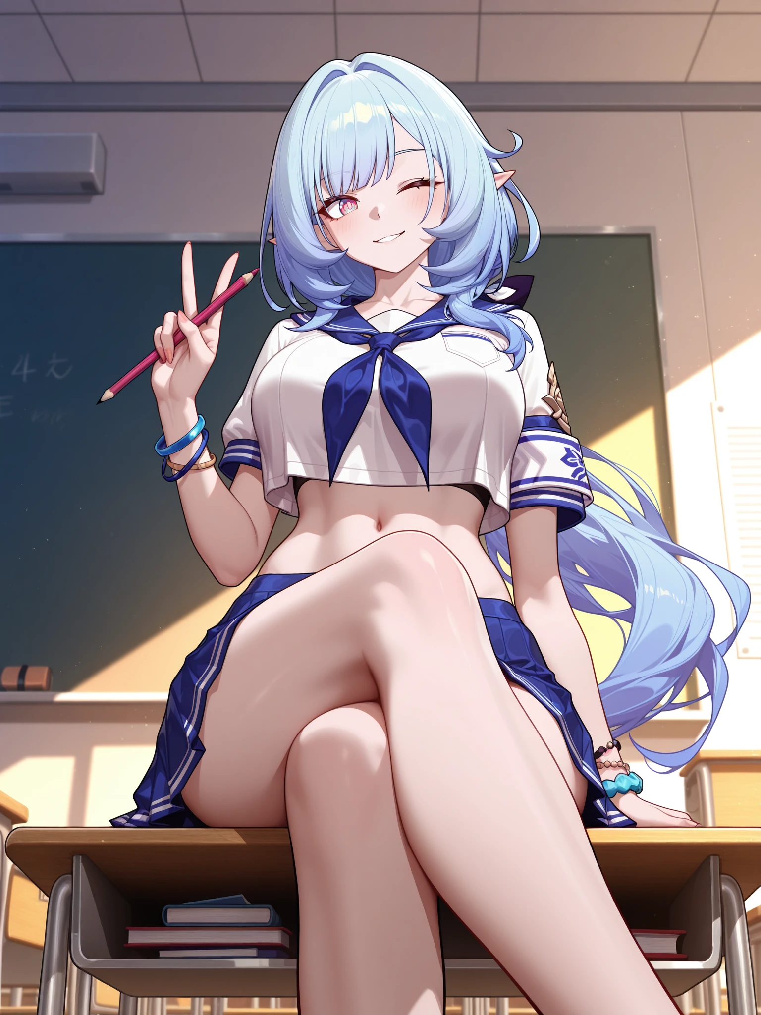 bnsSchDays2, serafuku, miniskirt, school uniform, pleated skirt, crop top, crop top overhang, midriff, navel, sailor collar, , short sleeves, blue skirt, white serafuku, white armband, blue bracelet,