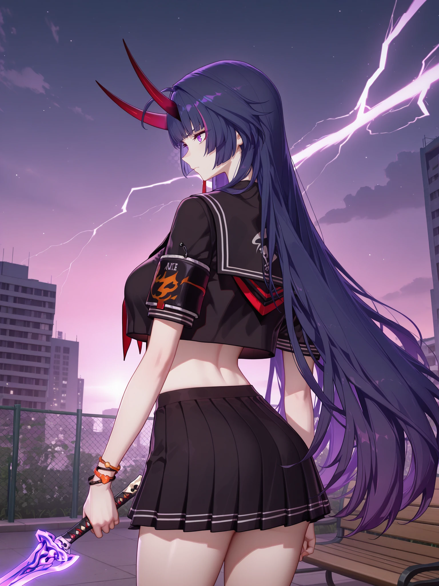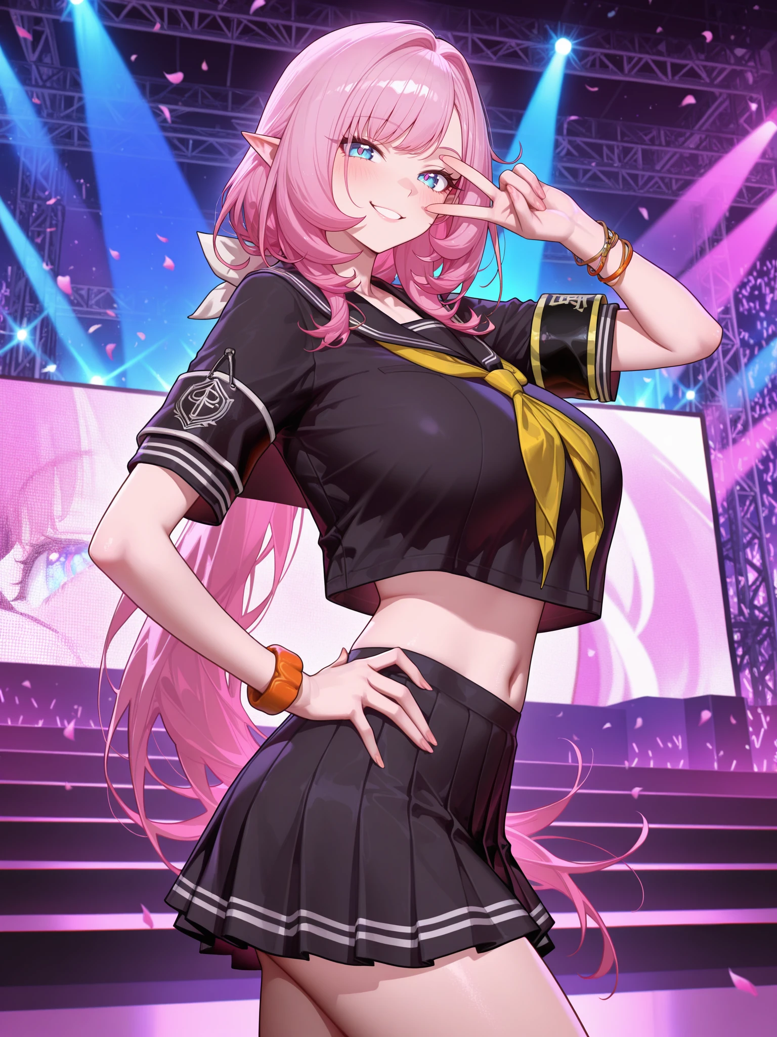 bnsSchDays3, serafuku, miniskirt, school uniform, pleated skirt, crop top, crop top overhang, midriff, navel, sailor collar, neckerchief, short sleeves, black skirt, black serafuku, black armband, orange bracelet, yellow neckerchief,