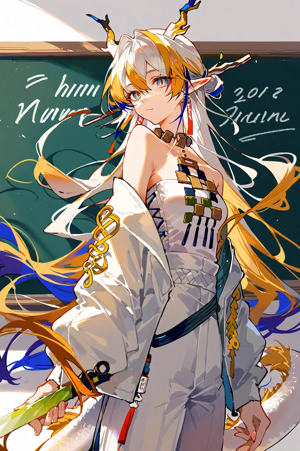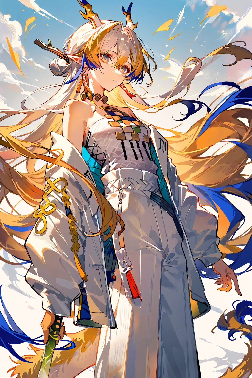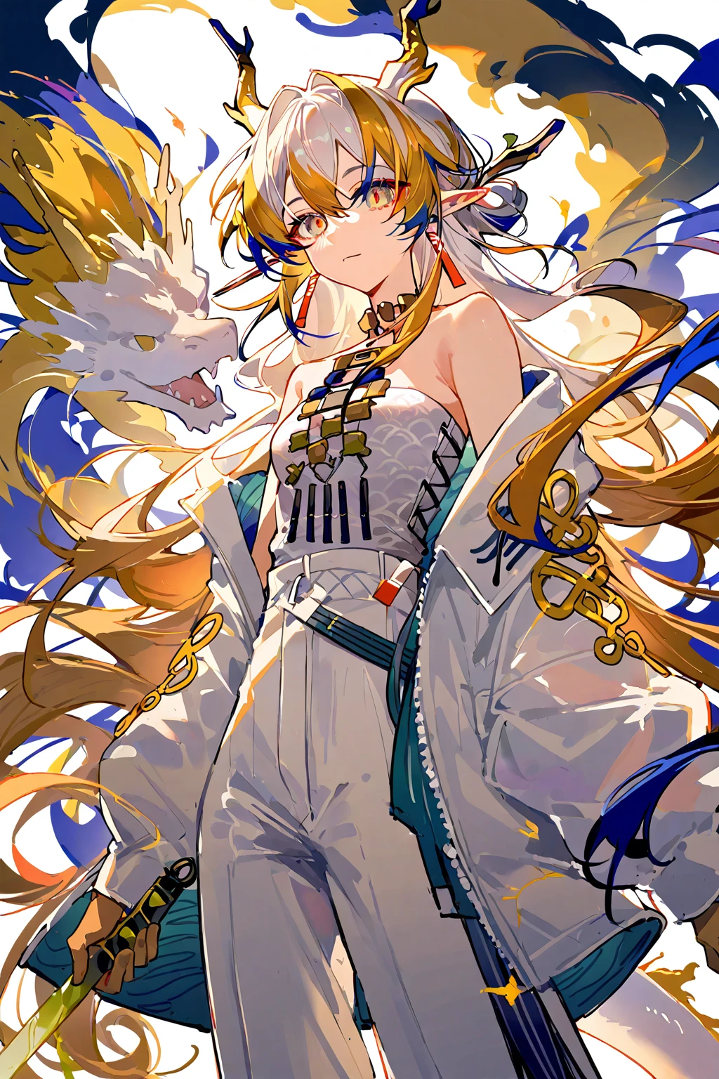 strapless, shirt, strapless shirt, white jacket, open jacket, bare shoulders, off shoulder, white pants, open clothes, long sleeves, dragon tail,黍的大蒜 玉琮(Shu's weapon / Jade cong tube):