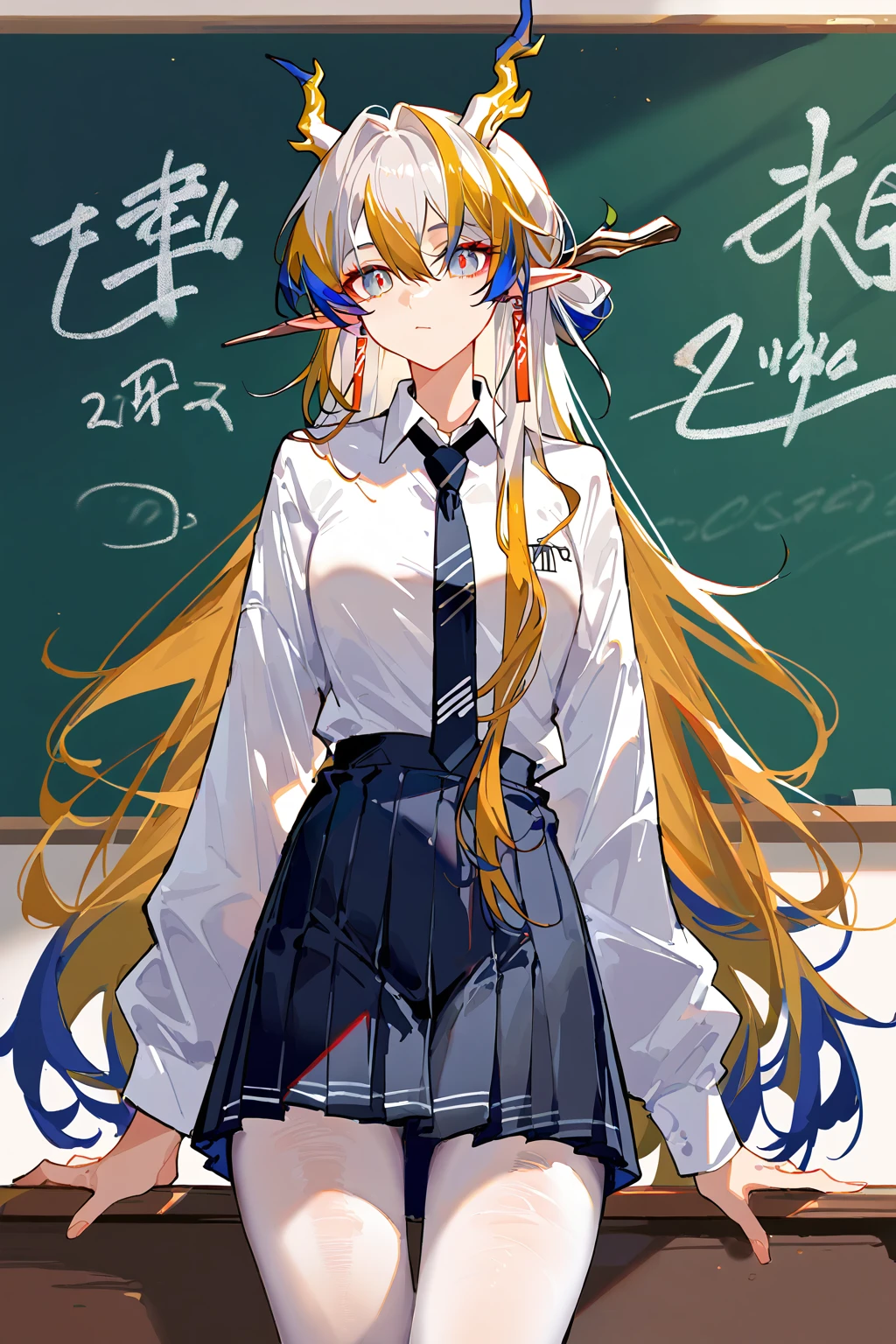 shu \(arknights\), multicolored hair, hair intakes, hair between eyes, dragon horns, pointy ears, hair stick, beads, jewelry, earrings, tassel, tassel earrings, very long hair,衣著(outfit):