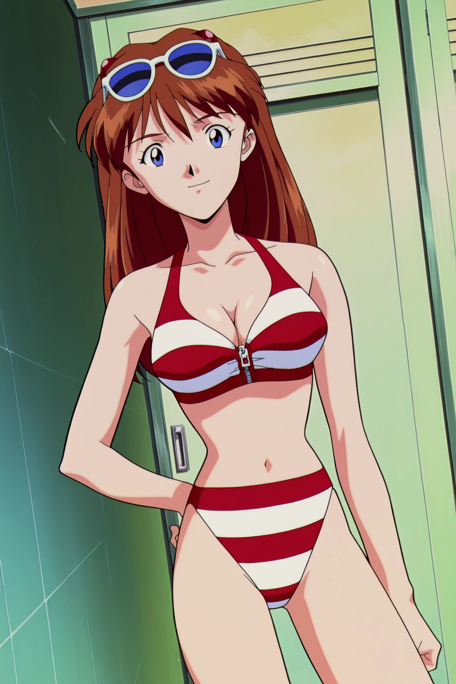 &suk&sw1msu1t, swimsuit, red and white striped bikini, sunglasses, eyewear on head, breasts, zipper, cleavage