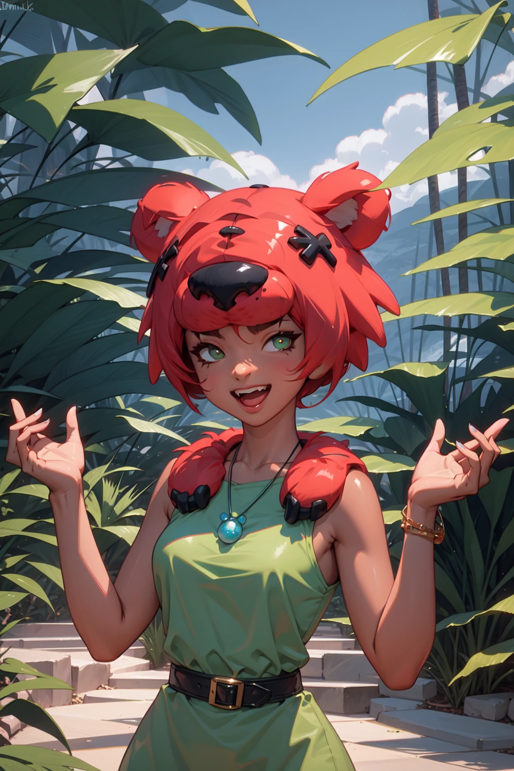 nitaBS, 1girl, bear girl, red hair, short hair, hair ornament, bear ears, no pupils, shaded face, dark skin, dark-skinned female, necklace, green dress, belt, capri pants, brown pants, barefoot