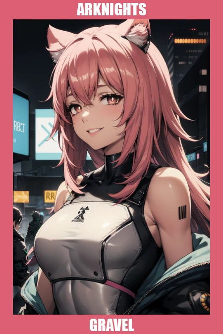 Character: gravel (arknights), fanart, pink hair, brown eyes, very long hair, prarie dog girl, animal ear fluff, large breasts, hair ornament