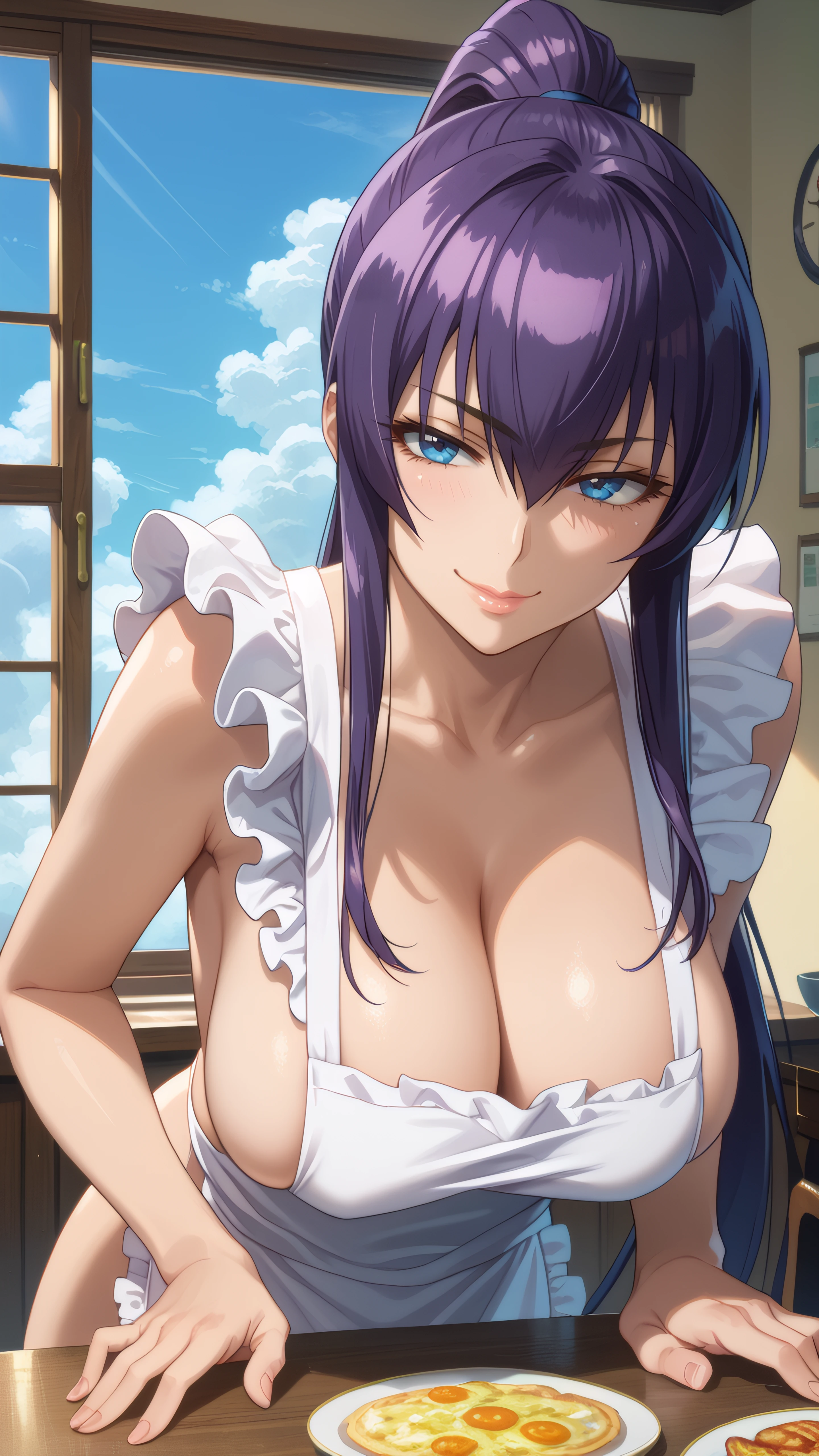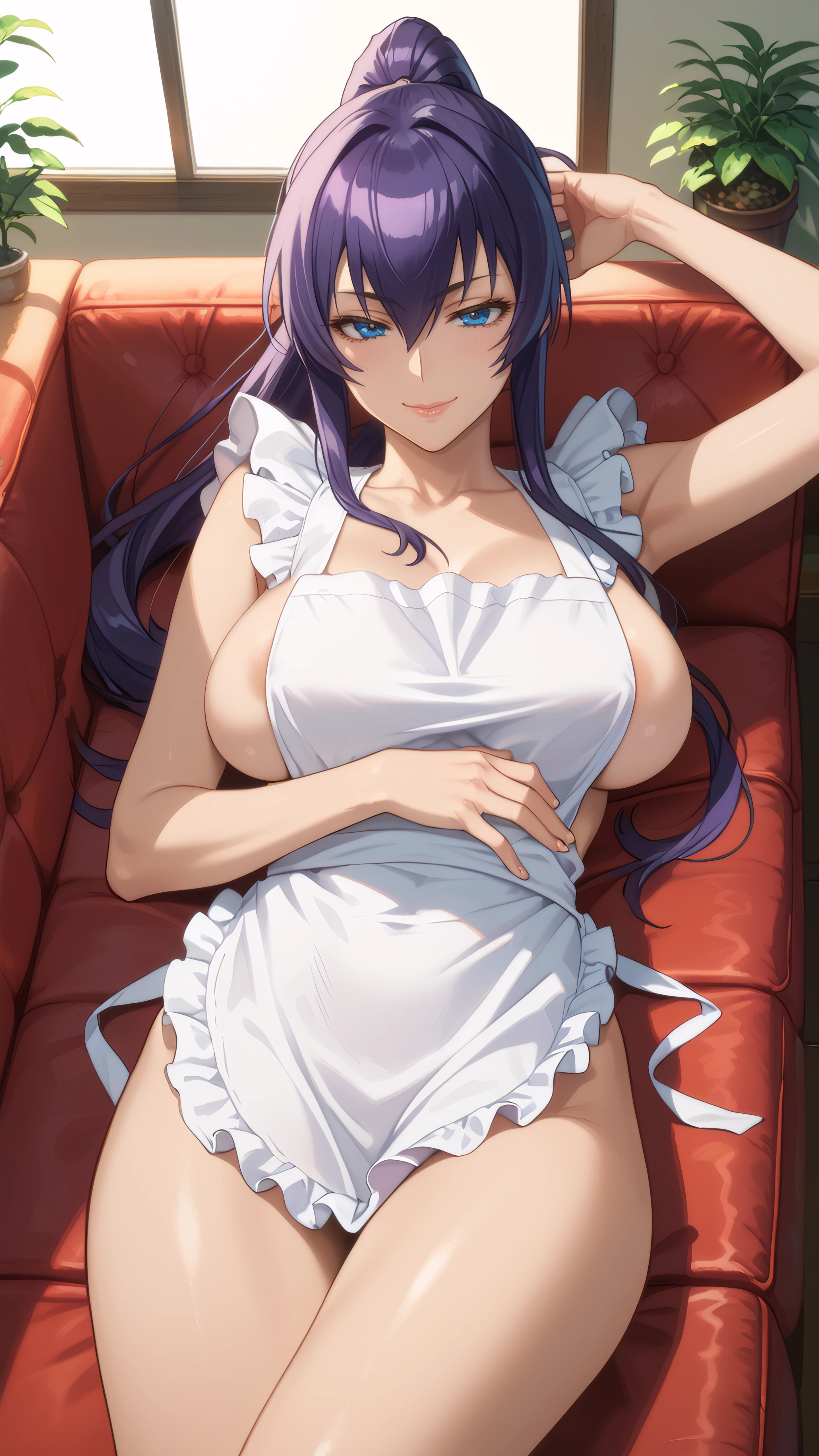 saeko_busujima, purple hair, blue eyes, long hair, high ponytail, hair between eyes, naked apron, frilled apron,