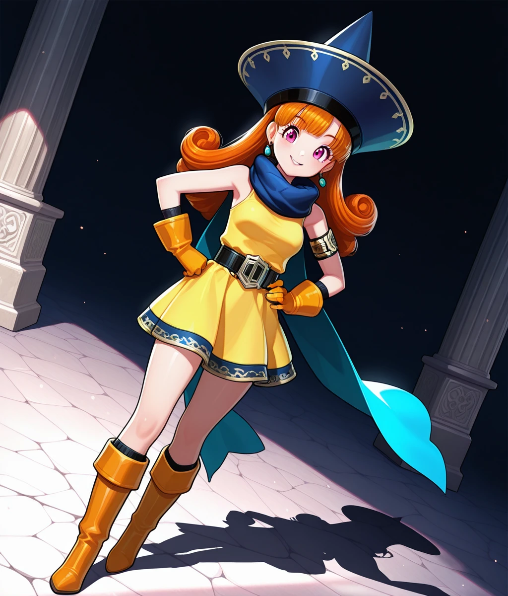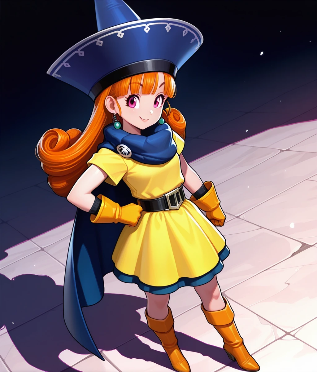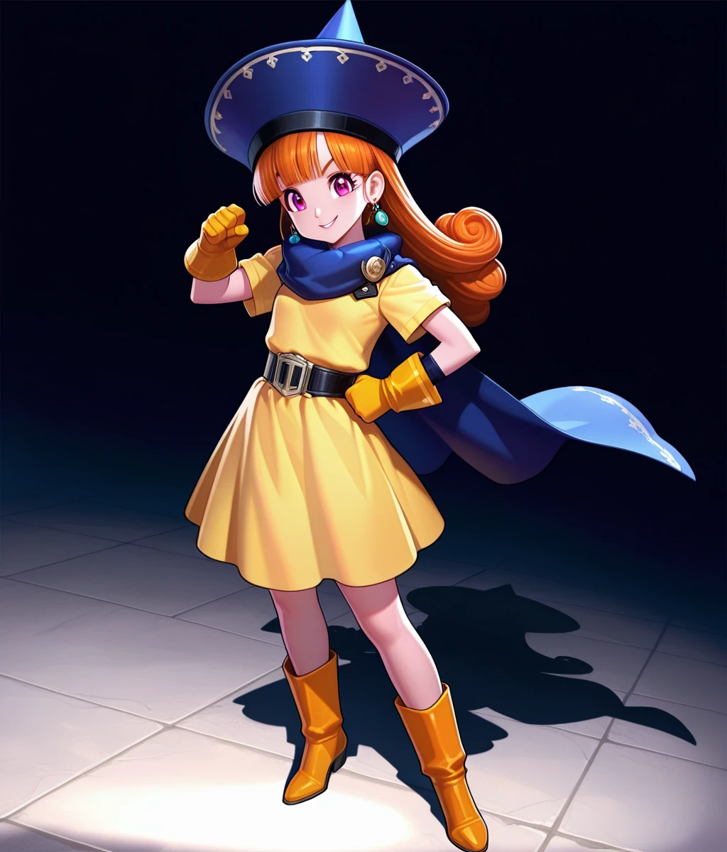blue hat, jewelry, earrings, yellow dress, blue cape, short dress, orange knee boots, sleeveless, belt, blue scarf, bare shoulders