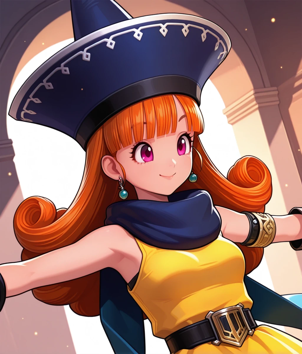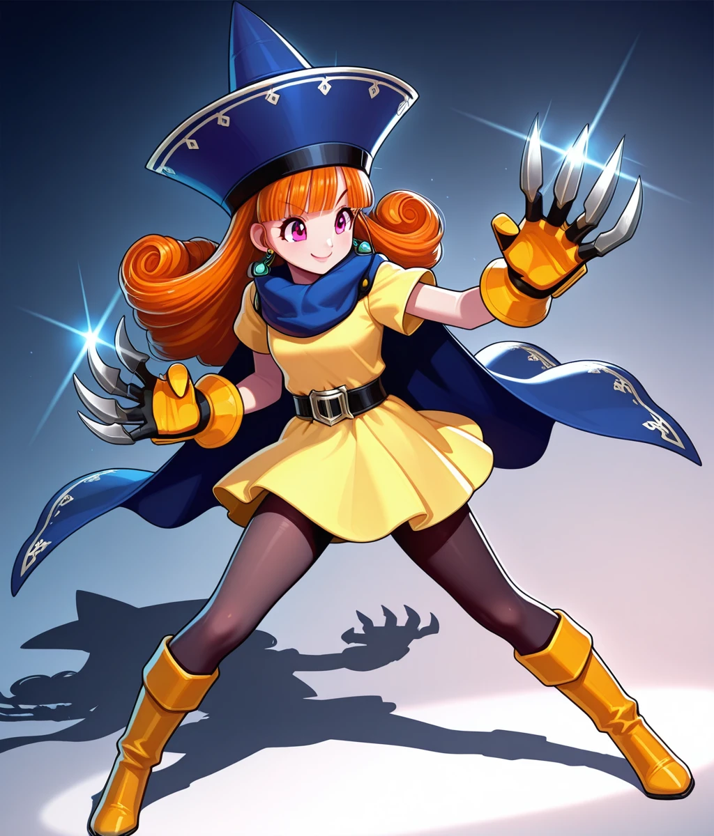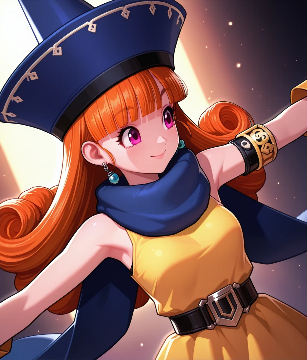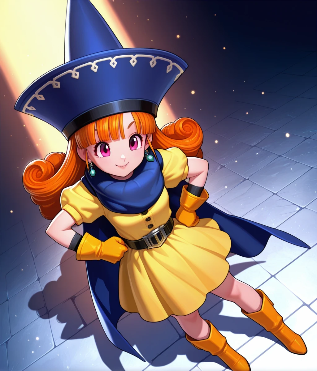blue hat, jewelry, earrings, yellow dress, blue cape, short dress, orange knee boots, sleeveless, belt, blue scarf, bare shoulders