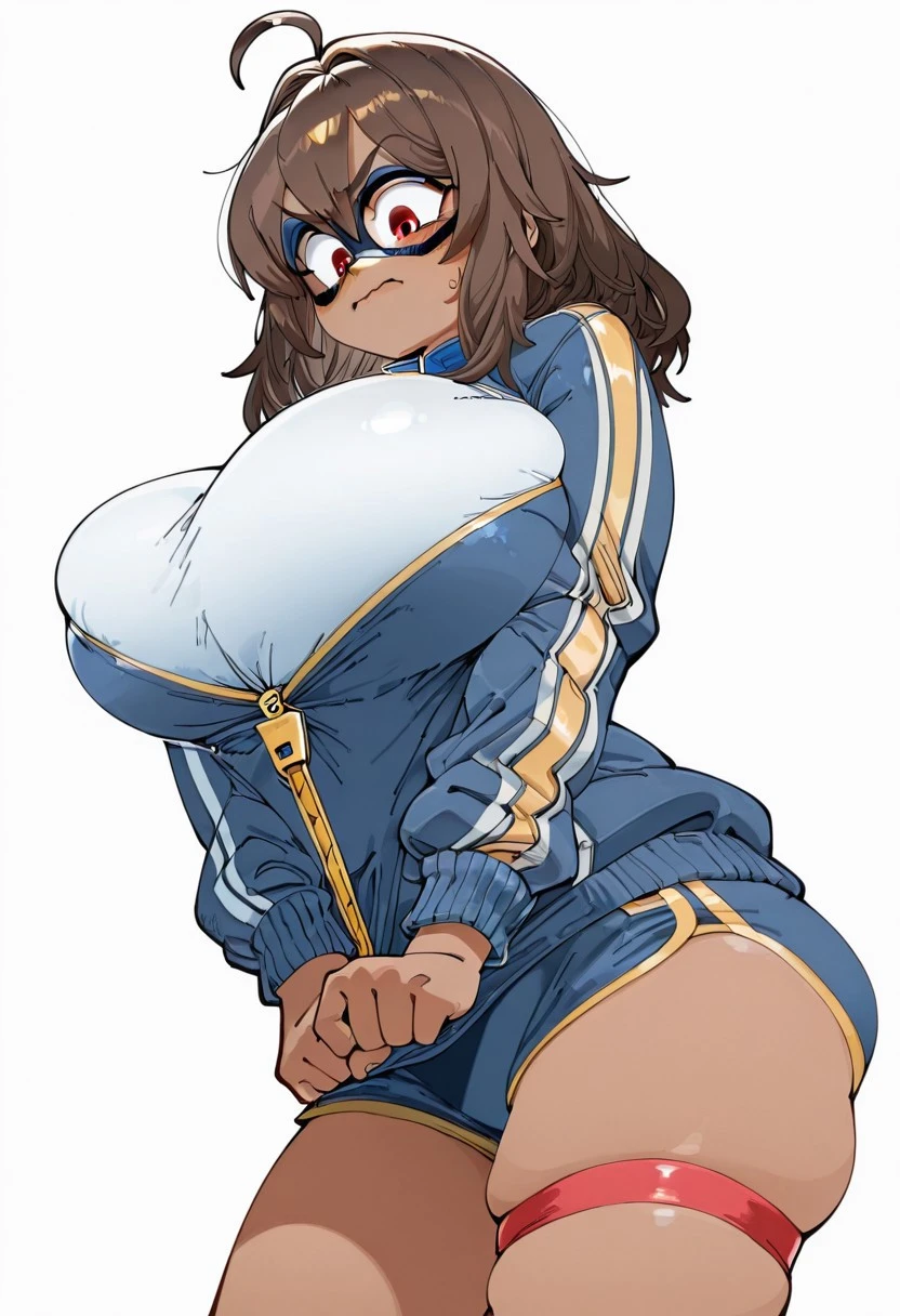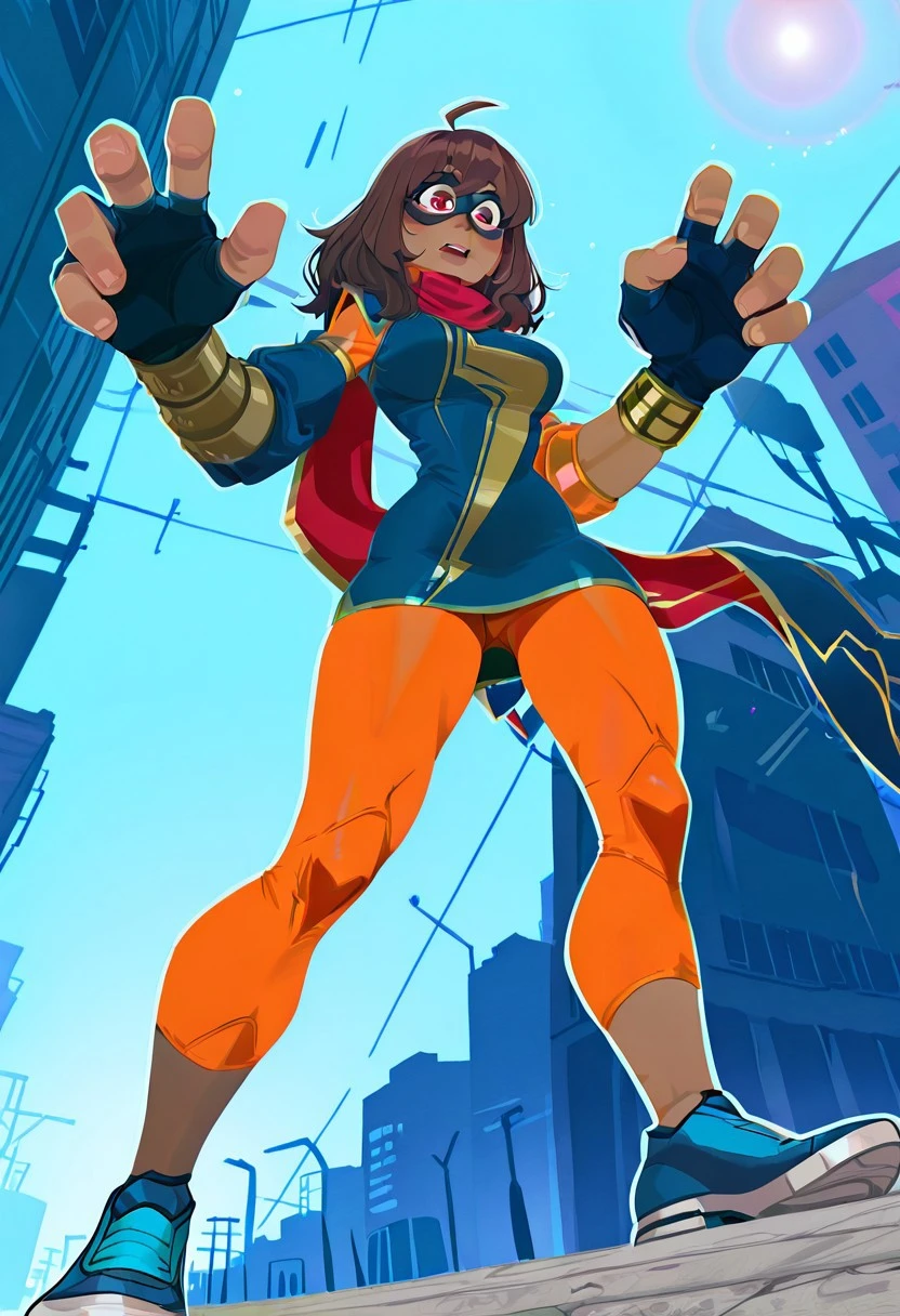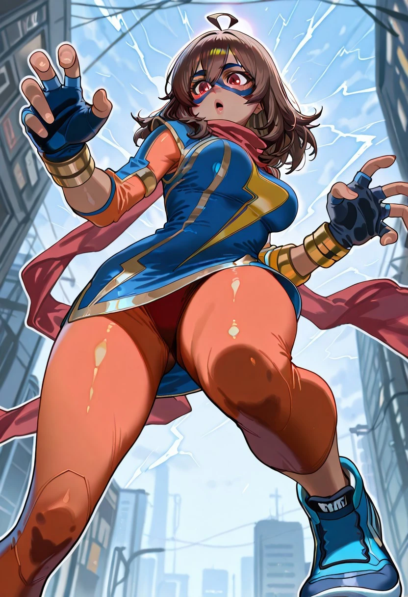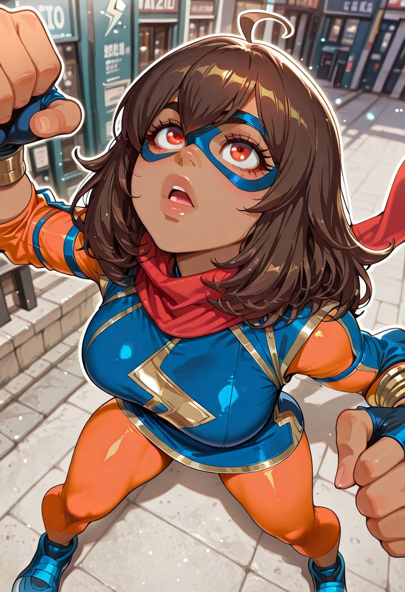1girl, kamala_marvelt0k0n, dark-skinned female, brown hair, medium hair, ahoge, red eyes, big eyes,