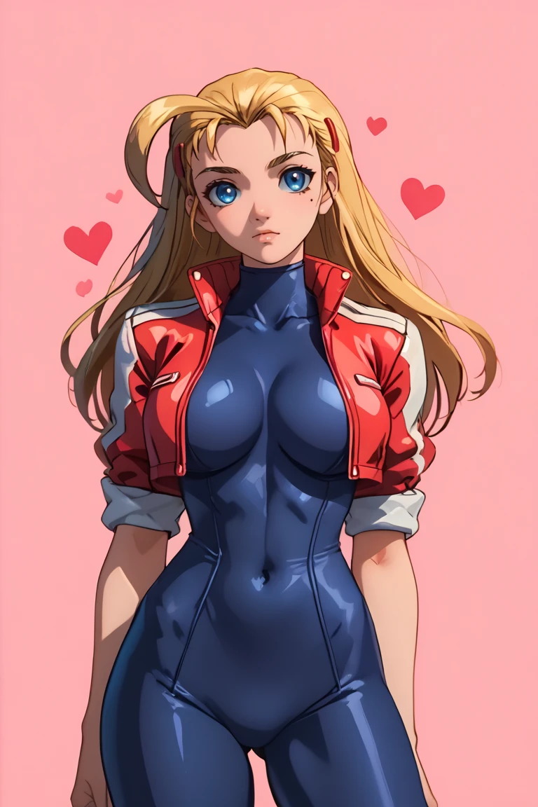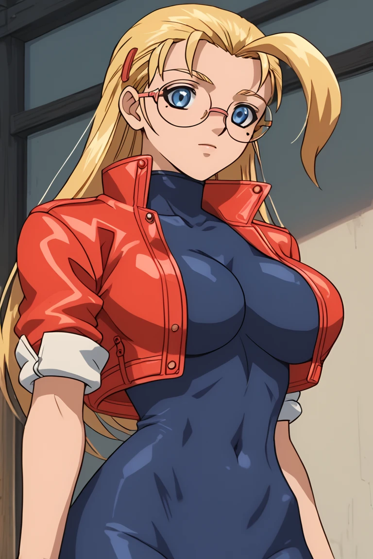 unitard, red jacket, cropped jacket, covered navel, turtleneck, skin tight, open jacket, open clothing, red rolled up sleeves