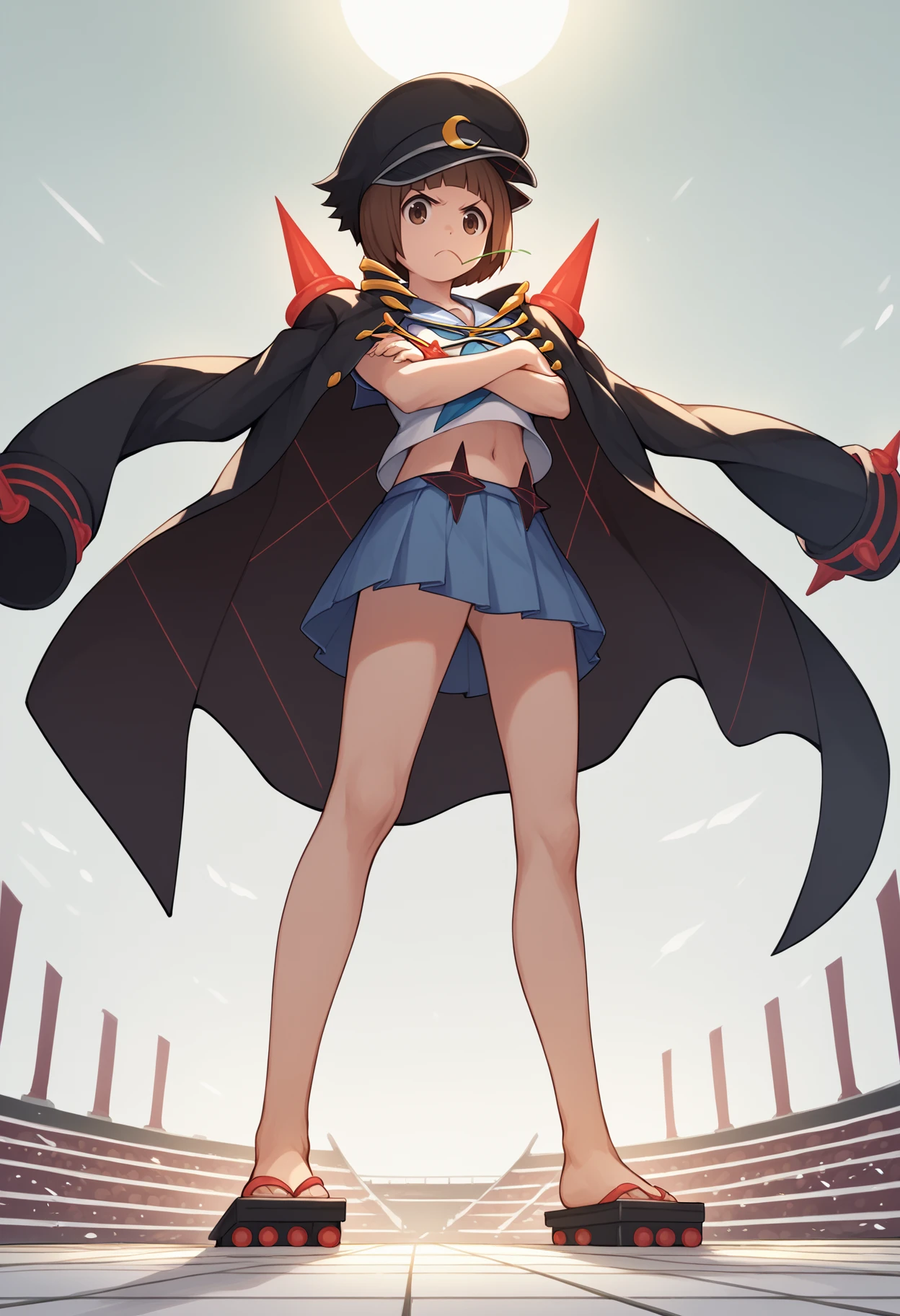 Outfit prompts : jacket on shoulders, jacket, spikes, school uniform, serafuku, crescent hat ornament, hat, geta, blue skirt, midriff, navel, mouth hold