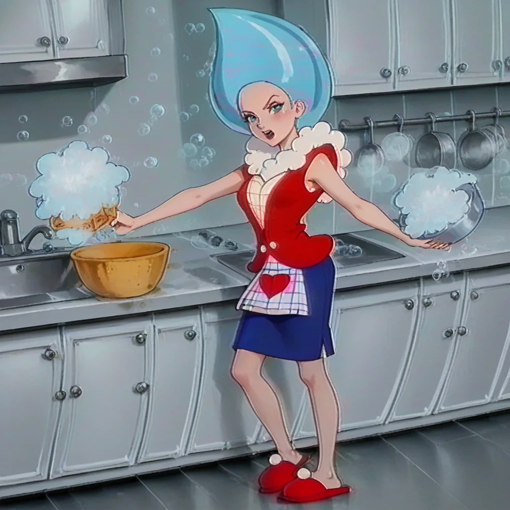 Триггеры: Drop Sorti, 1 girl, drop-shaped hair on the head, blue short dress, red vest, checkered apron, red slippers with a white ball, slim body, medium breasts, medium assМодель тренировалась на чекпоинте AutismMix SDXL.